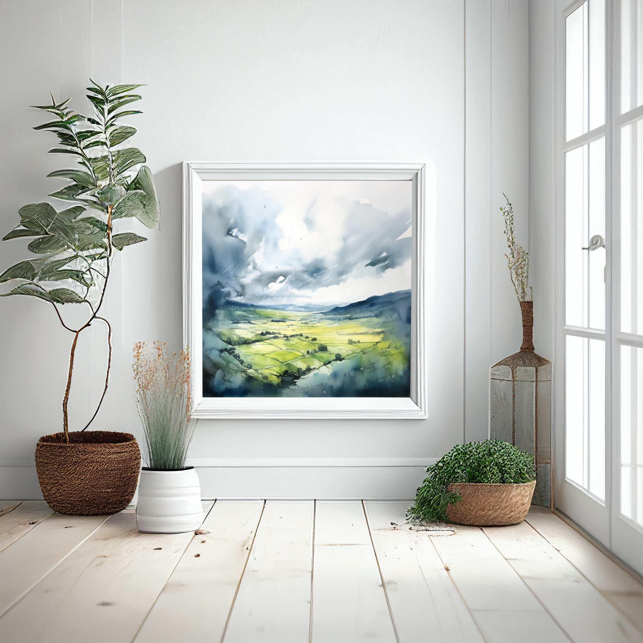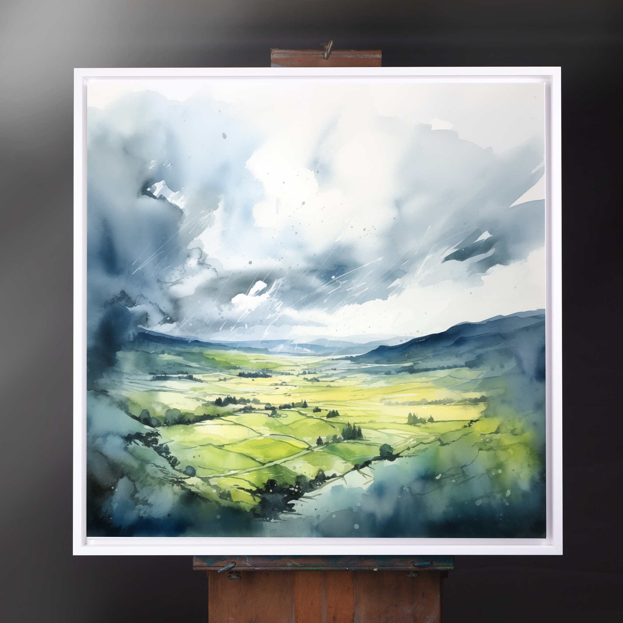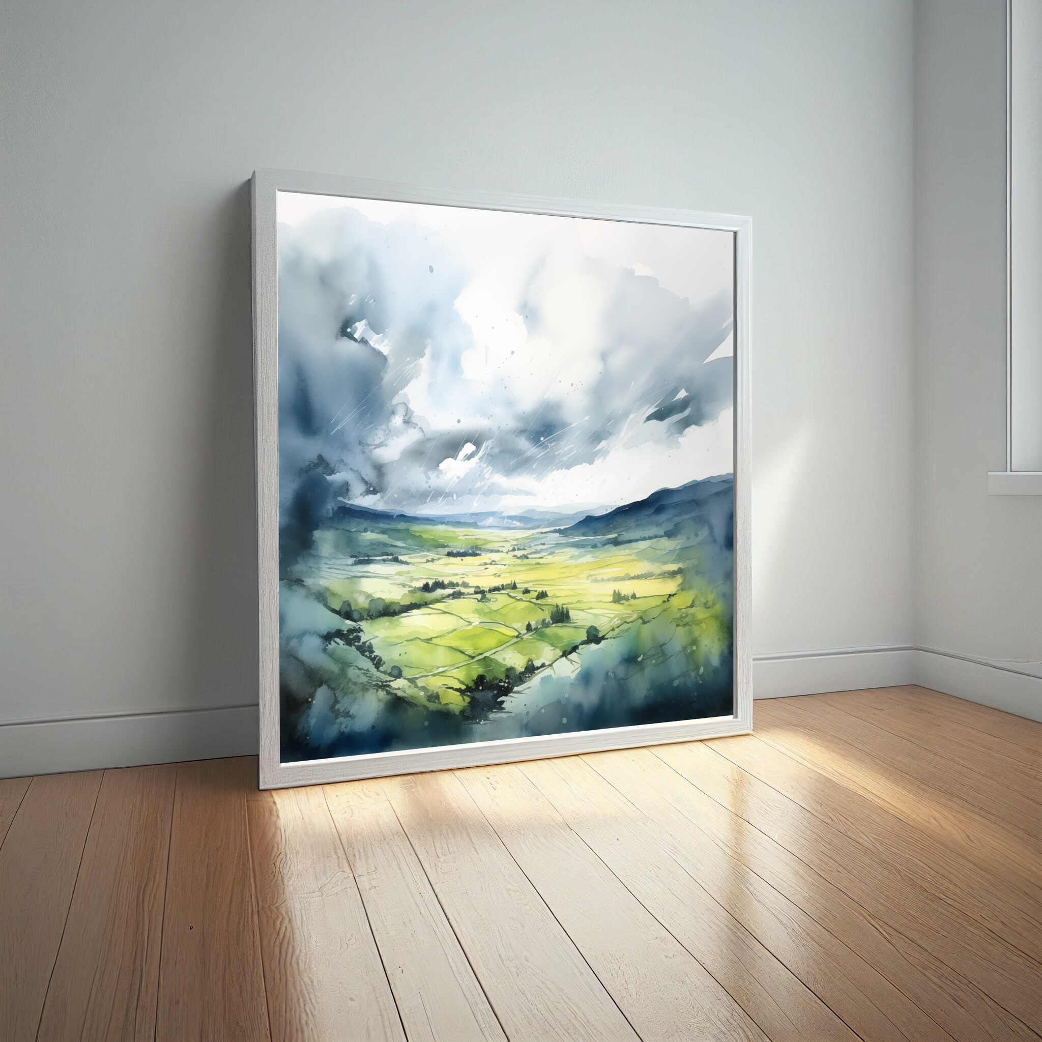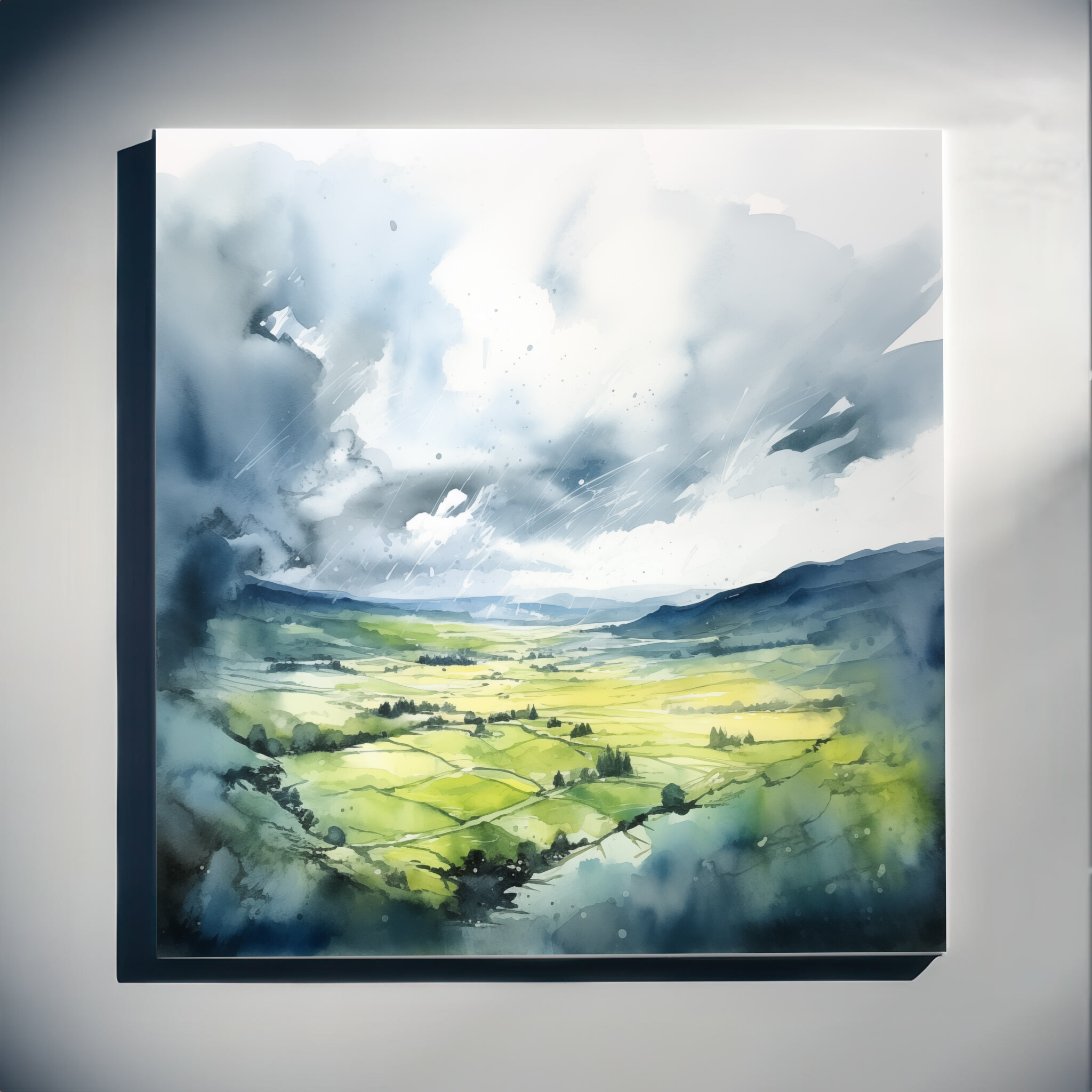 This beautiful watercolour artwork captures the serene landscape of Southdowns, highlighting the interplay of blue skies and green fields in an impressionist style. The gentle brushstrokes and soft transitions bring a sense of calm and tranquillity to the painting, making it a captivating focal point in any room.