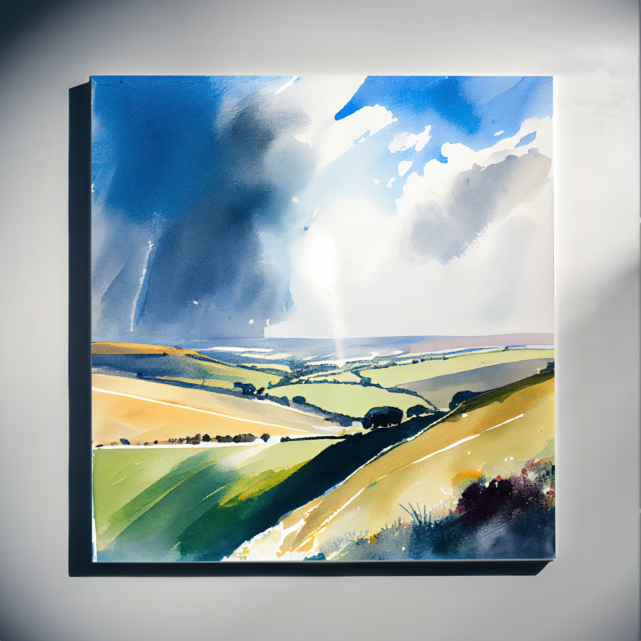 Experience the serene beauty of North Downs with this striking watercolor landscape. Dominated by calming blue skies and vibrant green tones, this modern artwork captures the essence of the North Downs. Its sweeping fields and dynamic clouds are brought to life in a captivating modern style.