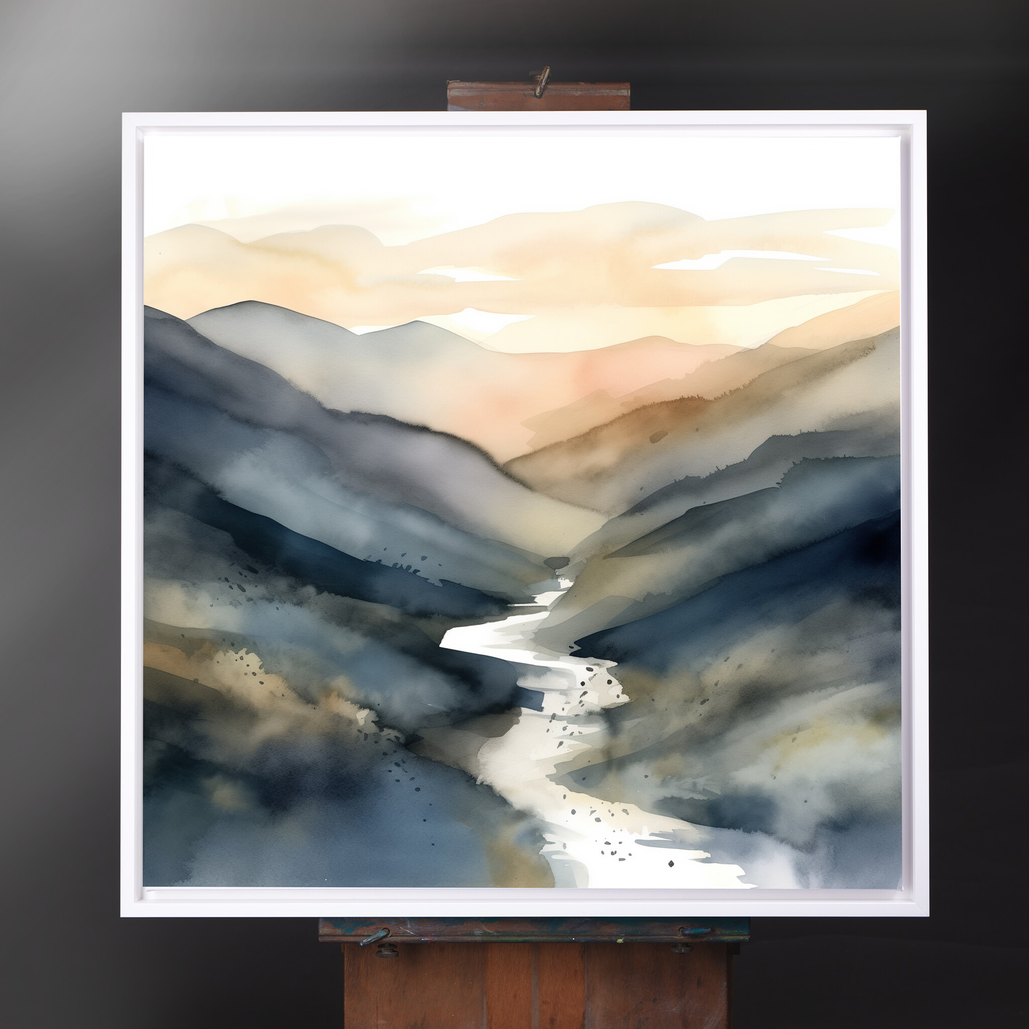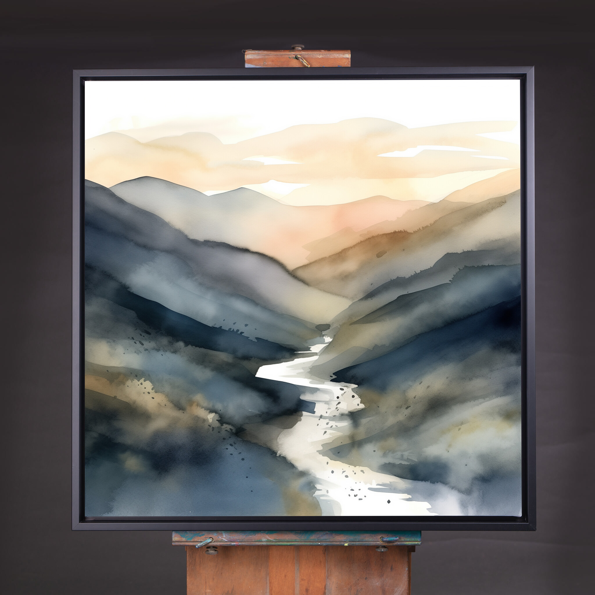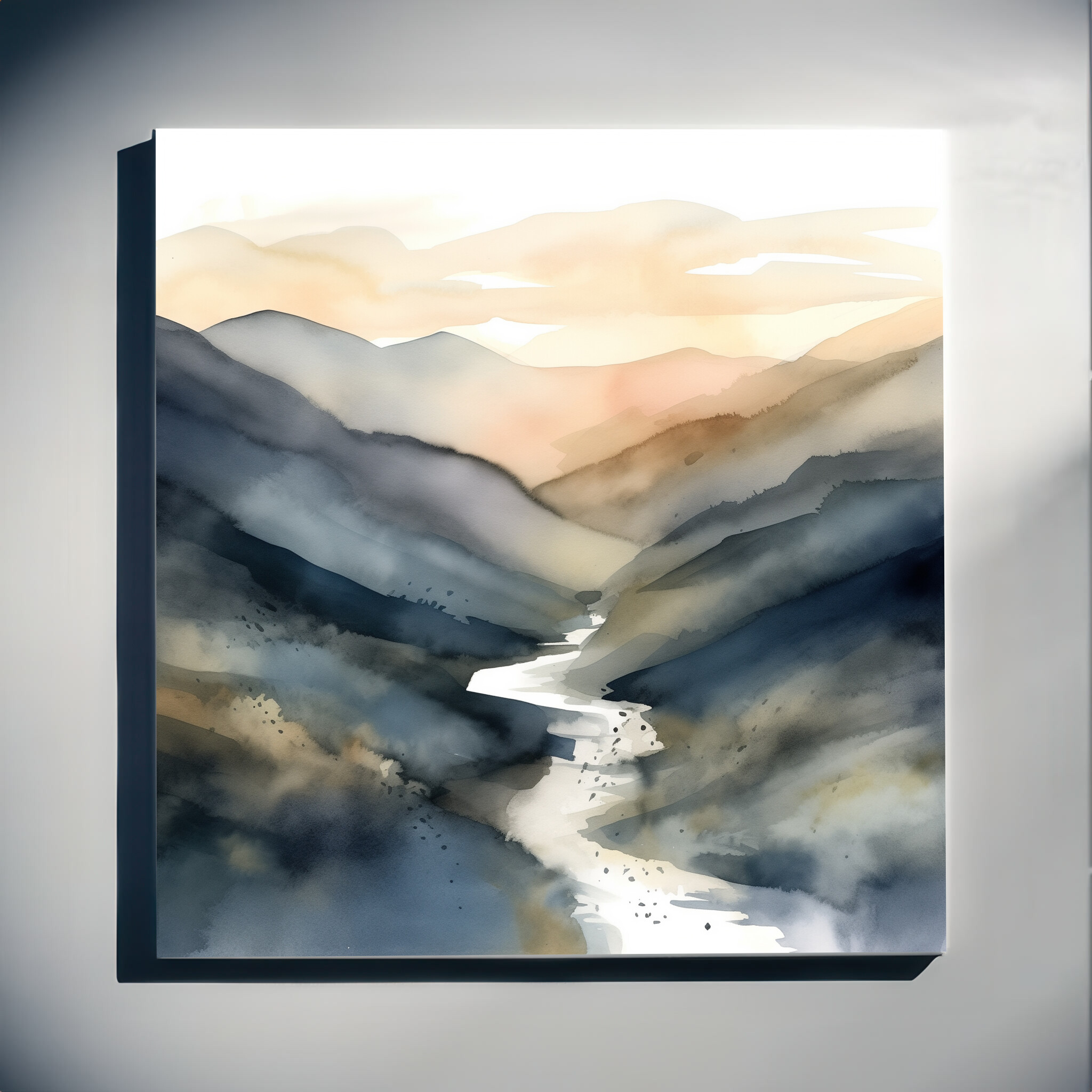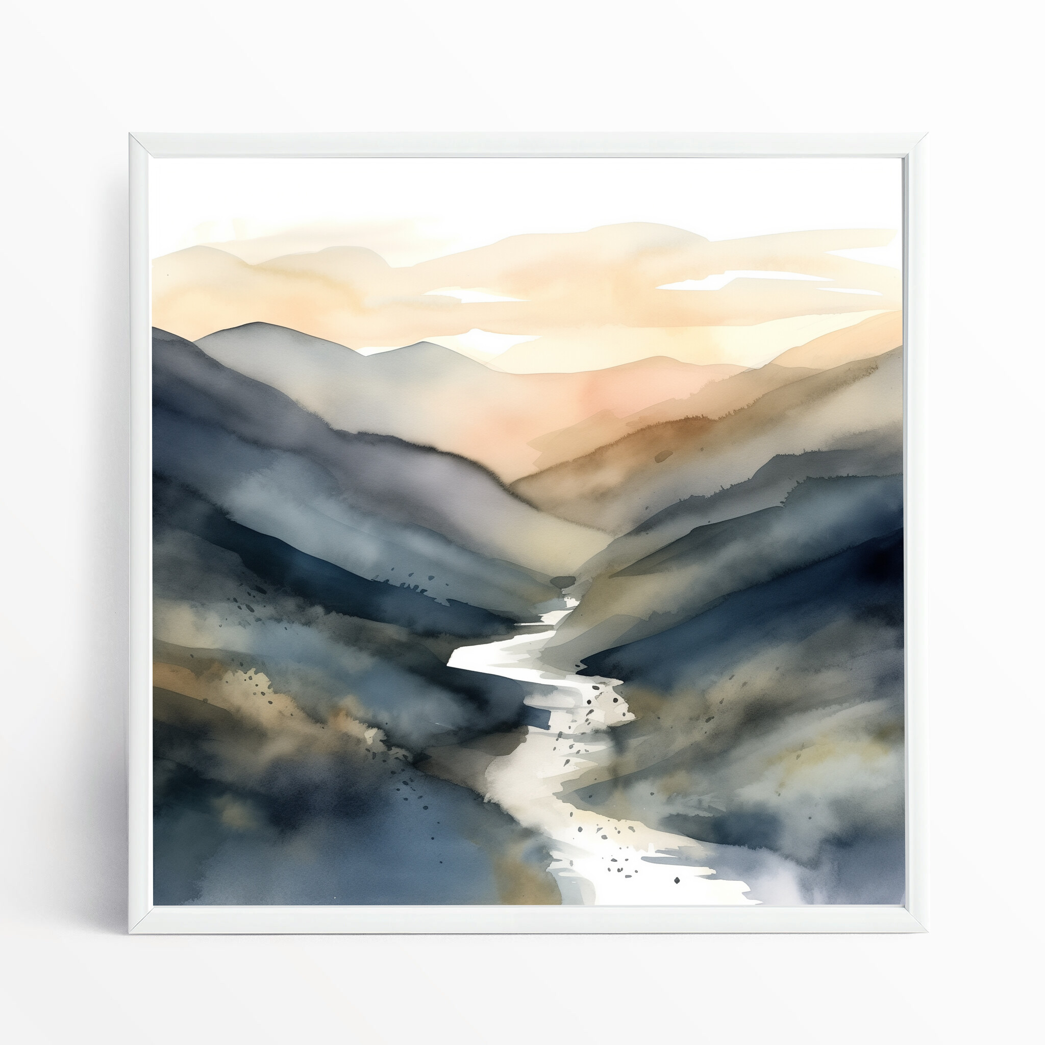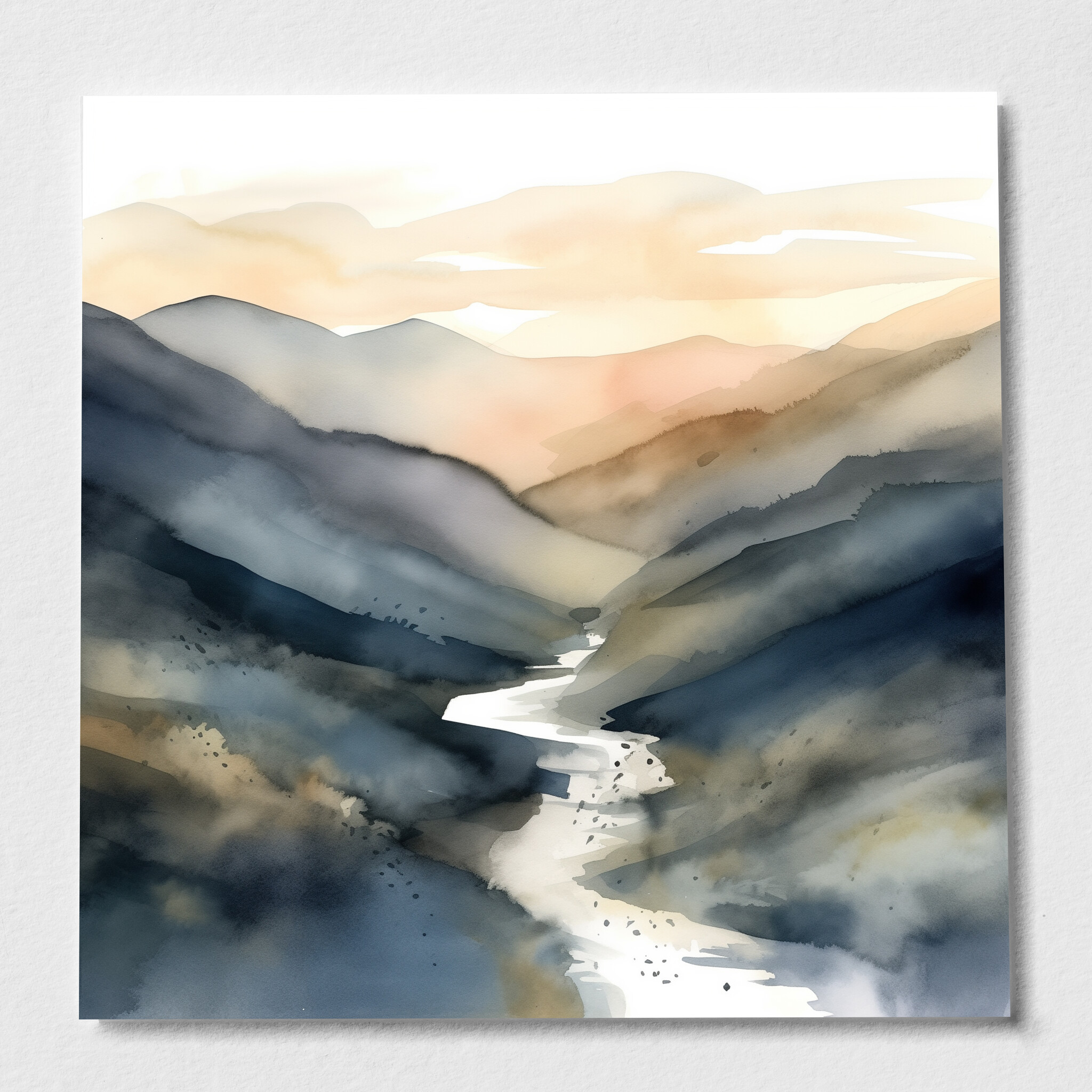 This stunning Abstract Landscape captures the essence of serene mountain vistas. With a harmonious blend of blue hues and warm tones, it evokes a sense of tranquillity and wonder. The abstract style perfectly highlights the natural beauty and grace of mountainous landscapes.