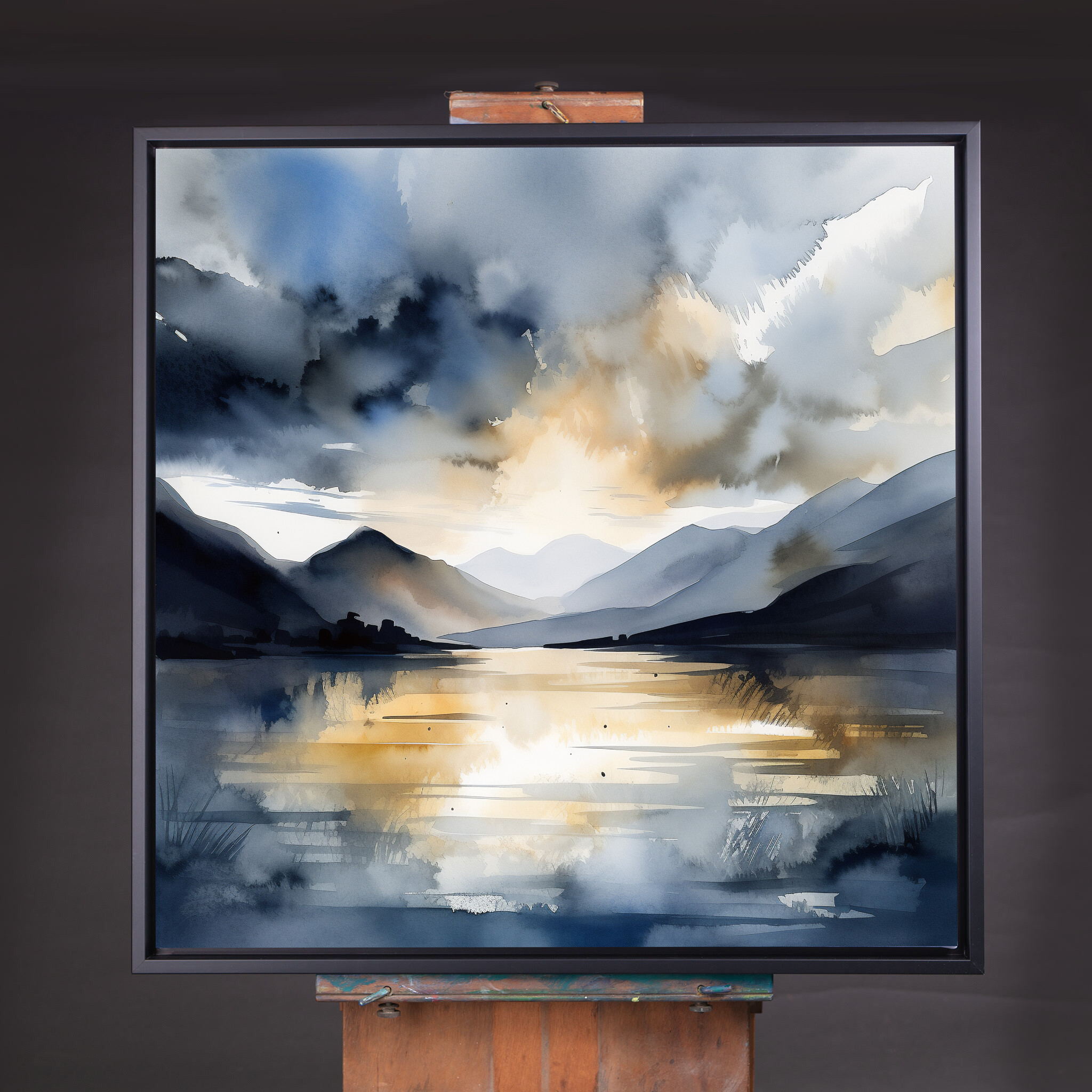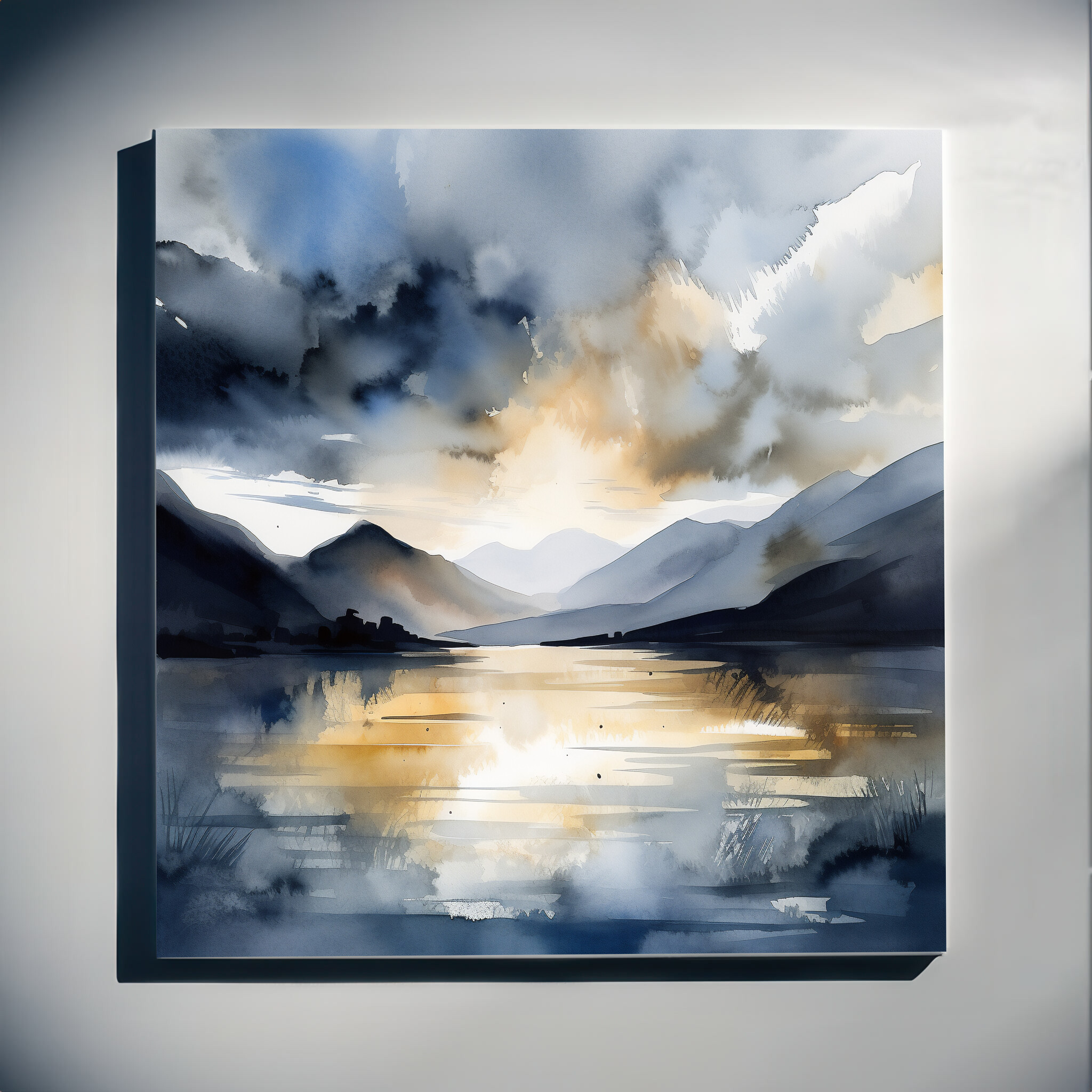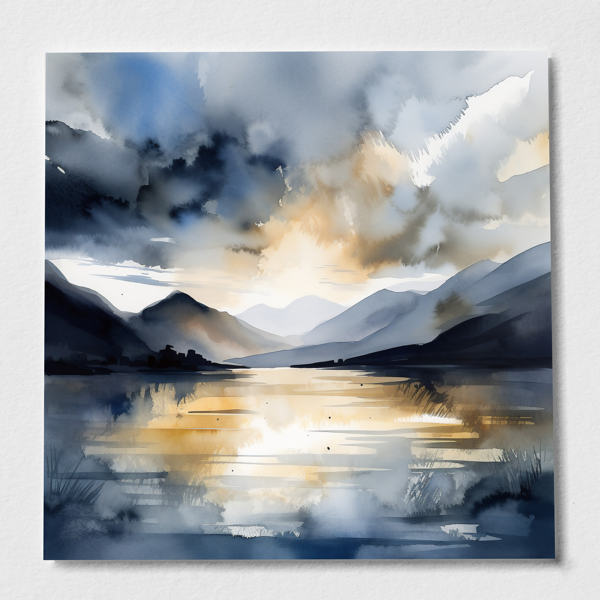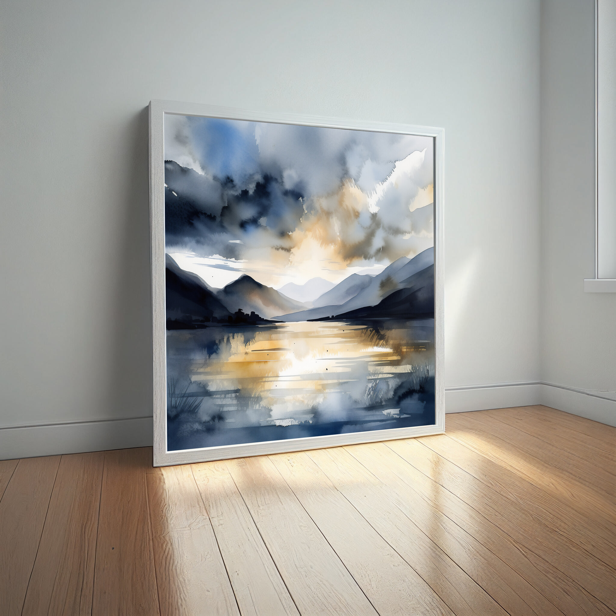 This impressionist artwork beautifully captures the serene landscape of Bassenthwaite Lake, where cool blue tones meet warm, golden accents. The painting portrays a captivating scene with reflections on the water, surrounded by rolling hills and majestic skies.