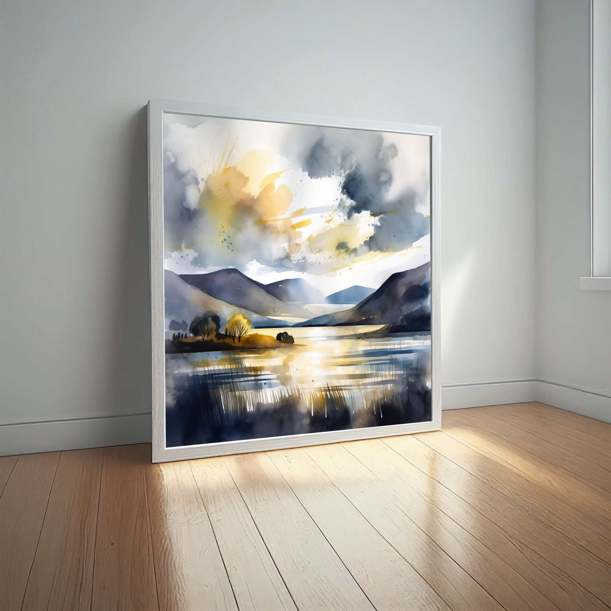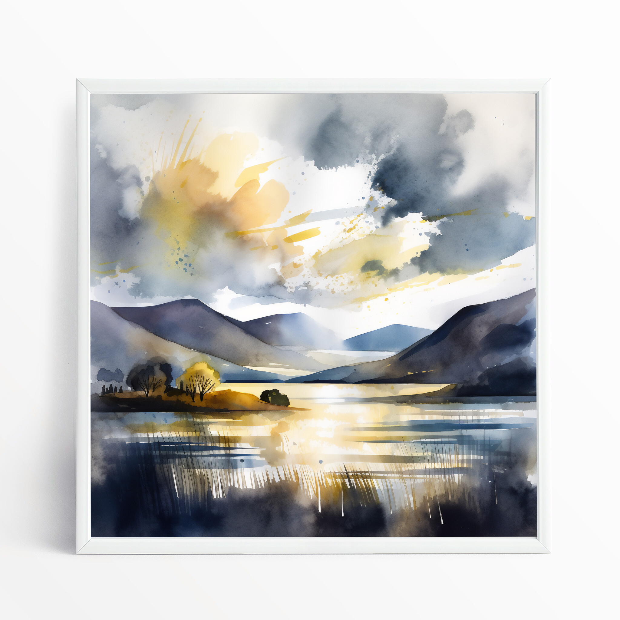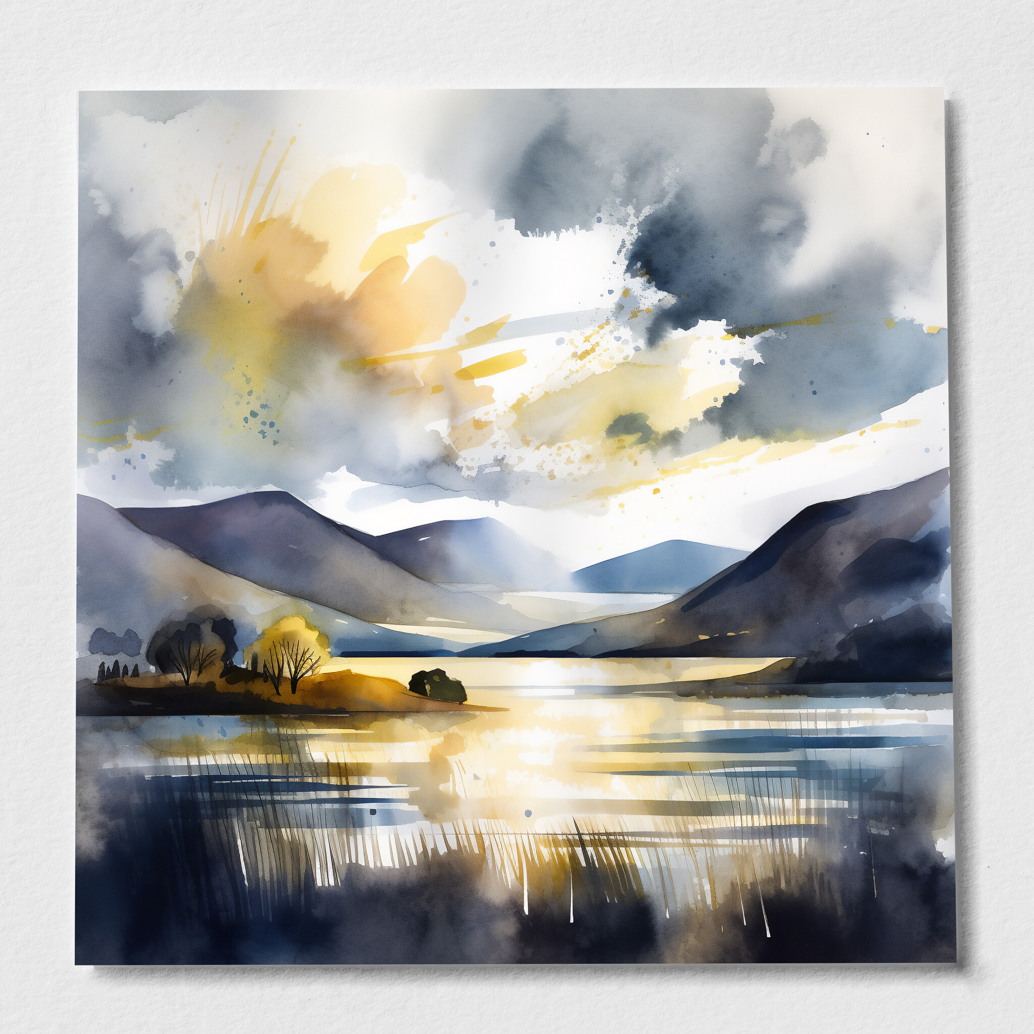 Immerse yourself in the tranquil beauty of Bassenthwaite with this captivating watercolor landscape. The harmonious blend of blue art and gold accents brings the scene to life, capturing the serene essence of this picturesque location. Perfect for any art lover, this piece adds a touch of sophistication and peace to your home decor.