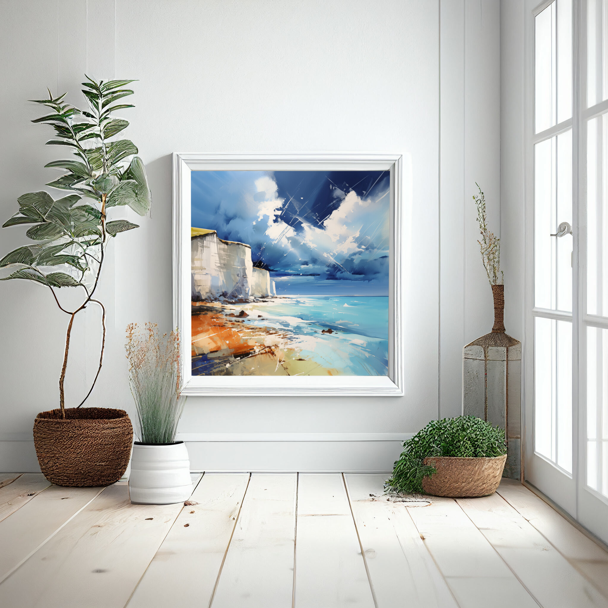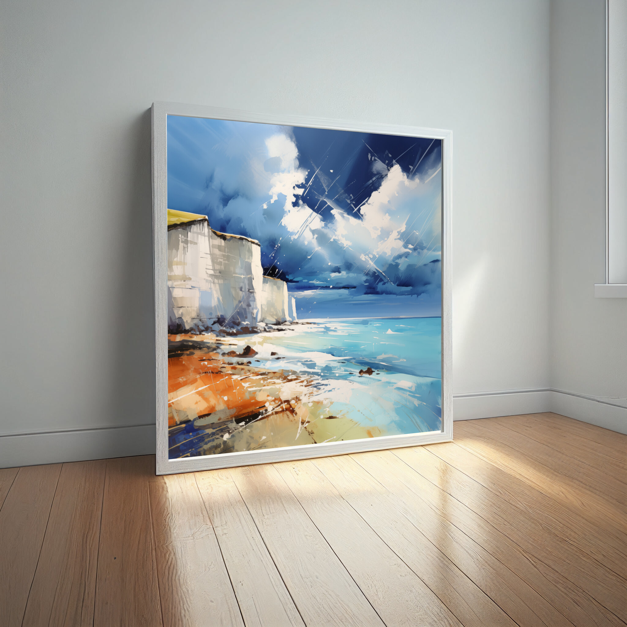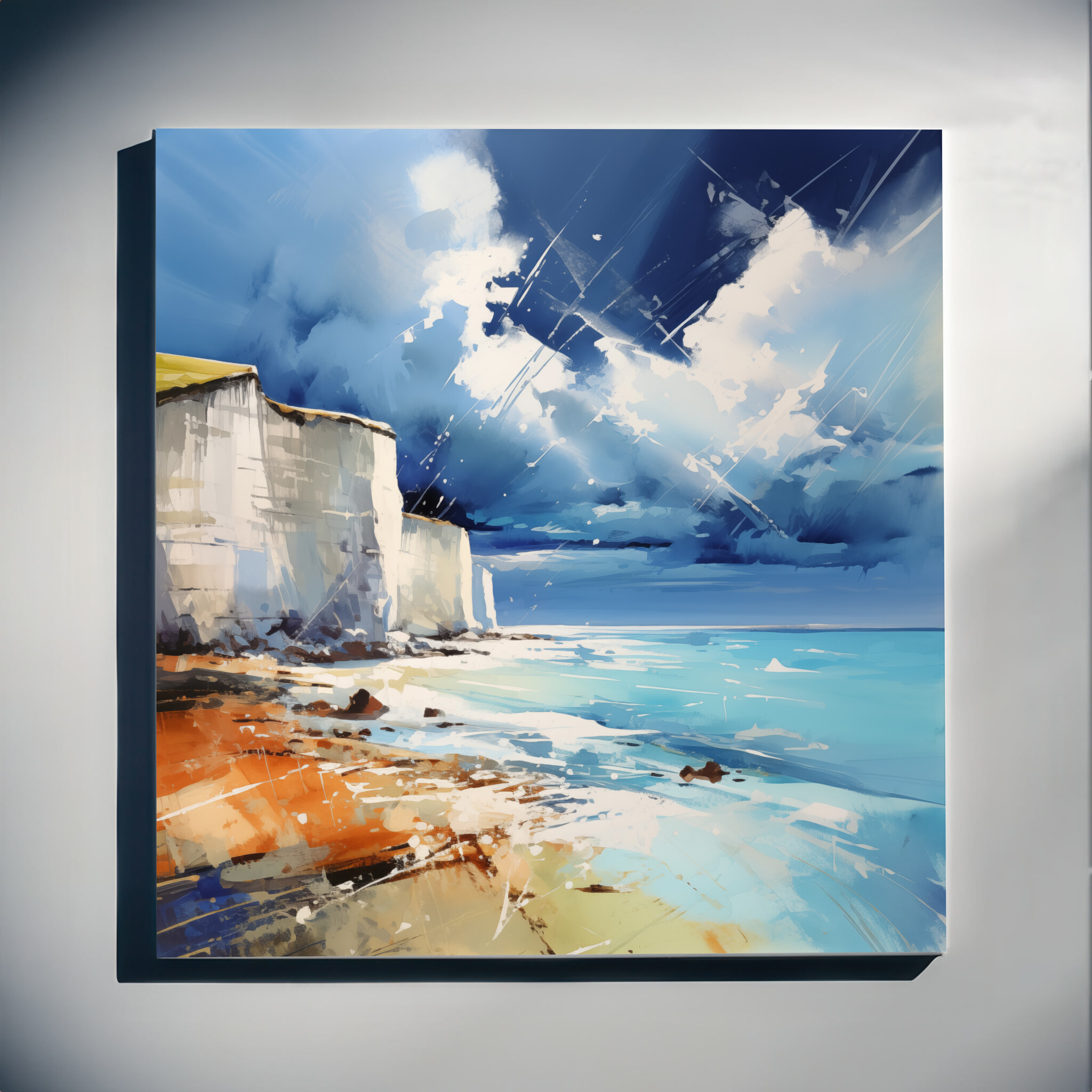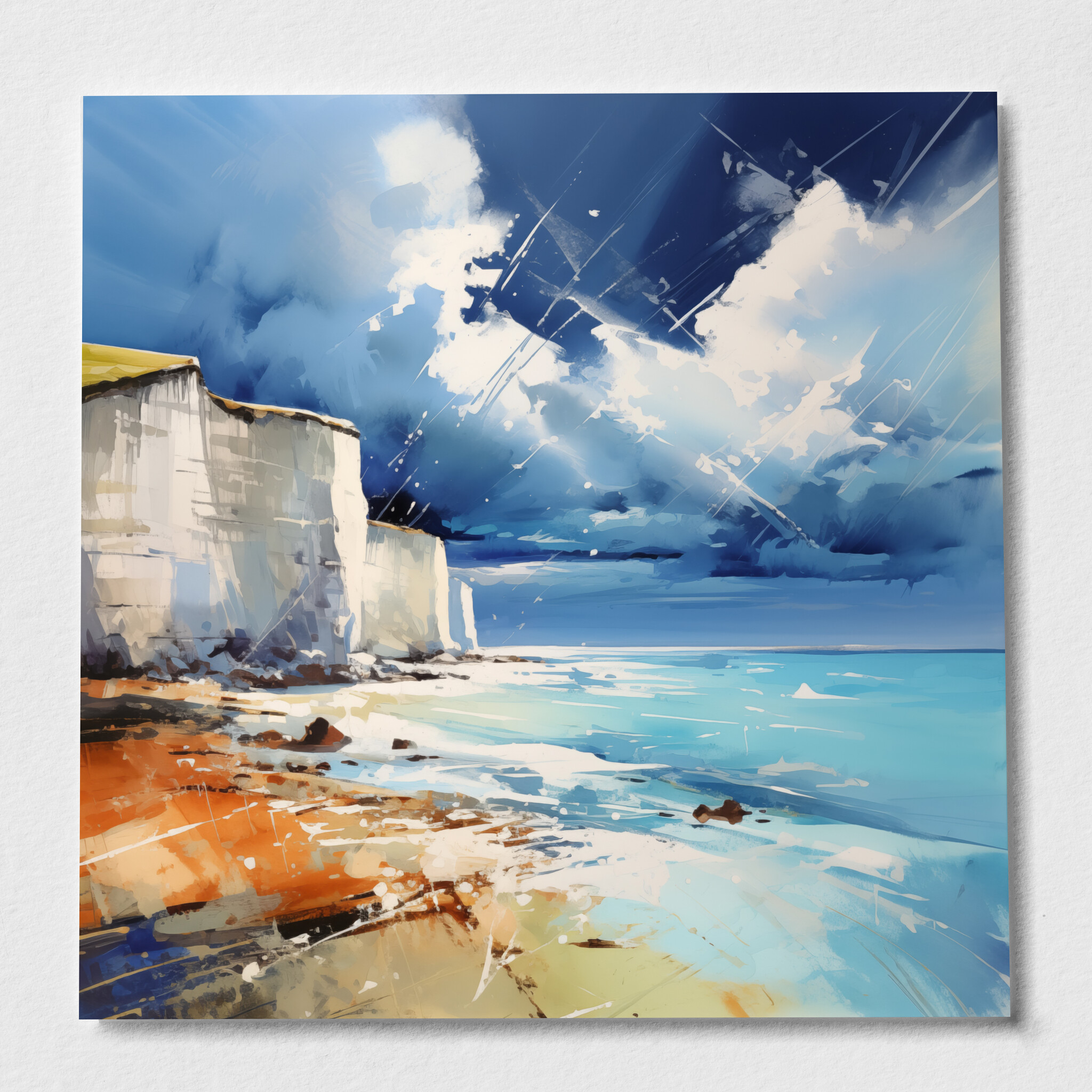 Experience the stunning beauty of Birling Gap through this exquisite abstract landscape artwork. The dynamic blues and whites capture the essence of the cliffs and sky, inviting the viewer into a serene yet invigorating scene. Crafted in a modern style, this piece brings the coastal majesty of Birling Gap to life, making it an ideal addition to any home decor.