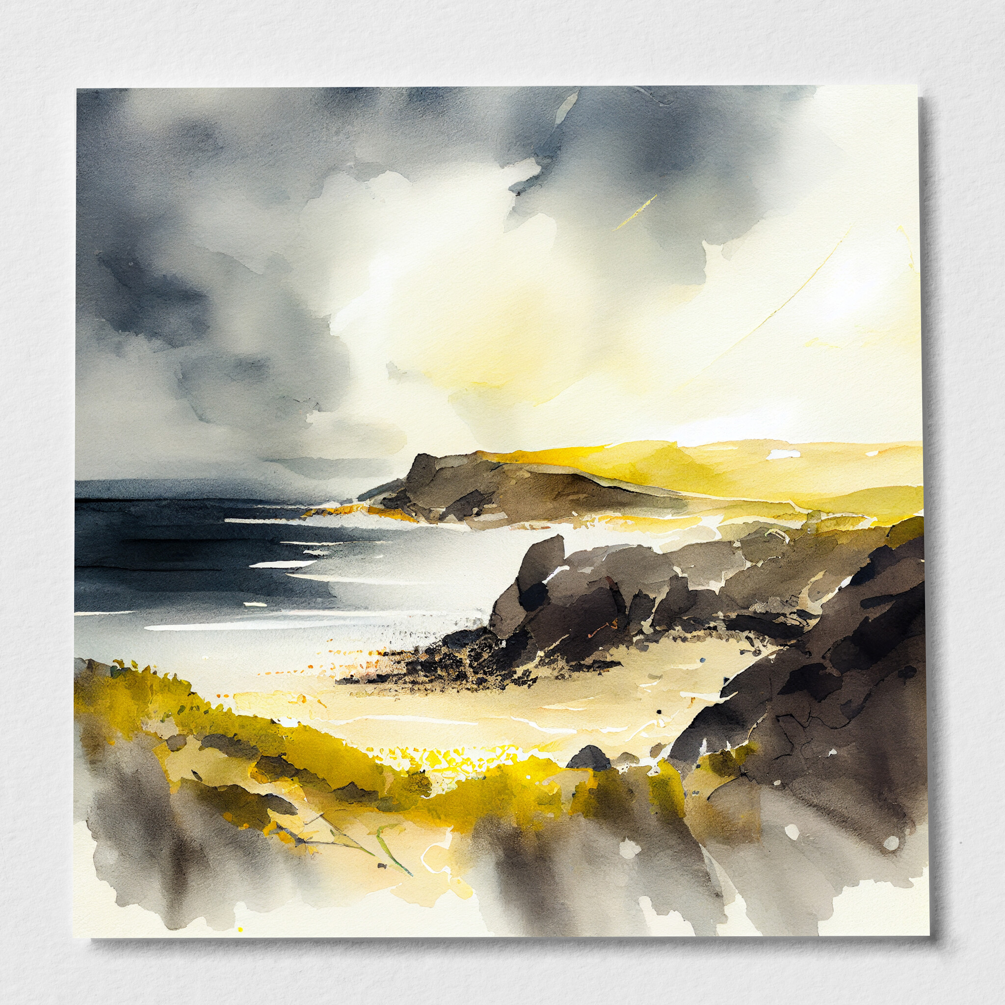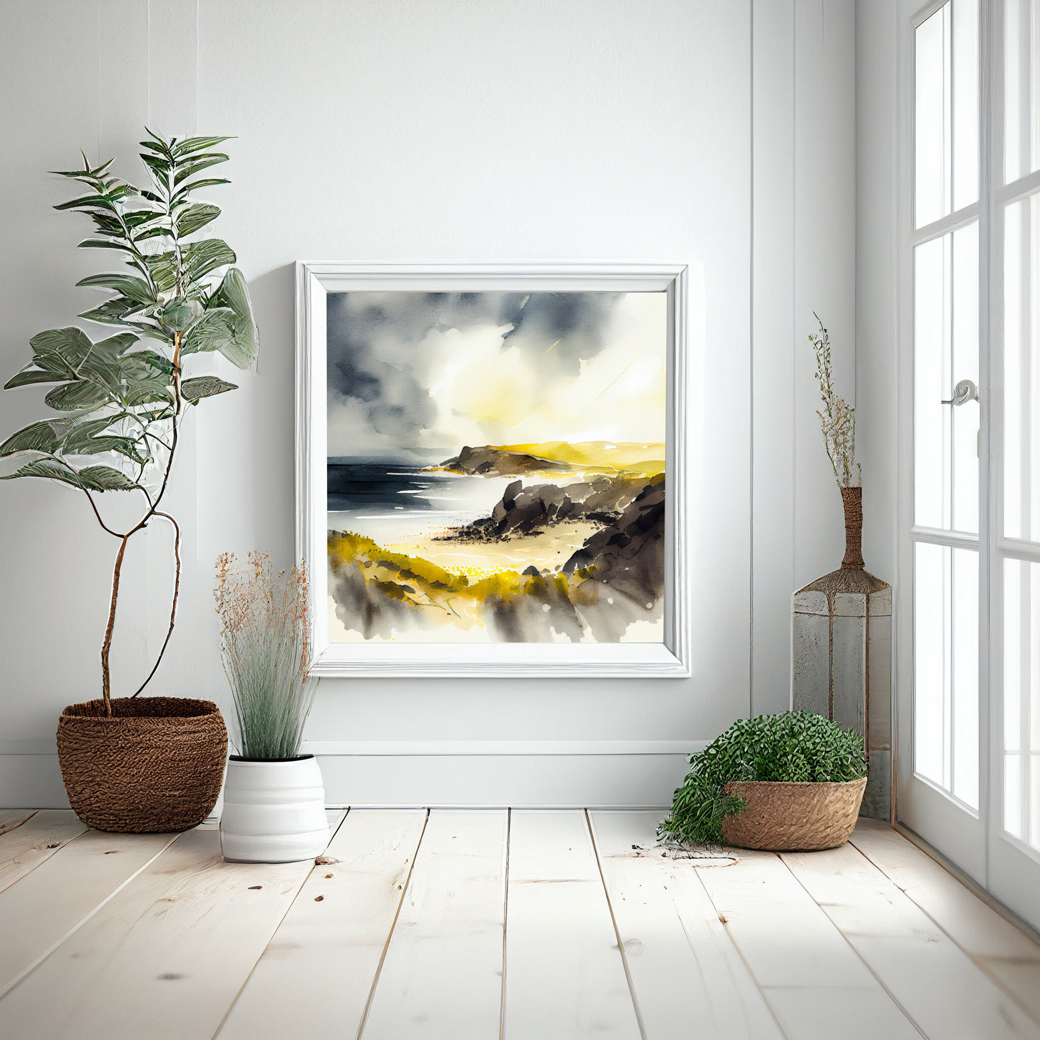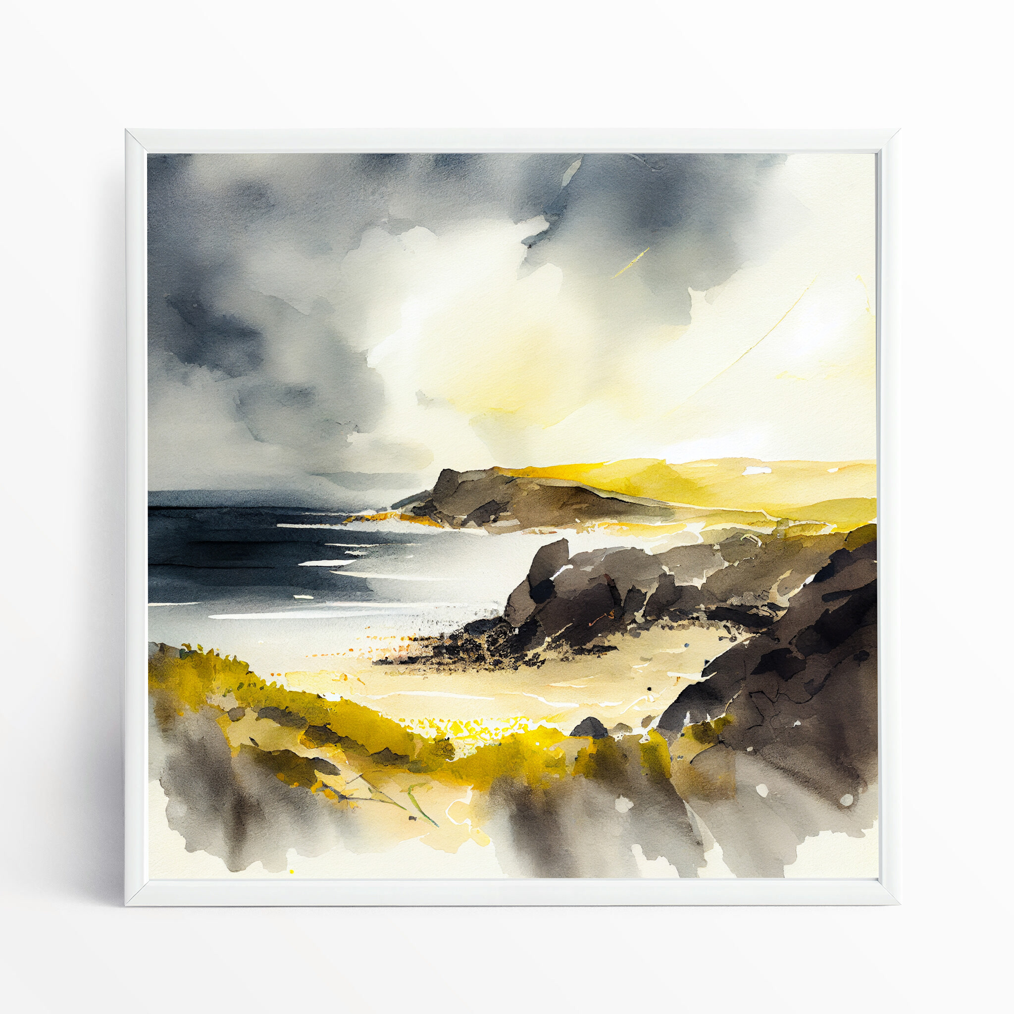 This captivating watercolour artwork beautifully captures the Cornish coastline with a blend of blue and earthy tones. Golden hues dance across the beach, contrasting with the dramatic, grey sky, to create a truly mesmerising landscape. Perfectly embodying the essence of coastal art, this piece invites a sense of peace and elegance to any space.