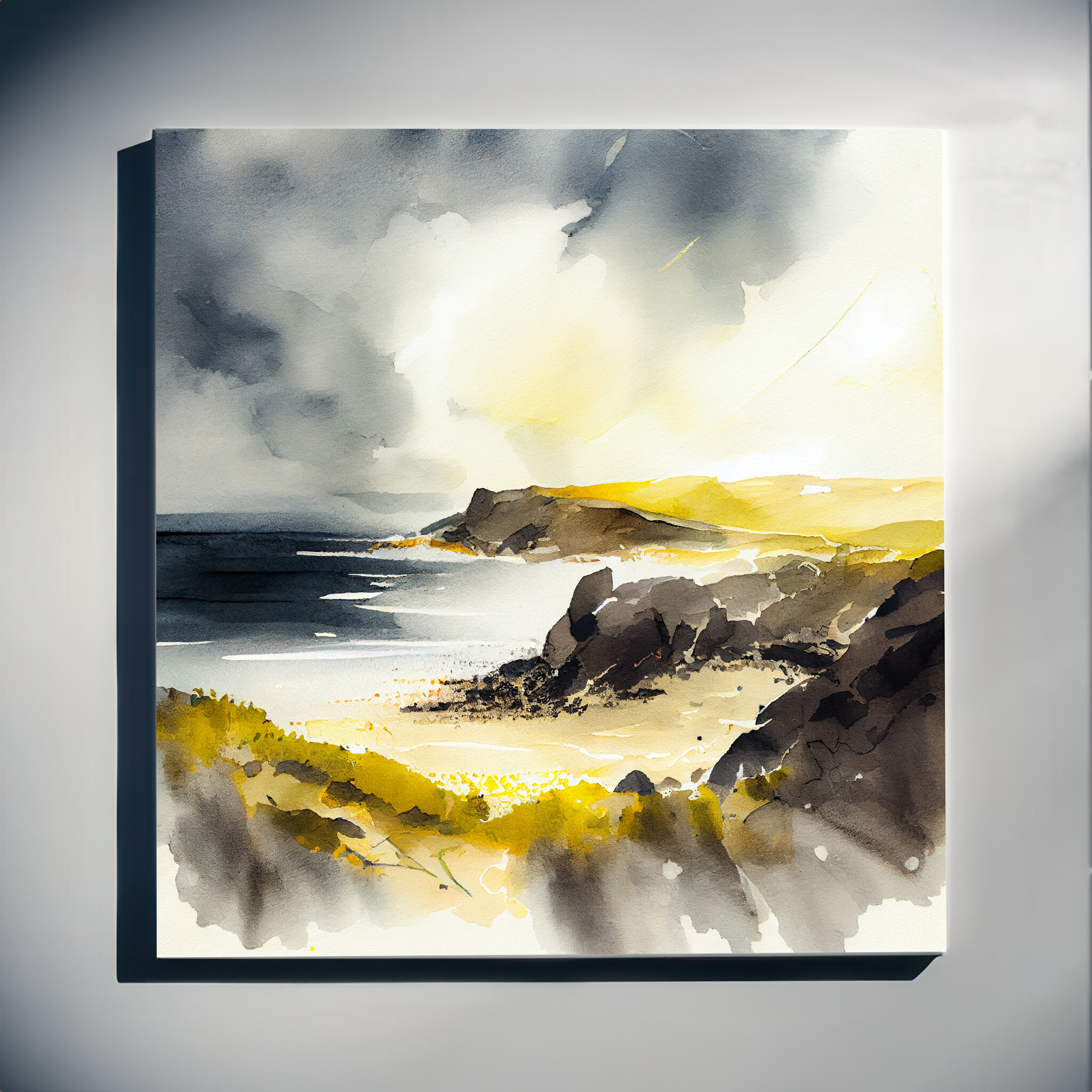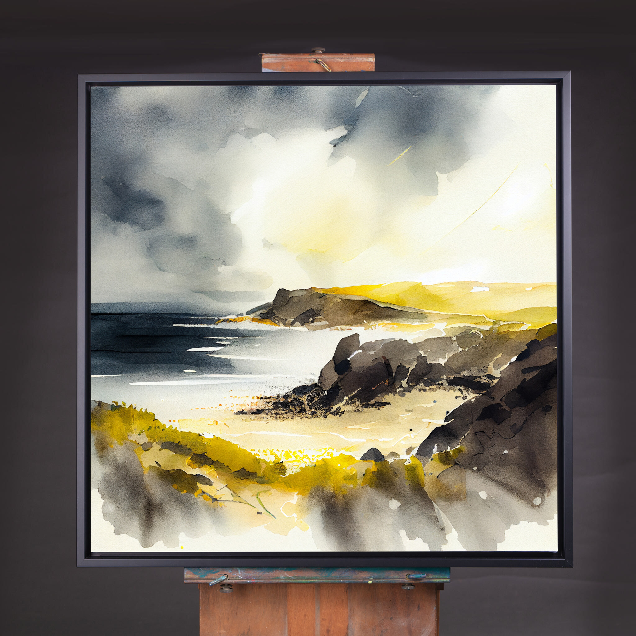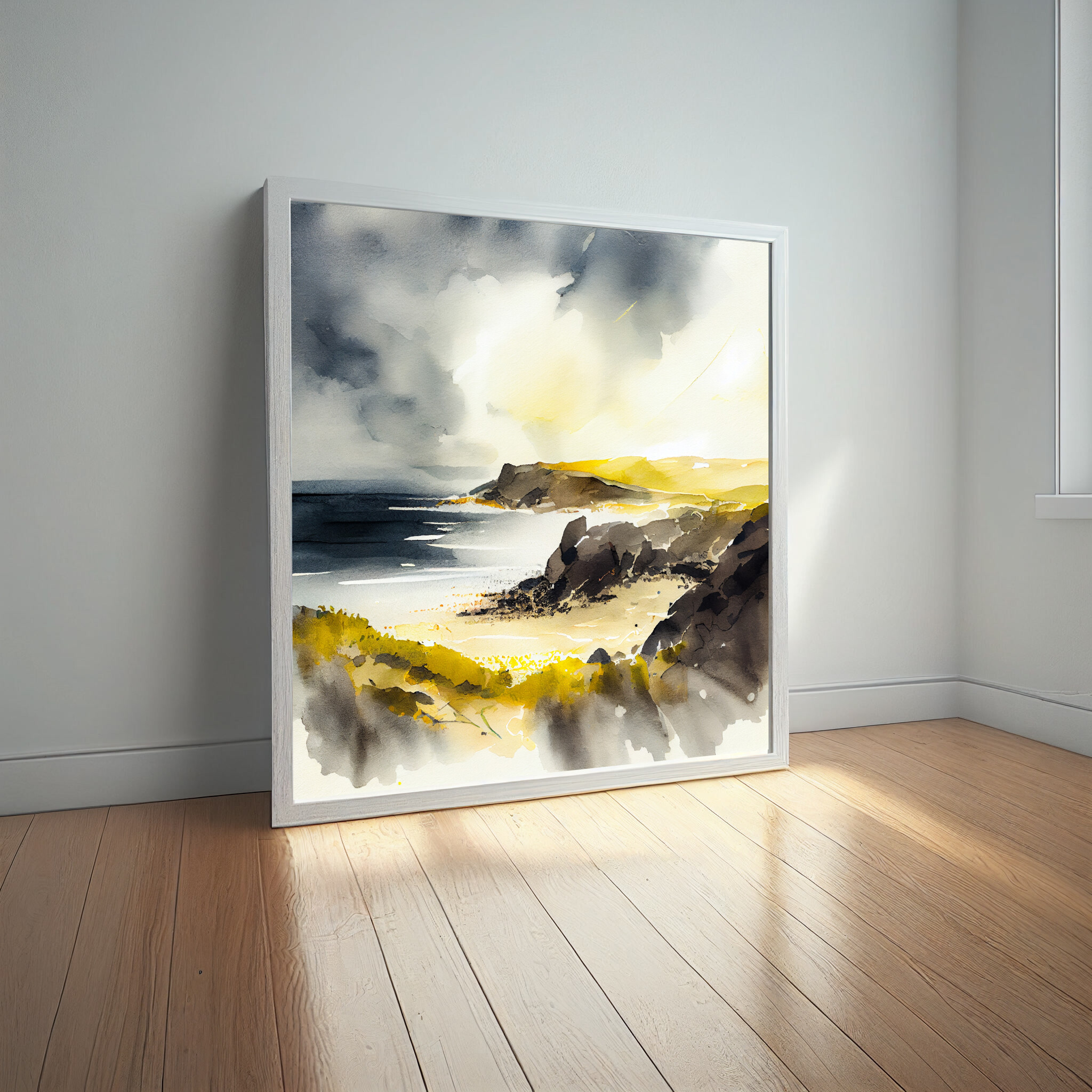 This captivating watercolour artwork beautifully captures the Cornish coastline with a blend of blue and earthy tones. Golden hues dance across the beach, contrasting with the dramatic, grey sky, to create a truly mesmerising landscape. Perfectly embodying the essence of coastal art, this piece invites a sense of peace and elegance to any space.