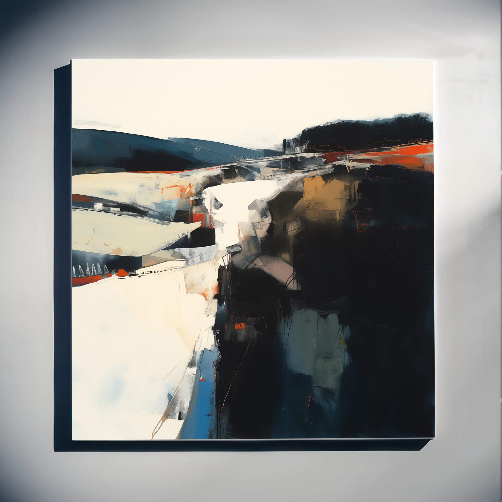 This striking abstract landscape captures the essence of Cornwall with a captivating blend of blue and warm tones, set within a modern style. The dynamic composition evokes a sense of movement and energy, perfect for adding a unique touch to any space.