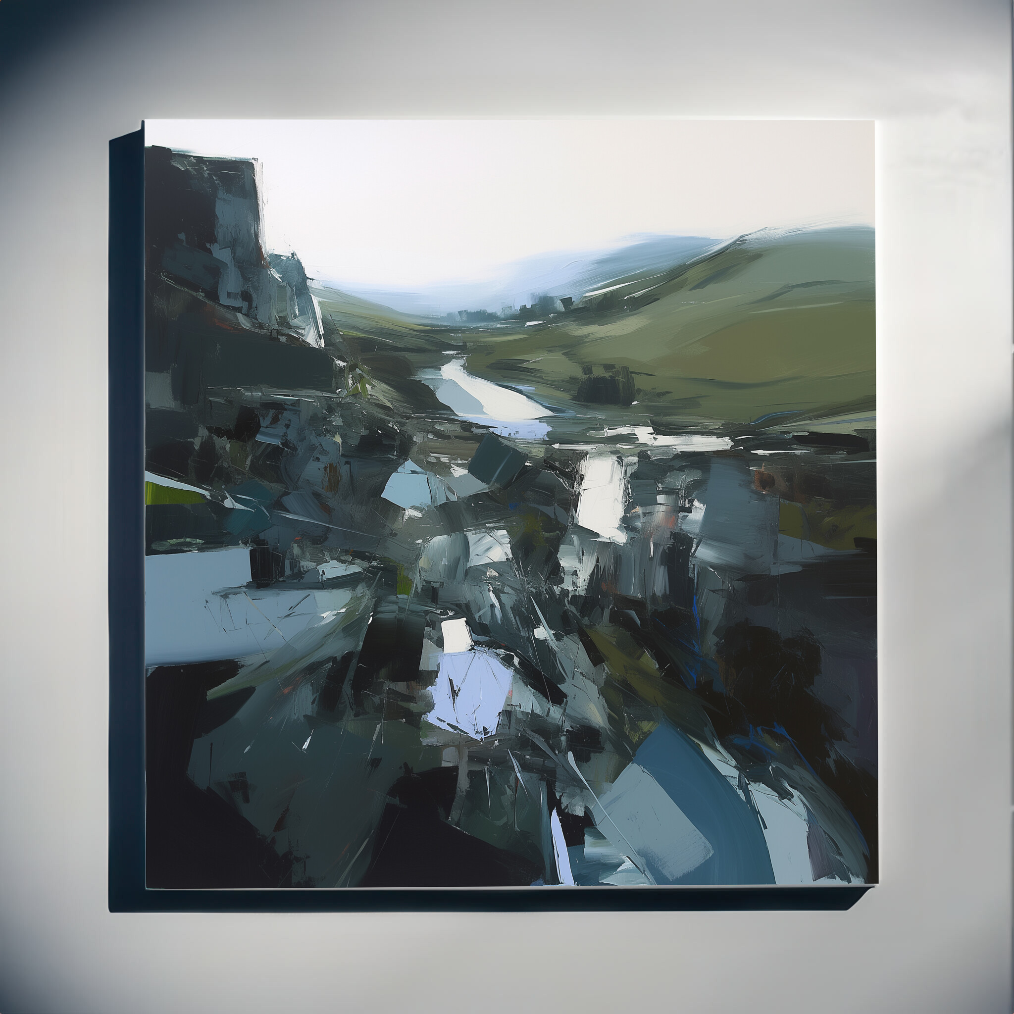 This captivating abstract landscape artwork immerses you in the serene beauty of Cornwall. With a harmonious blend of blue and green tones, it captures the essence of a tranquil landscape with a modern, abstract twist. The art style evokes a dynamic yet calm atmosphere, inviting contemplation and a sense of peace.