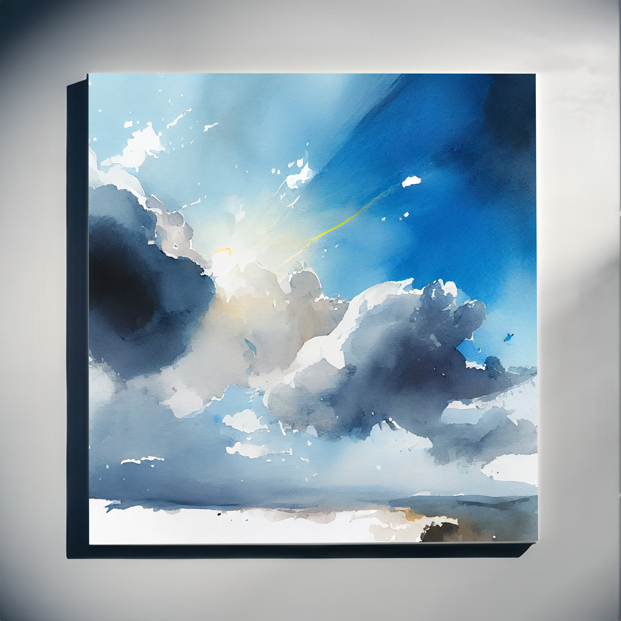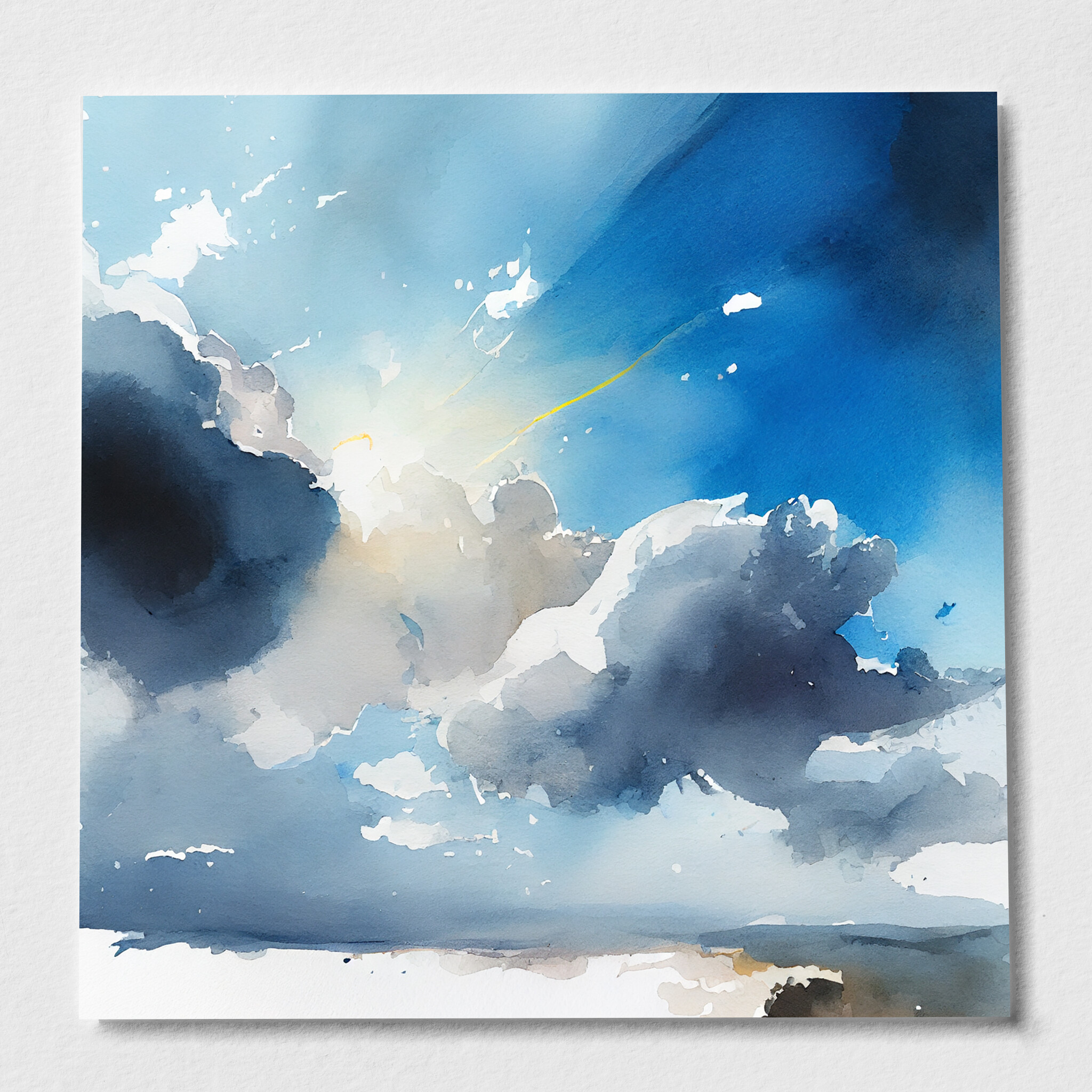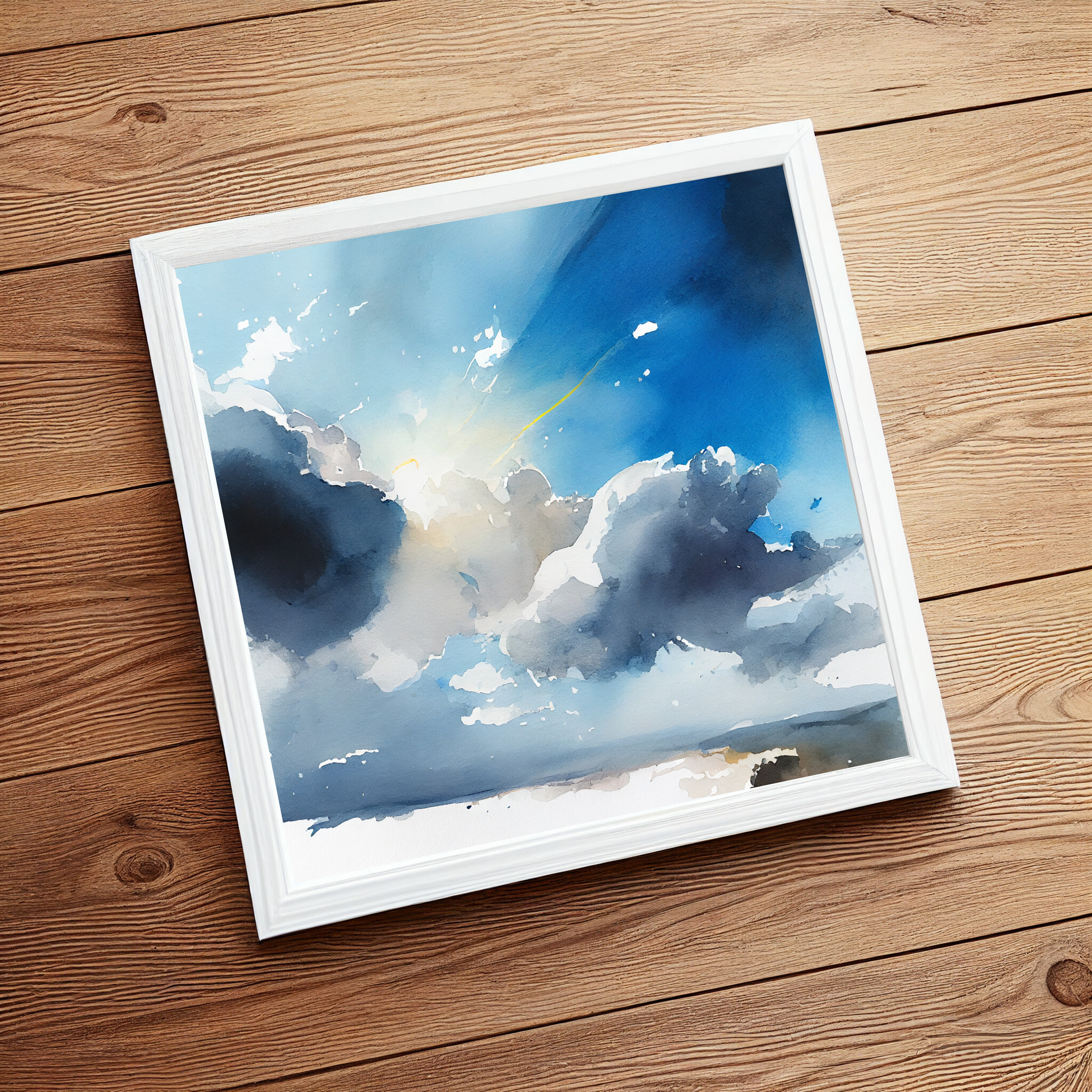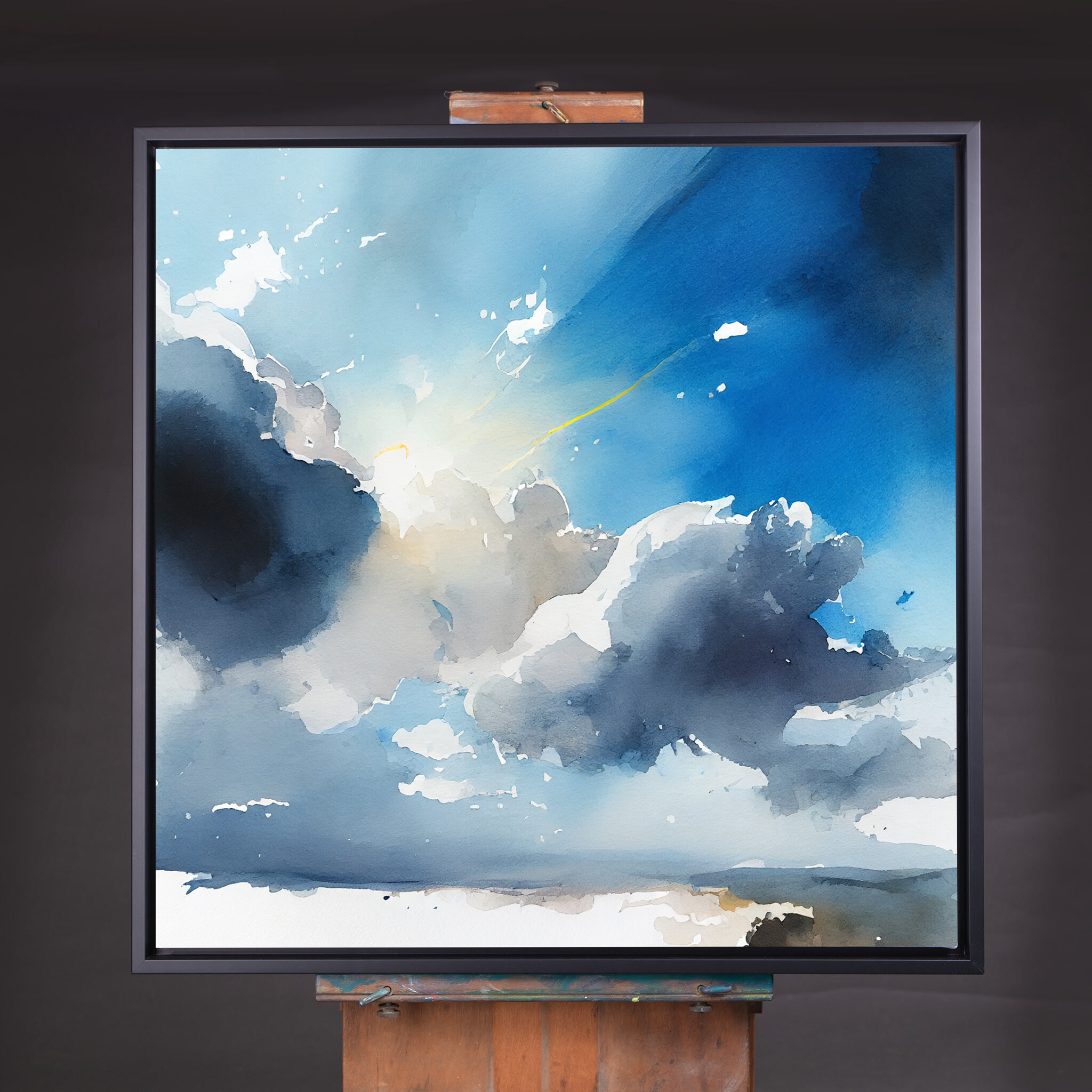 Immerse yourself in the magnificent skyscape inspired by Cornwall, featuring deep blue tones and abstract cloud formations. This artwork captivates with its modern style, lending a serene and calming presence to any room.