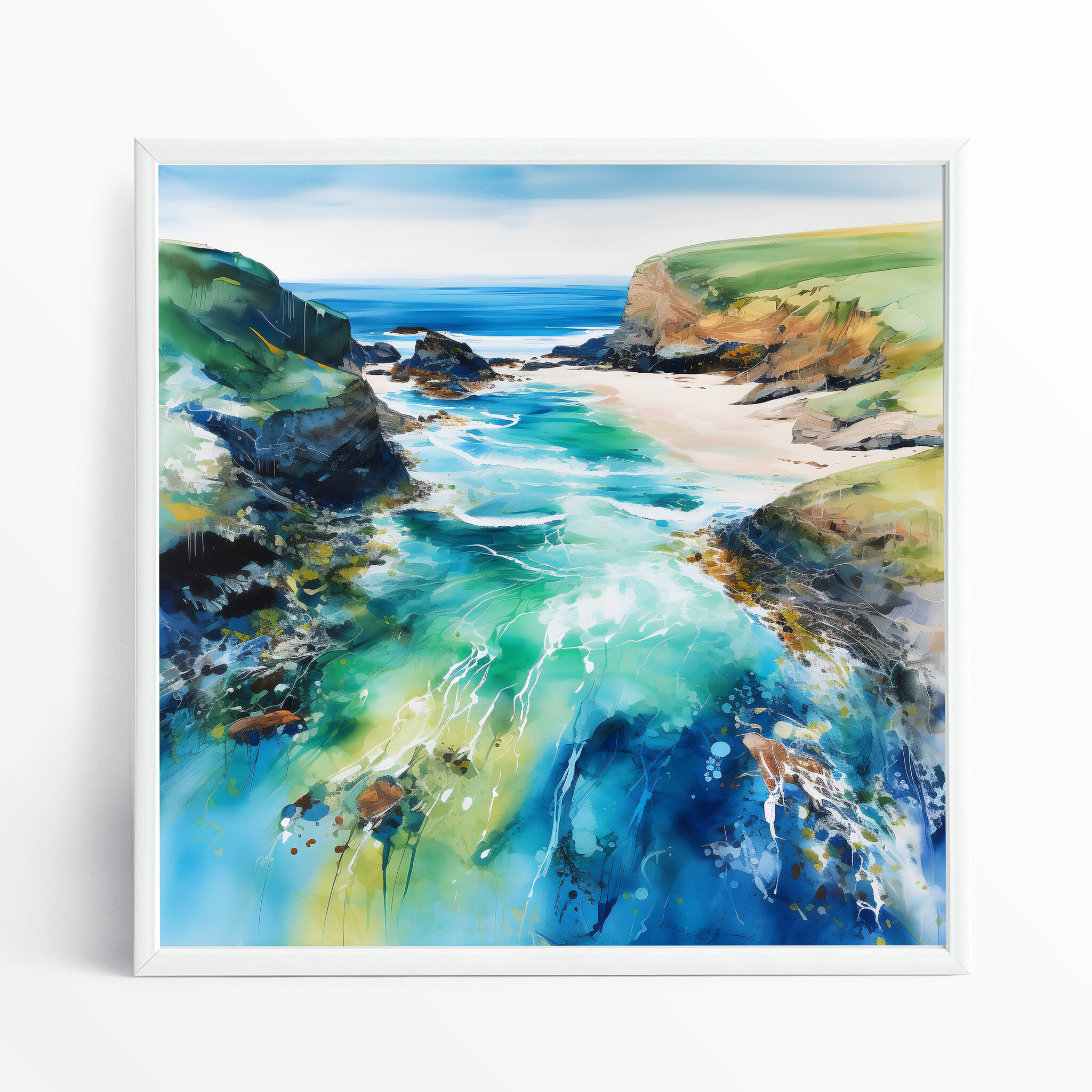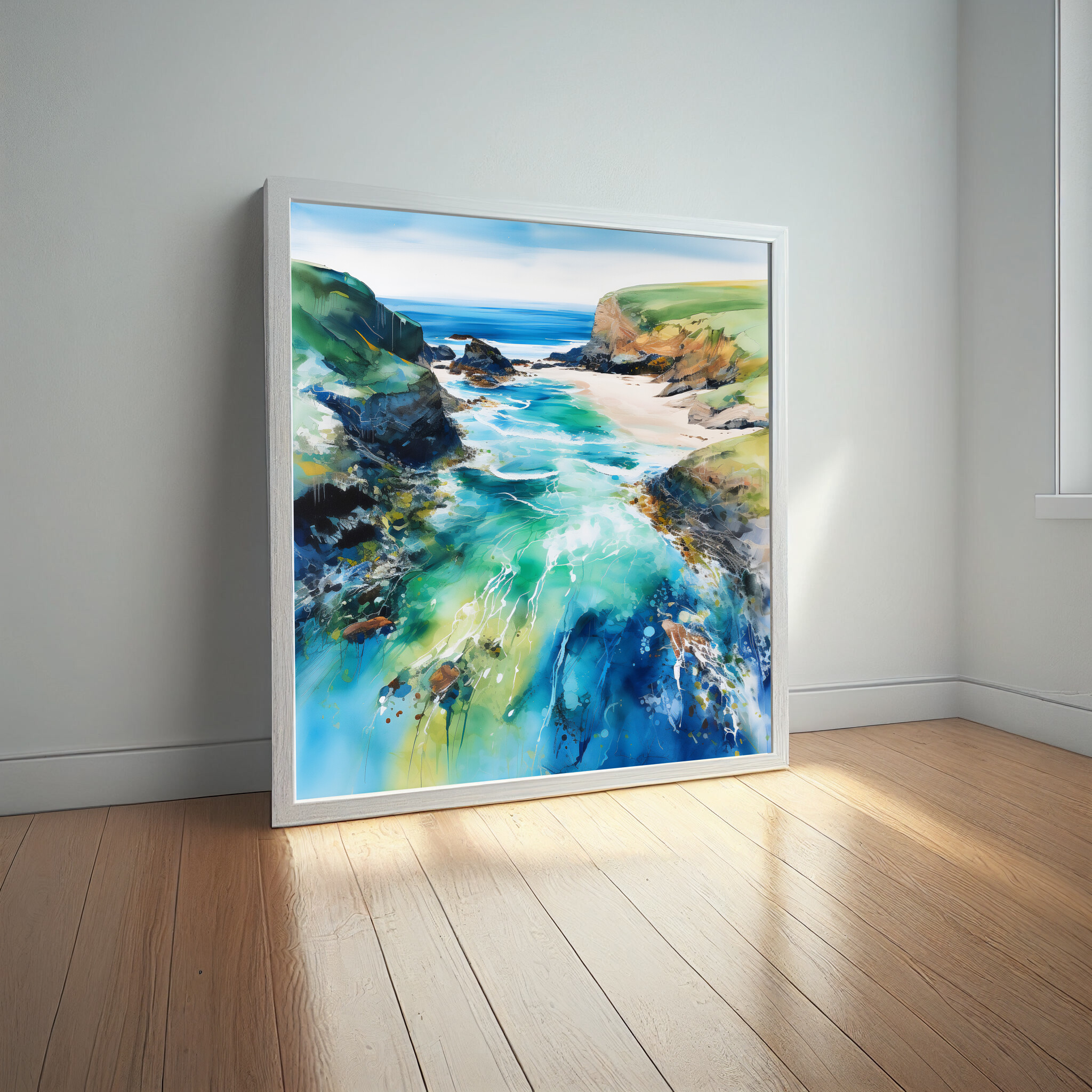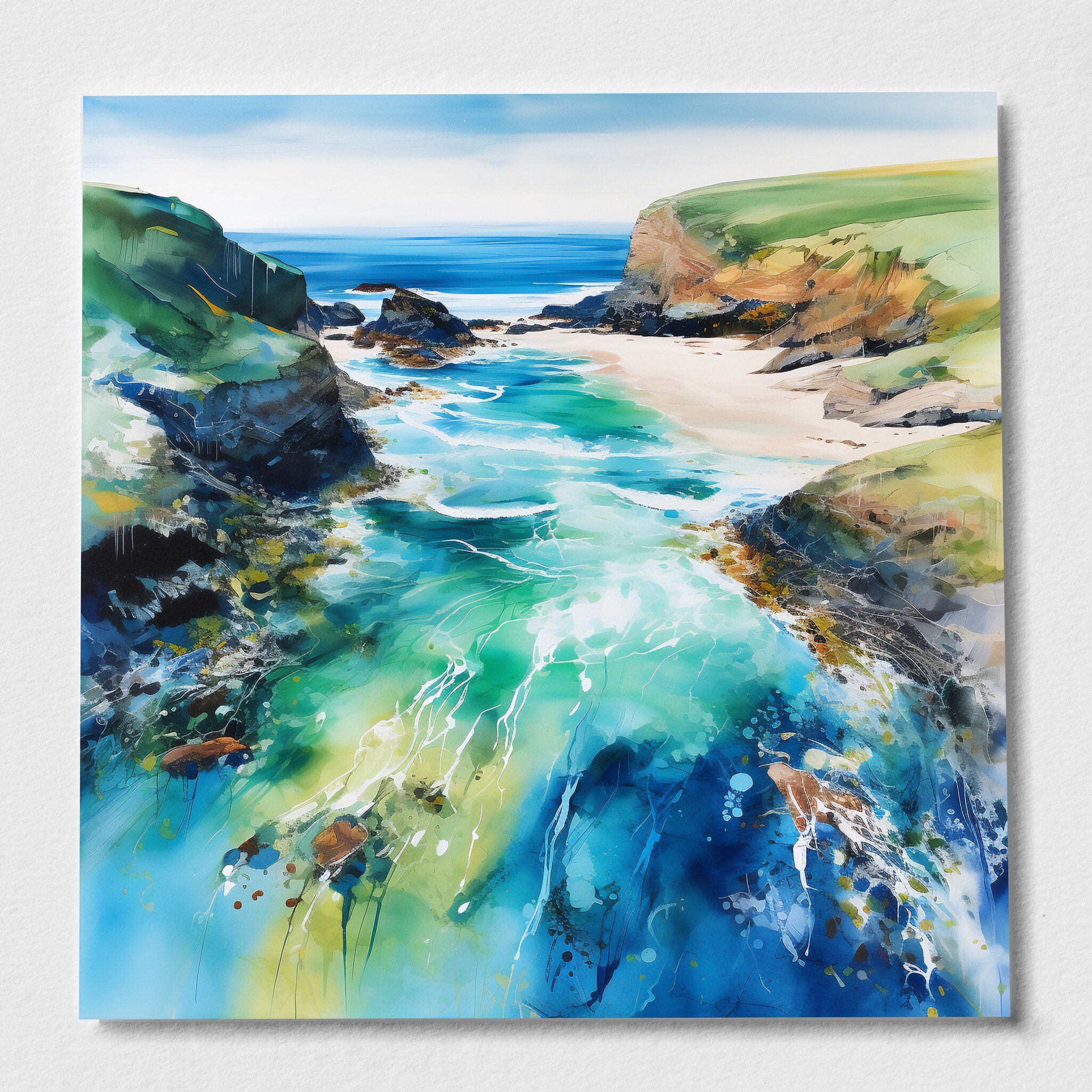 Discover the mesmerizing beauty of Cornwall beach through this abstract landscape artwork, teeming with vibrant blues and soothing greens. The piece captures the essence of the ocean, inviting you into a world of serenity and coastal charm.