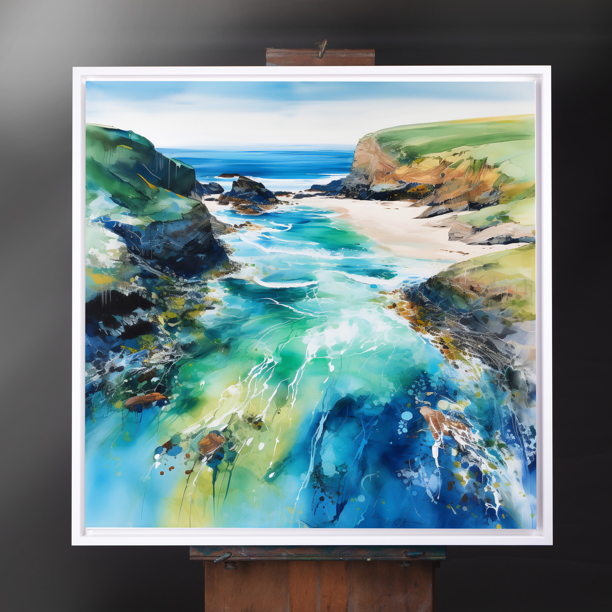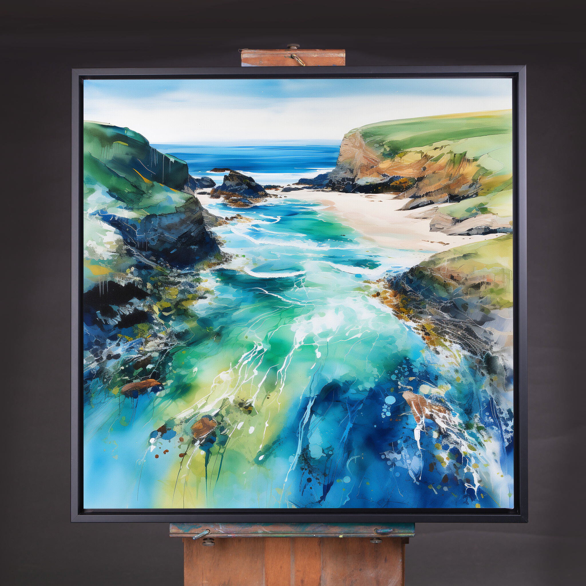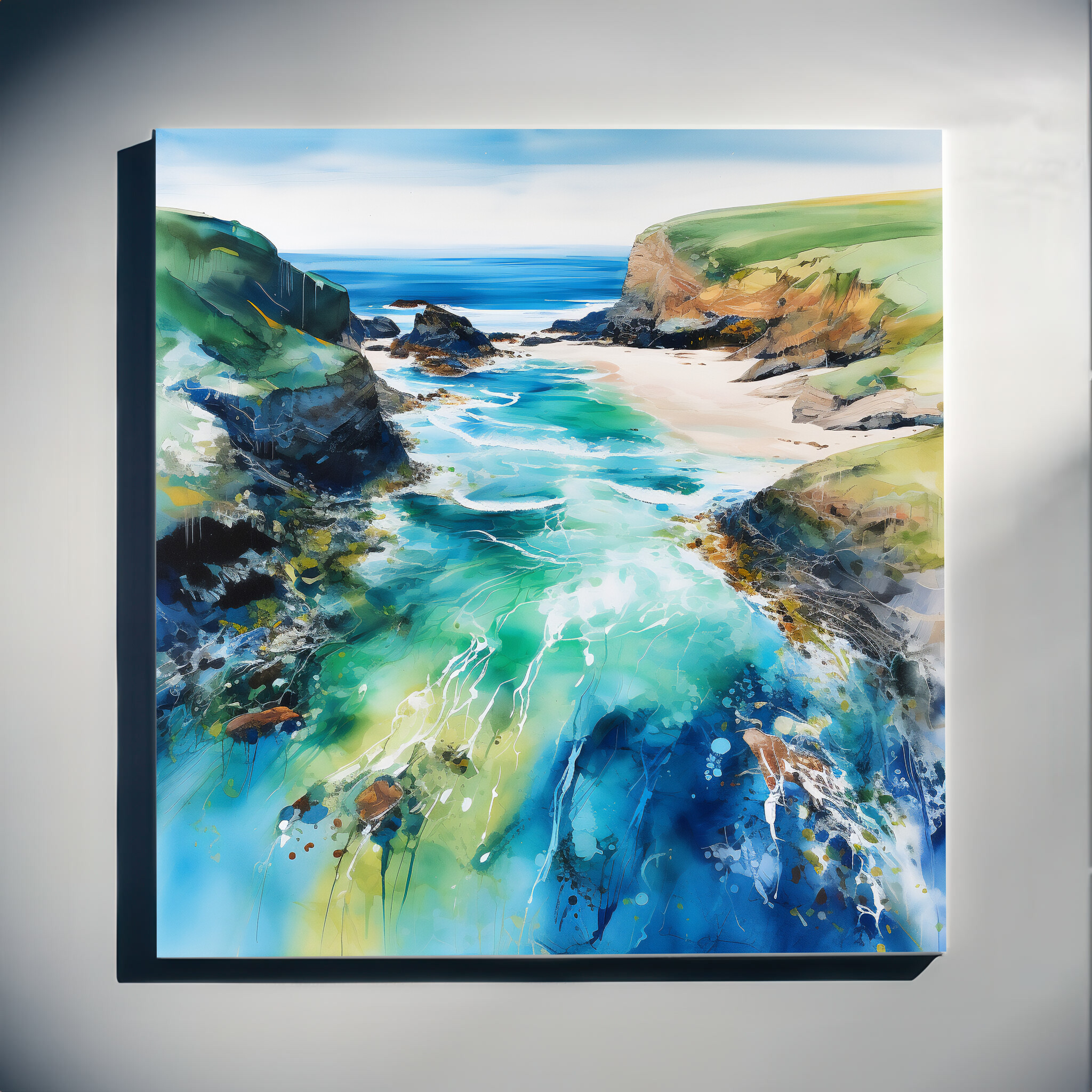 Discover the mesmerizing beauty of Cornwall beach through this abstract landscape artwork, teeming with vibrant blues and soothing greens. The piece captures the essence of the ocean, inviting you into a world of serenity and coastal charm.