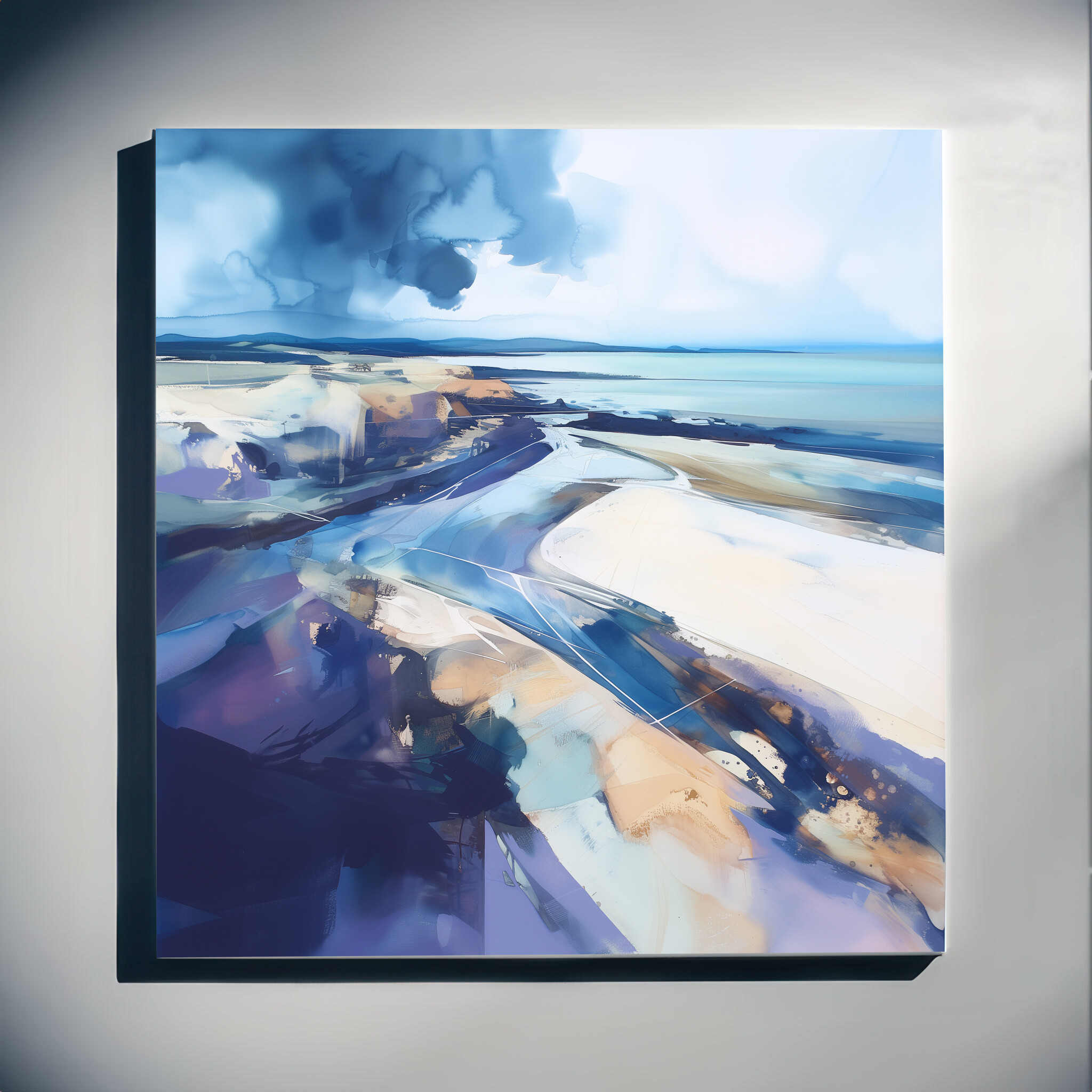 This stunning abstract artwork captures the serene beauty of a Cornwall beach. It features cool blue tones harmoniously blended with hints of beige and earth tones, creating a mesmerising coastal landscape. The fluid brushstrokes give it a dynamic yet calming effect, perfect for any art enthusiast.
