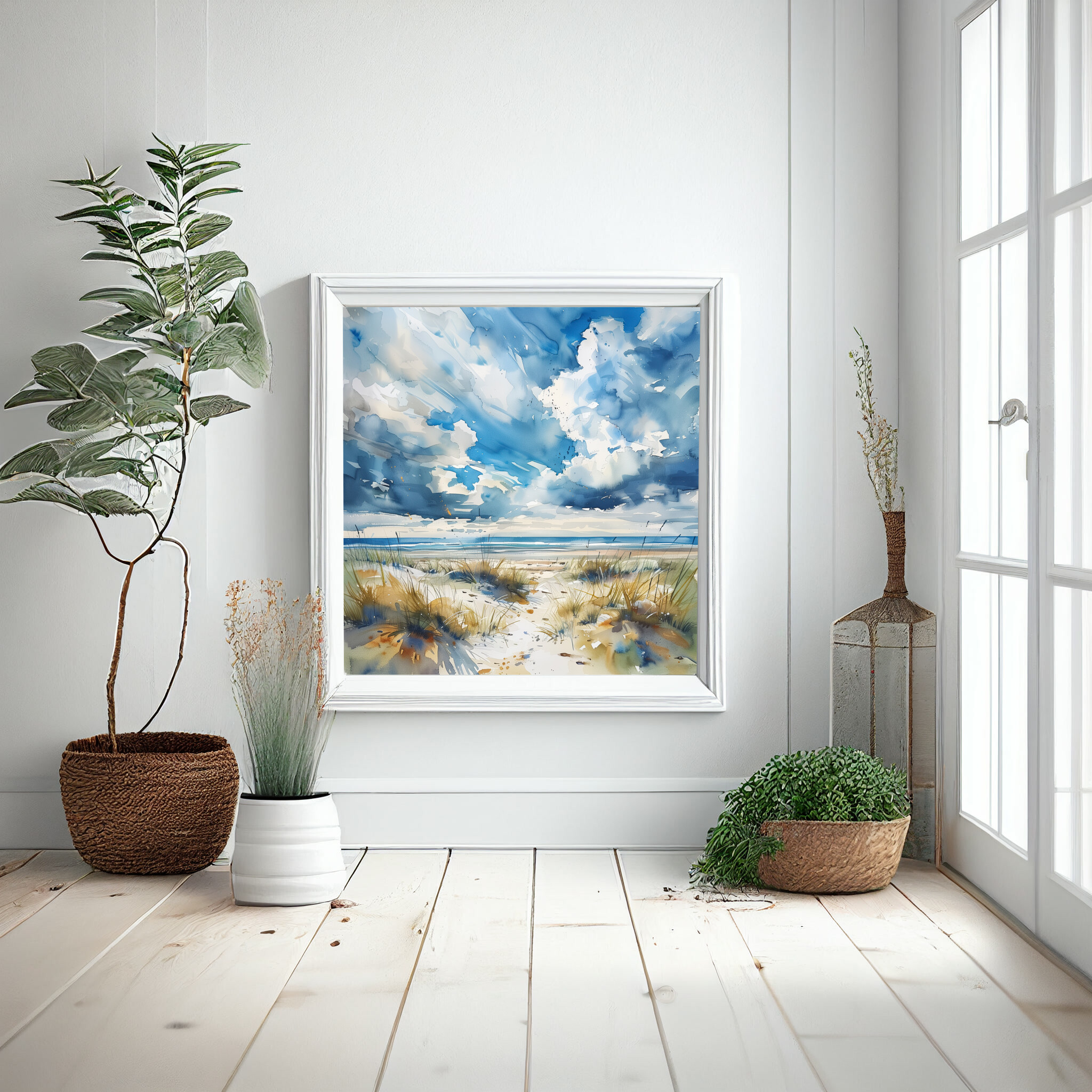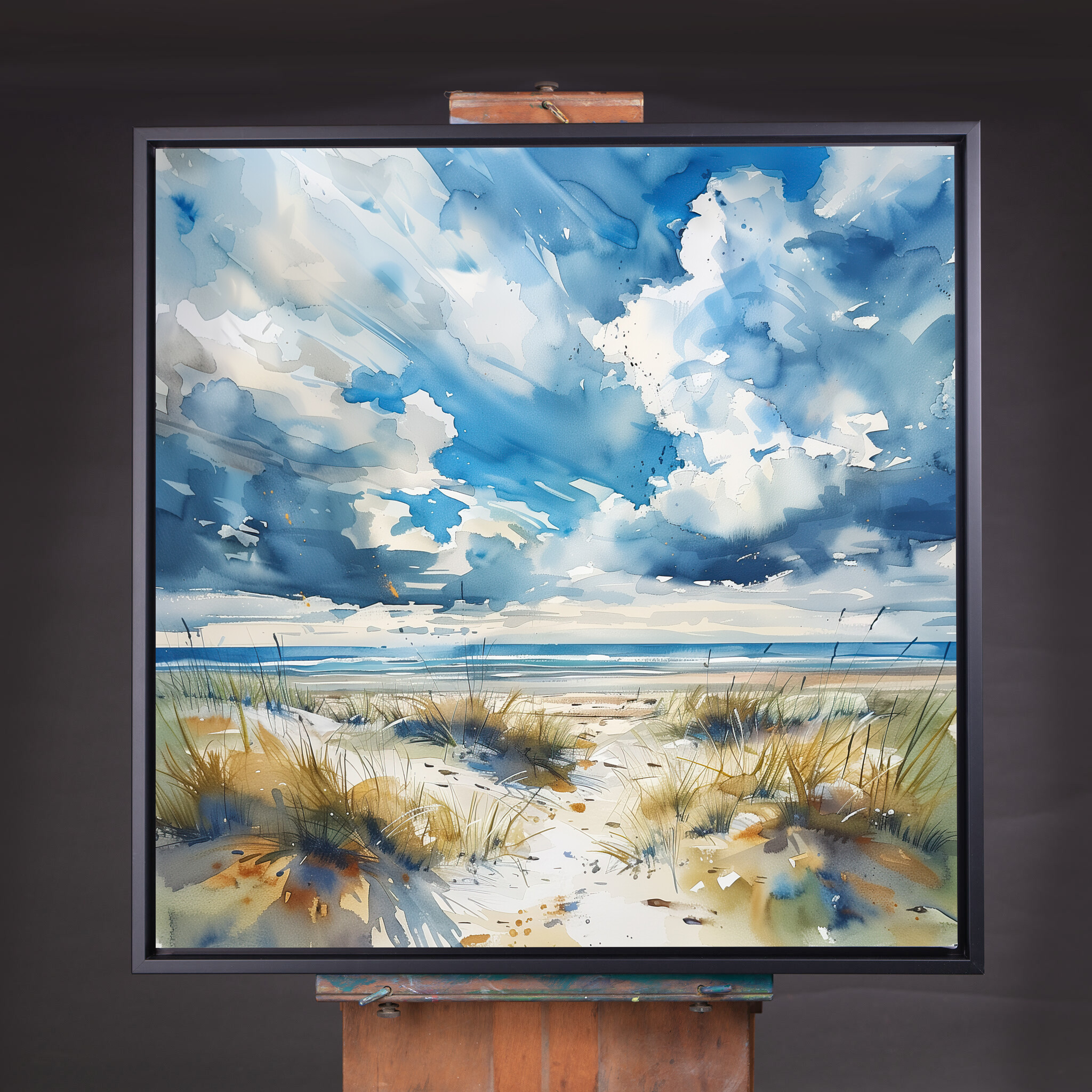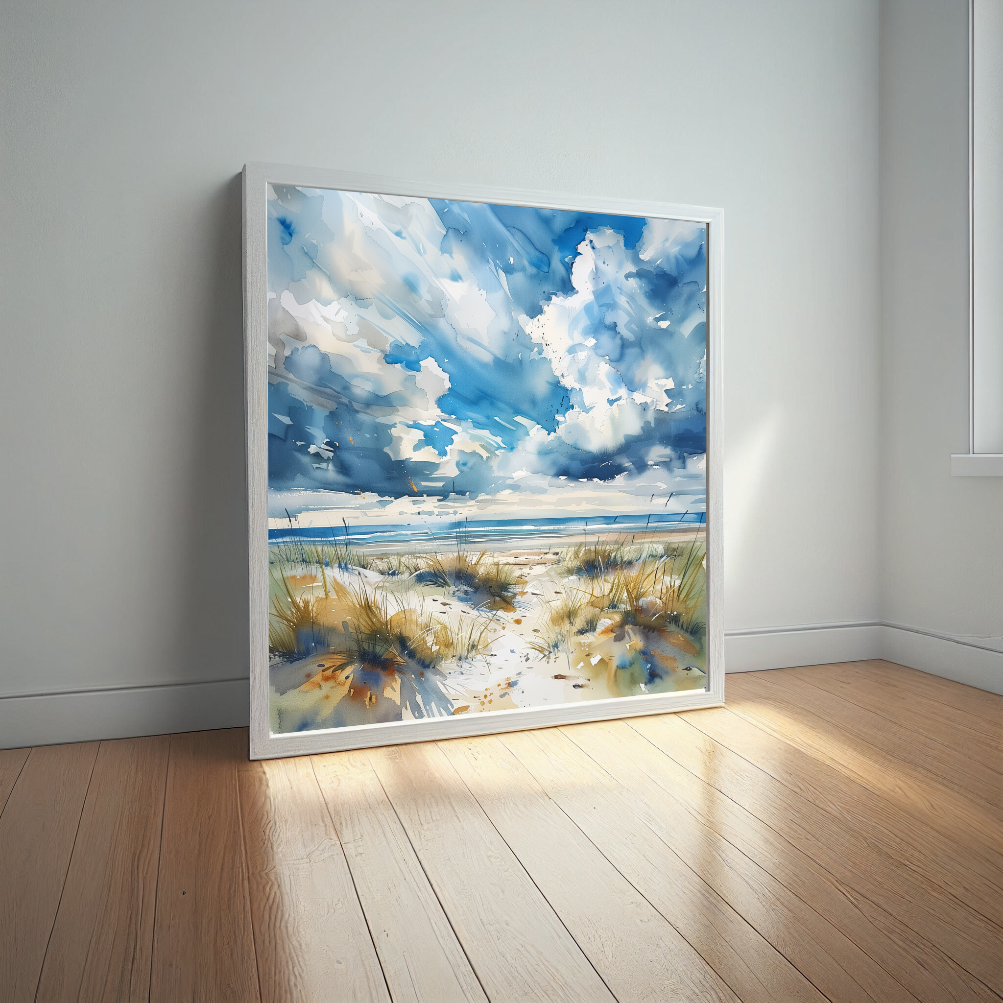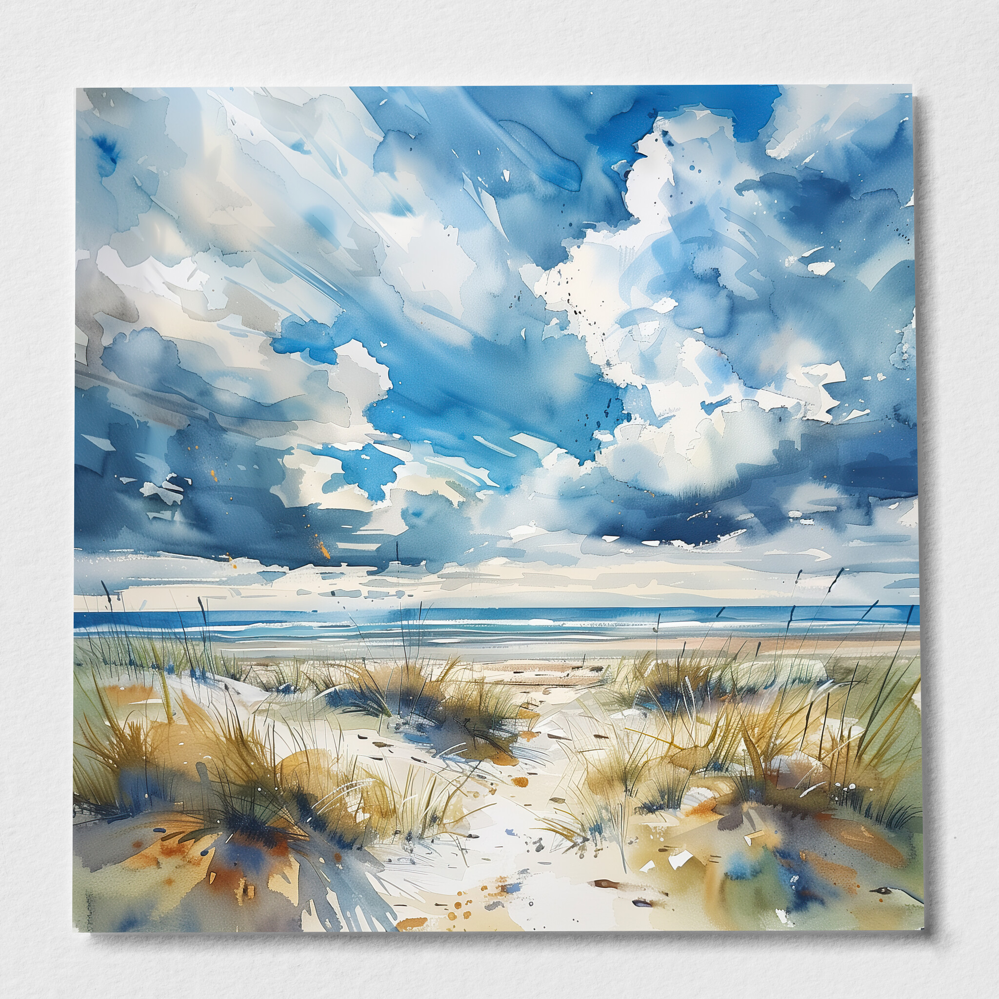 This impressionist artwork beautifully captures the serene ambiance of a Cornwall beach, with its sweeping blue skies and soft, sandy dunes. The fluid brushstrokes convey a sense of movement, reflecting the gentle coastal winds and the rhythmic ebb of the ocean.