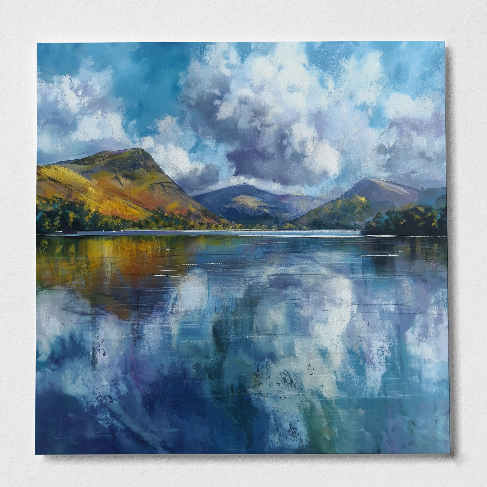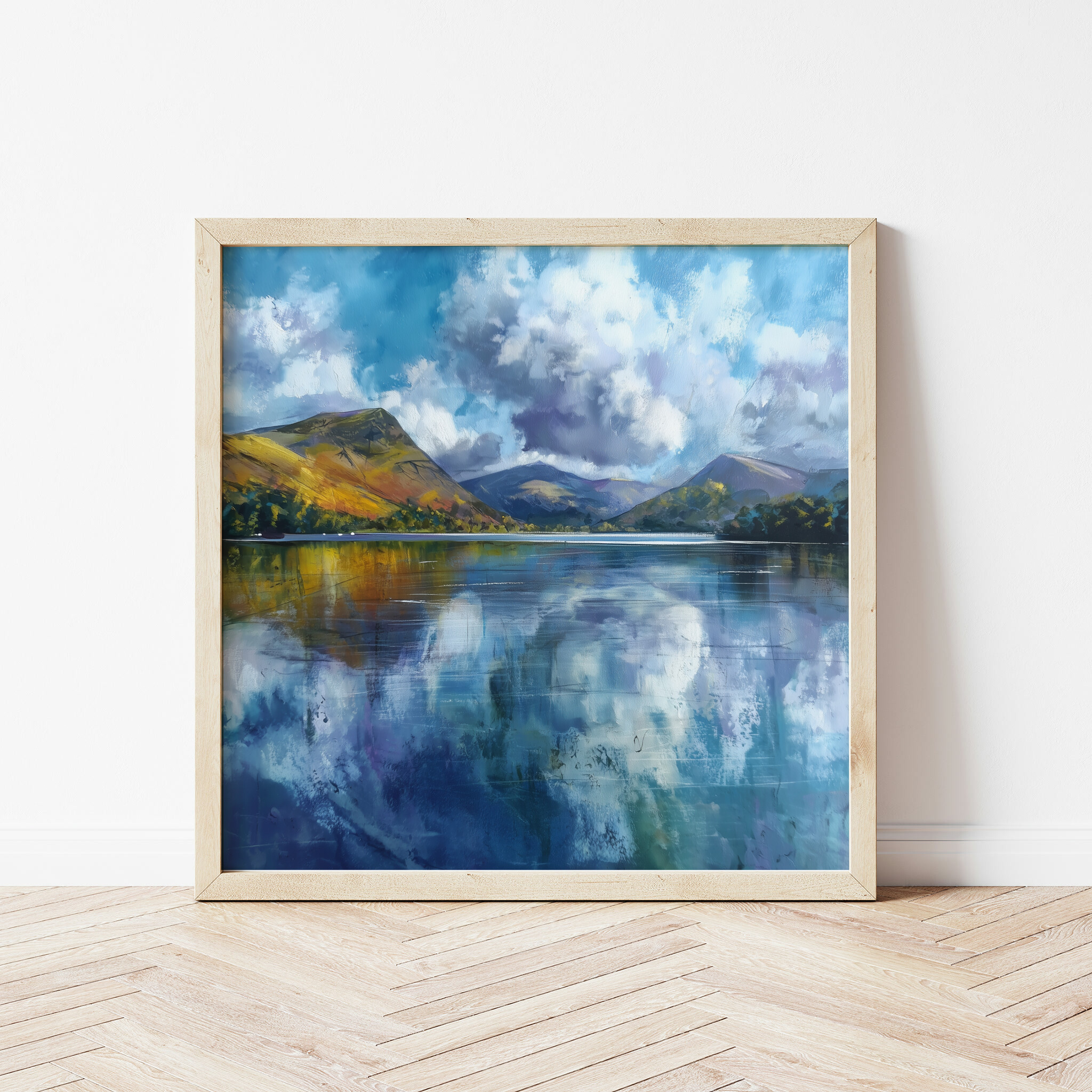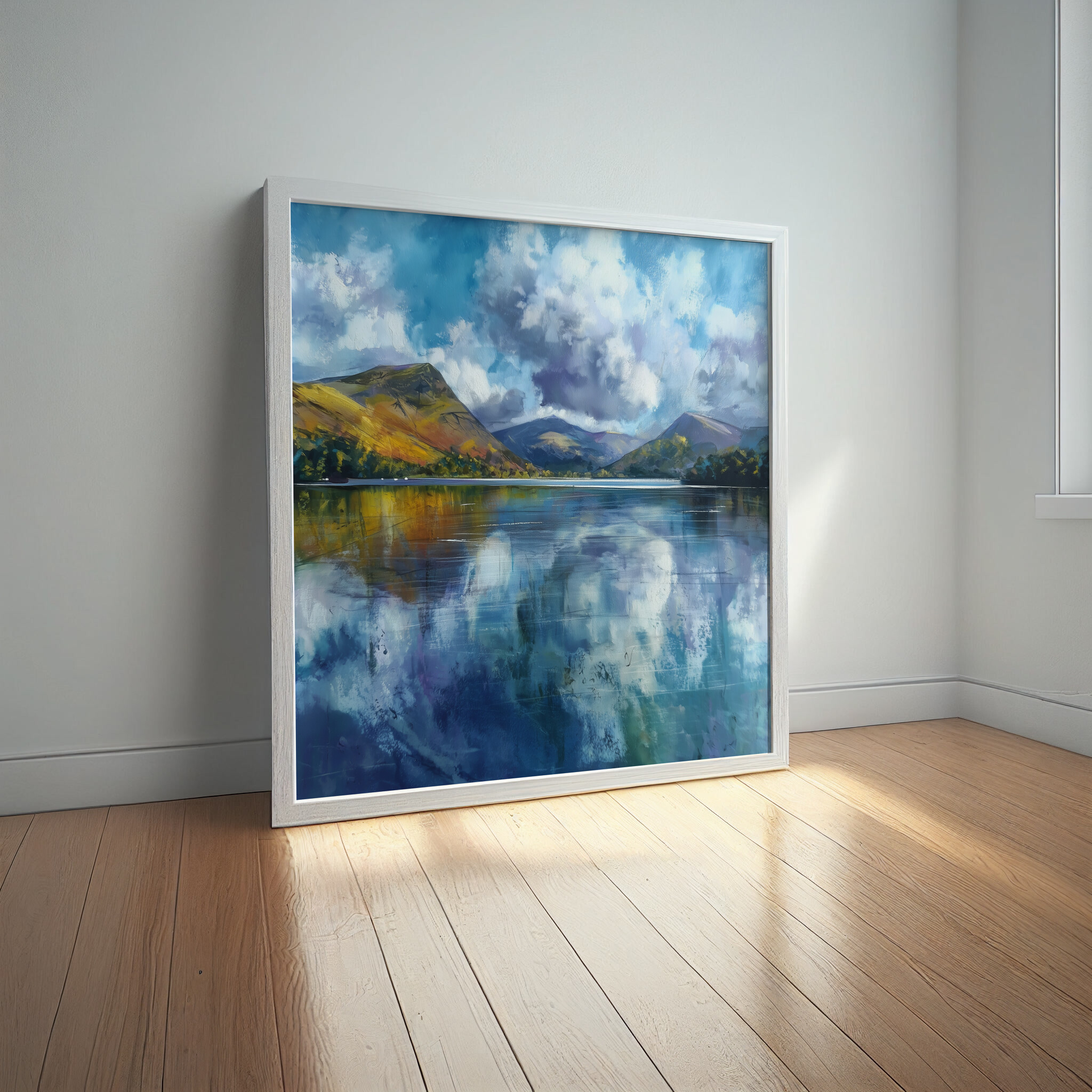 This captivating abstract artwork captures the serene beauty of a Cornwall landscape, blending soft blues and impressionist techniques to depict reflective waters and majestic hills. The tranquil scene is beautifully rendered with calming blue art, perfect for enhancing any space.