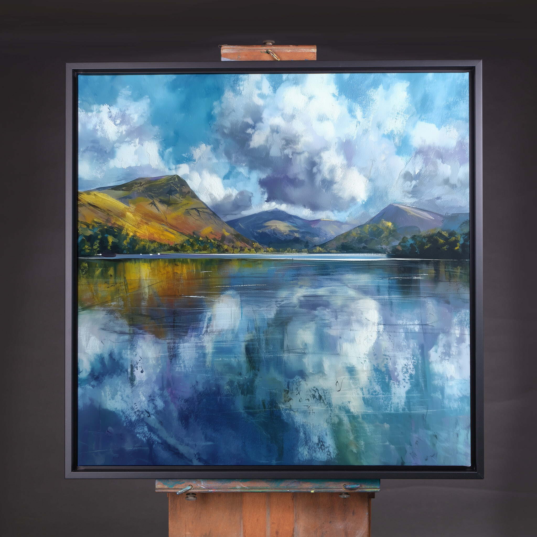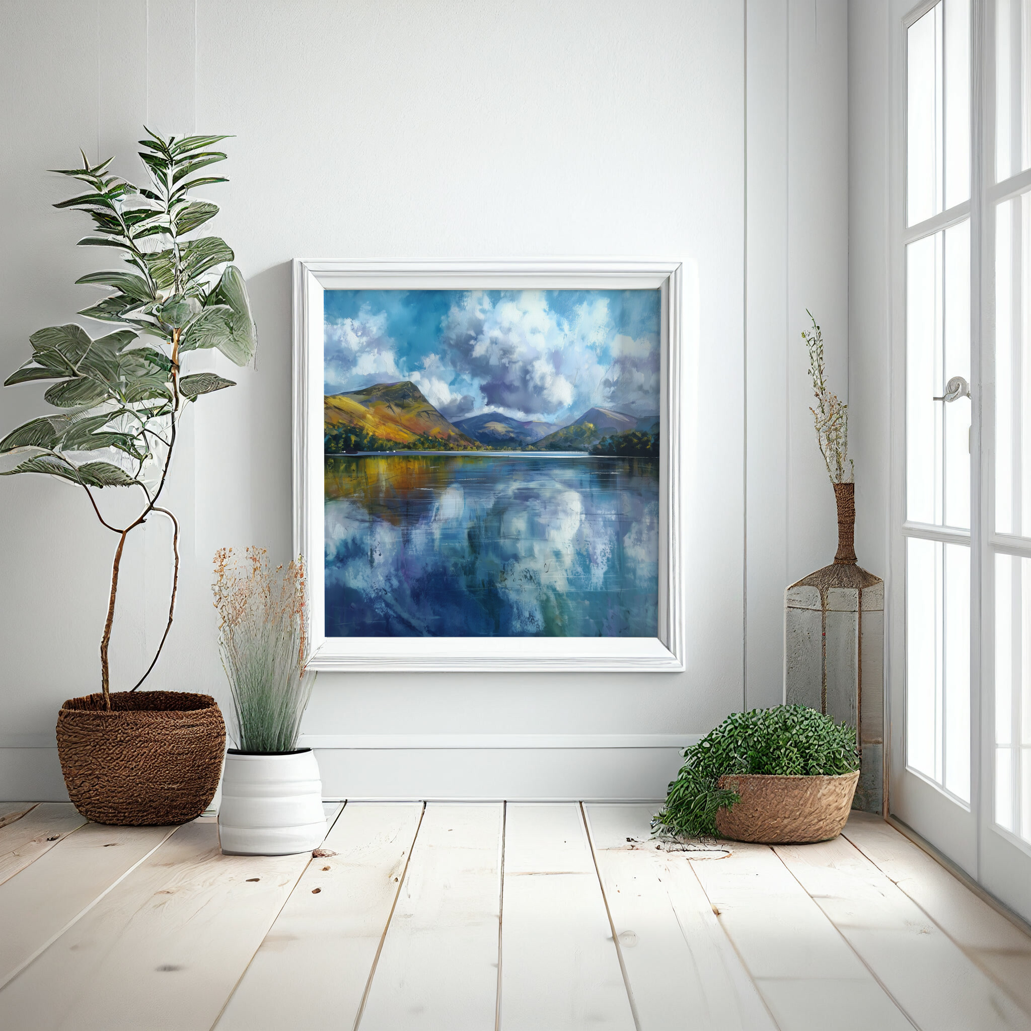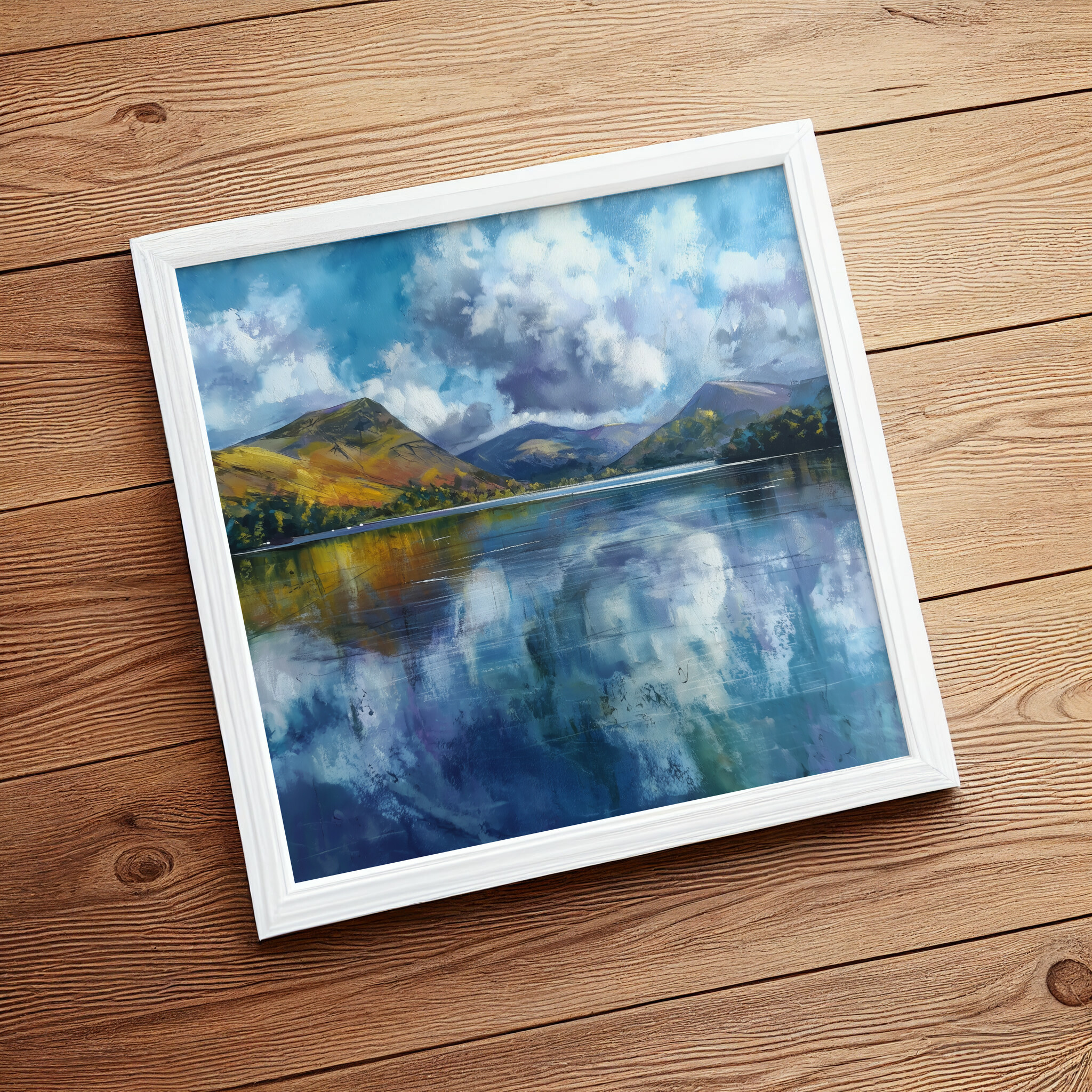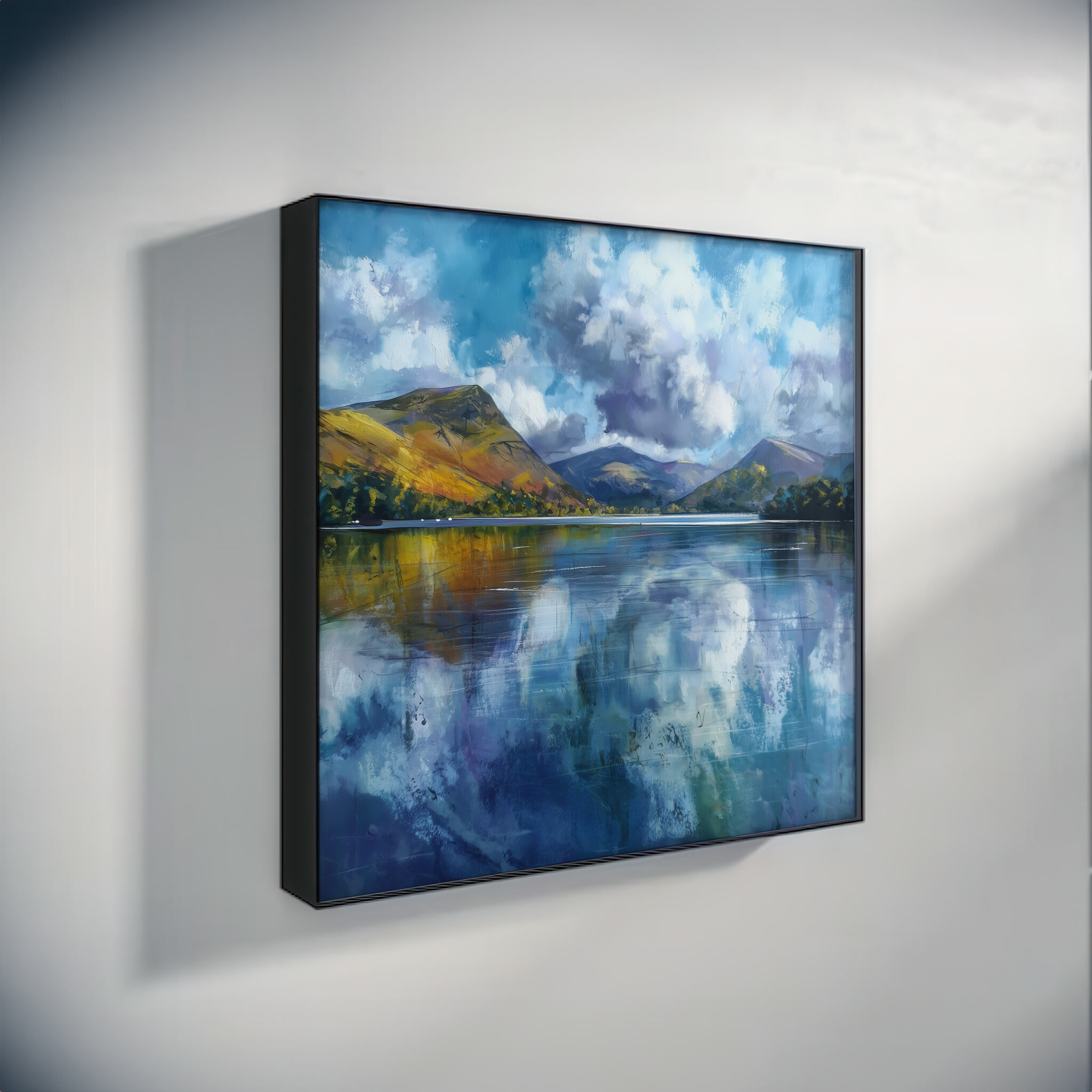 This captivating abstract artwork captures the serene beauty of a Cornwall landscape, blending soft blues and impressionist techniques to depict reflective waters and majestic hills. The tranquil scene is beautifully rendered with calming blue art, perfect for enhancing any space.