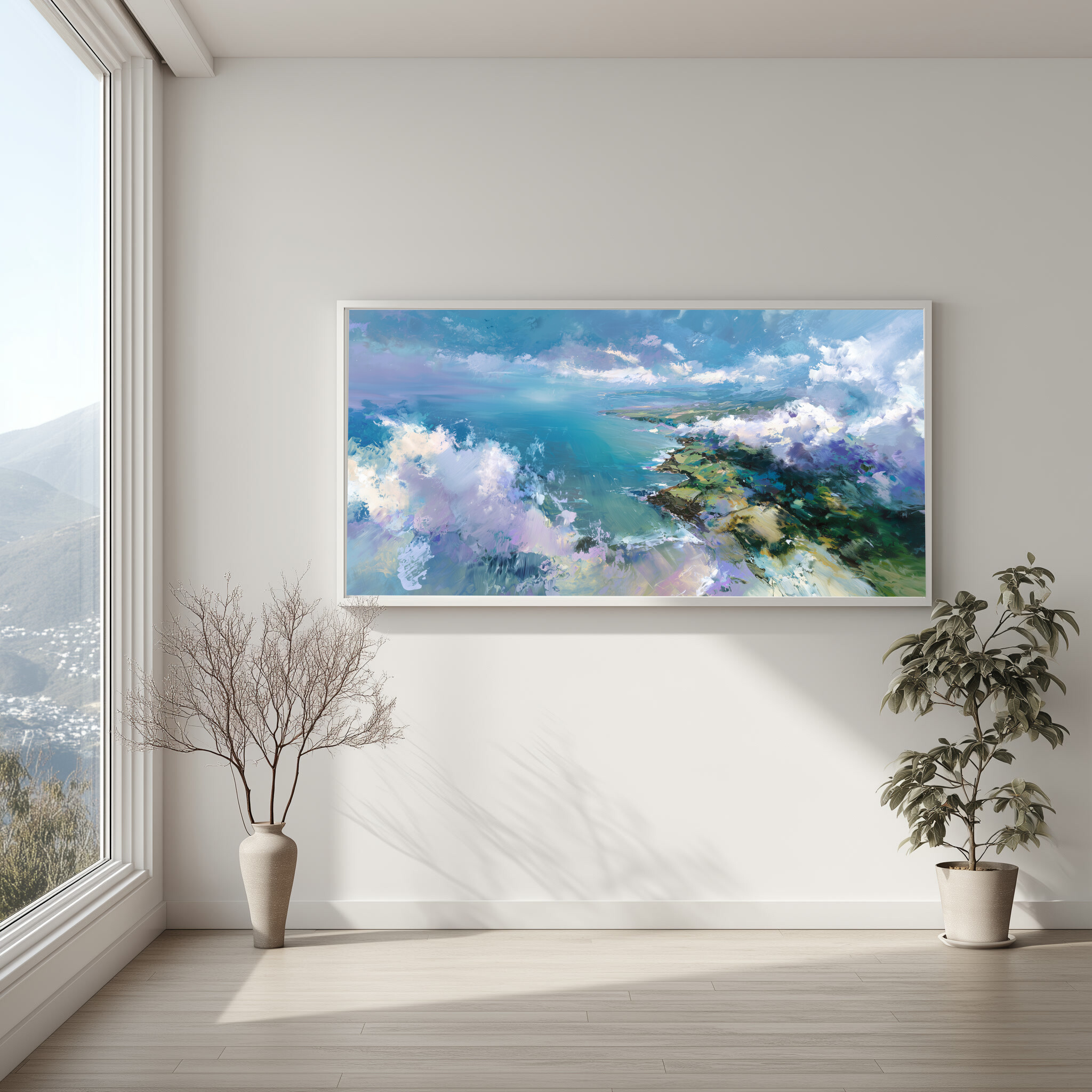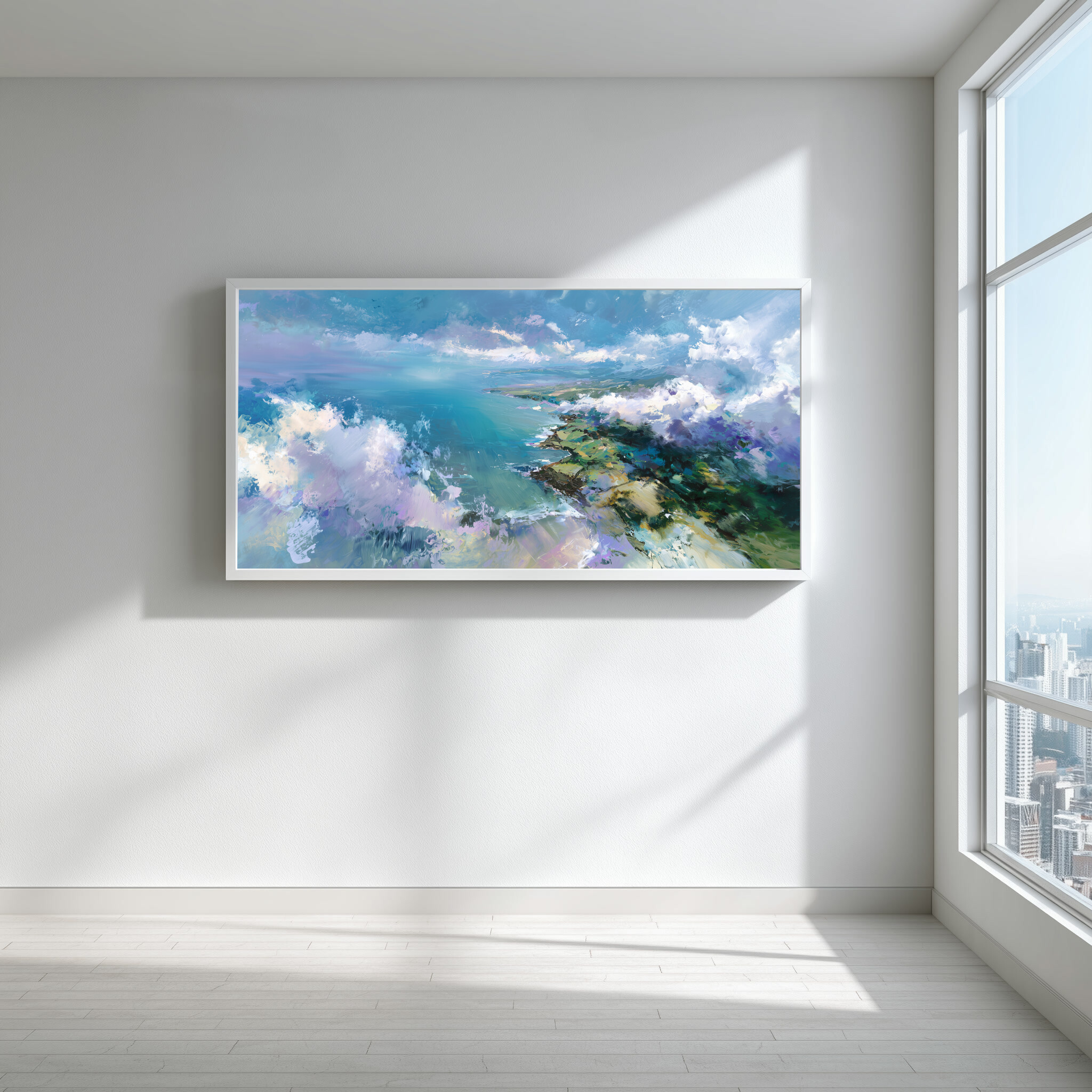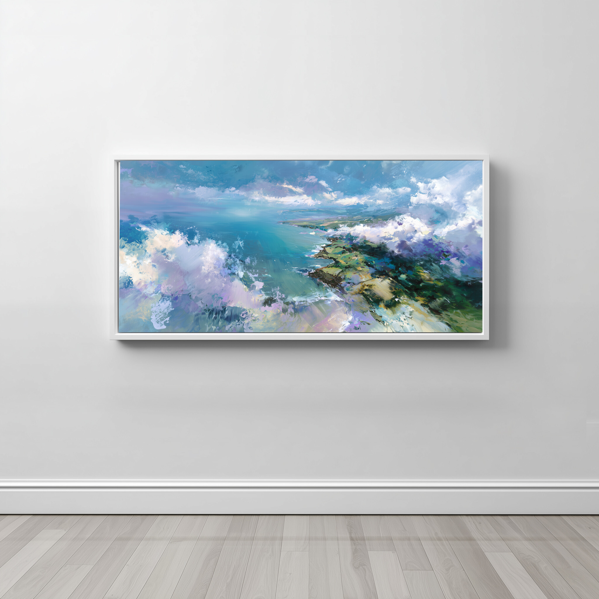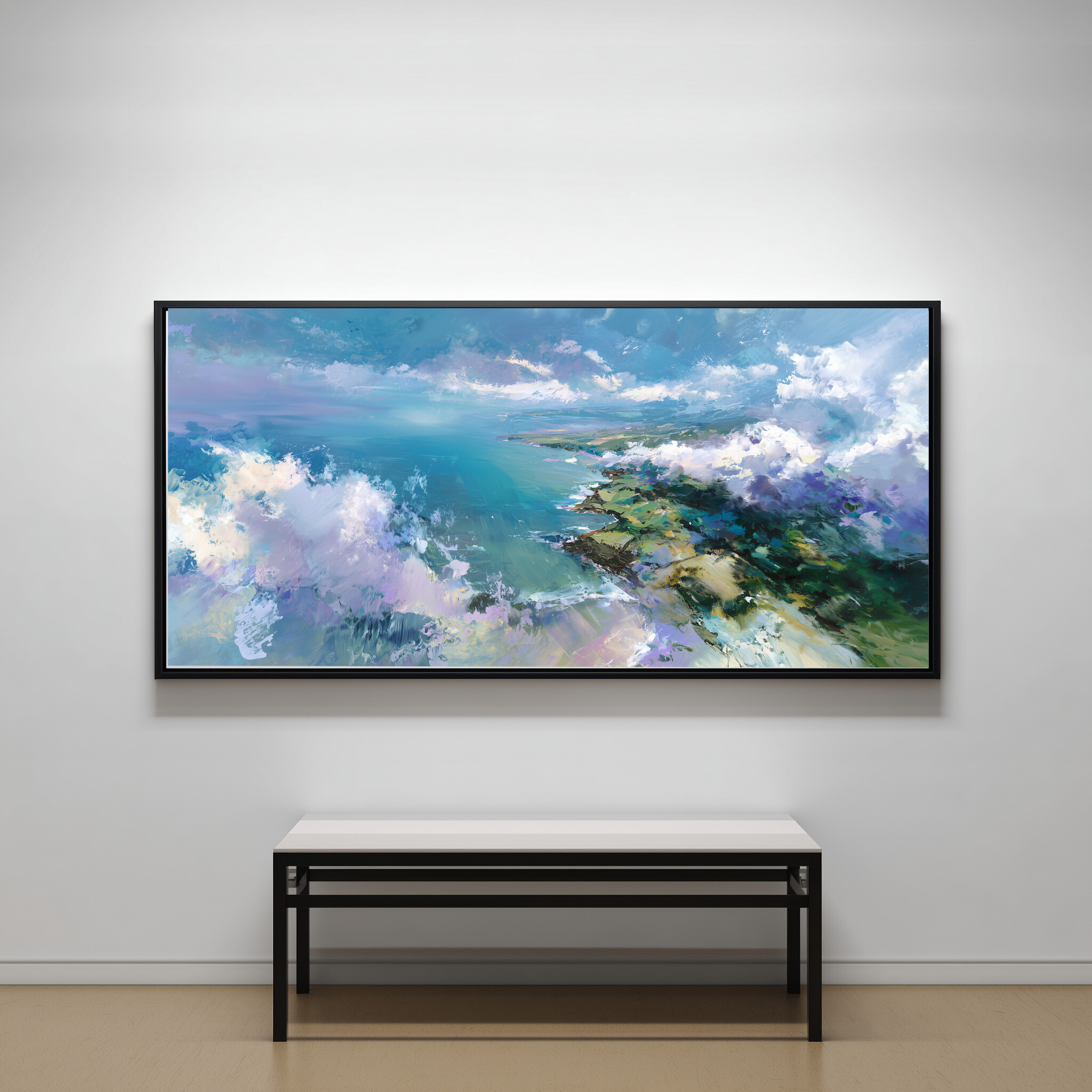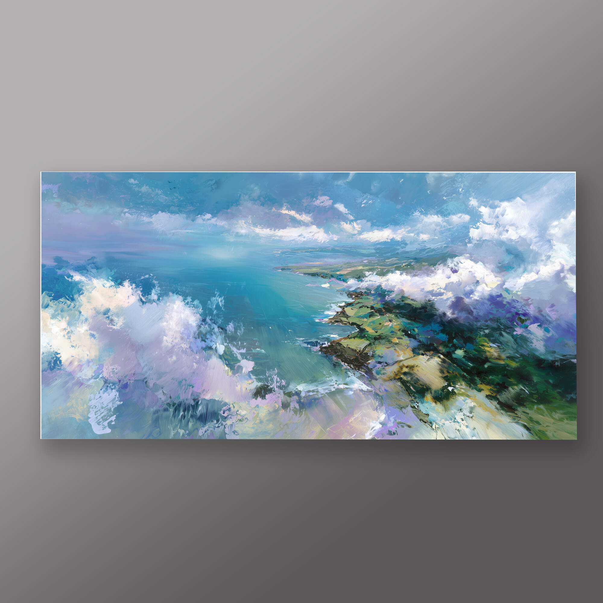 This impressionist painting beautifully captures the ethereal Cornwall coastline, bathed in vivid blue hues. The landscape is an exploration of nature’s grandeur, combining the artistry of sweeping brushstrokes with modern expression. A perfect specimen of blue art, it brings the raw beauty of the British coast into your space.