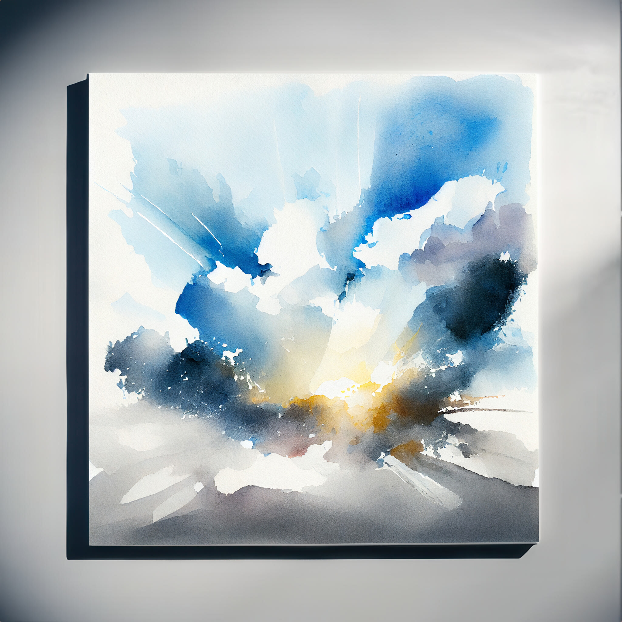 This striking artwork captures a captivating skyscape over Cornwall, rendered in a stunning abstract style. Rich blue hues dance across the canvas, enhanced by subtle gold accents that add warmth and depth. The fluid motion of the sky invokes a sense of serenity and wonder that is sure to captivate any viewer.