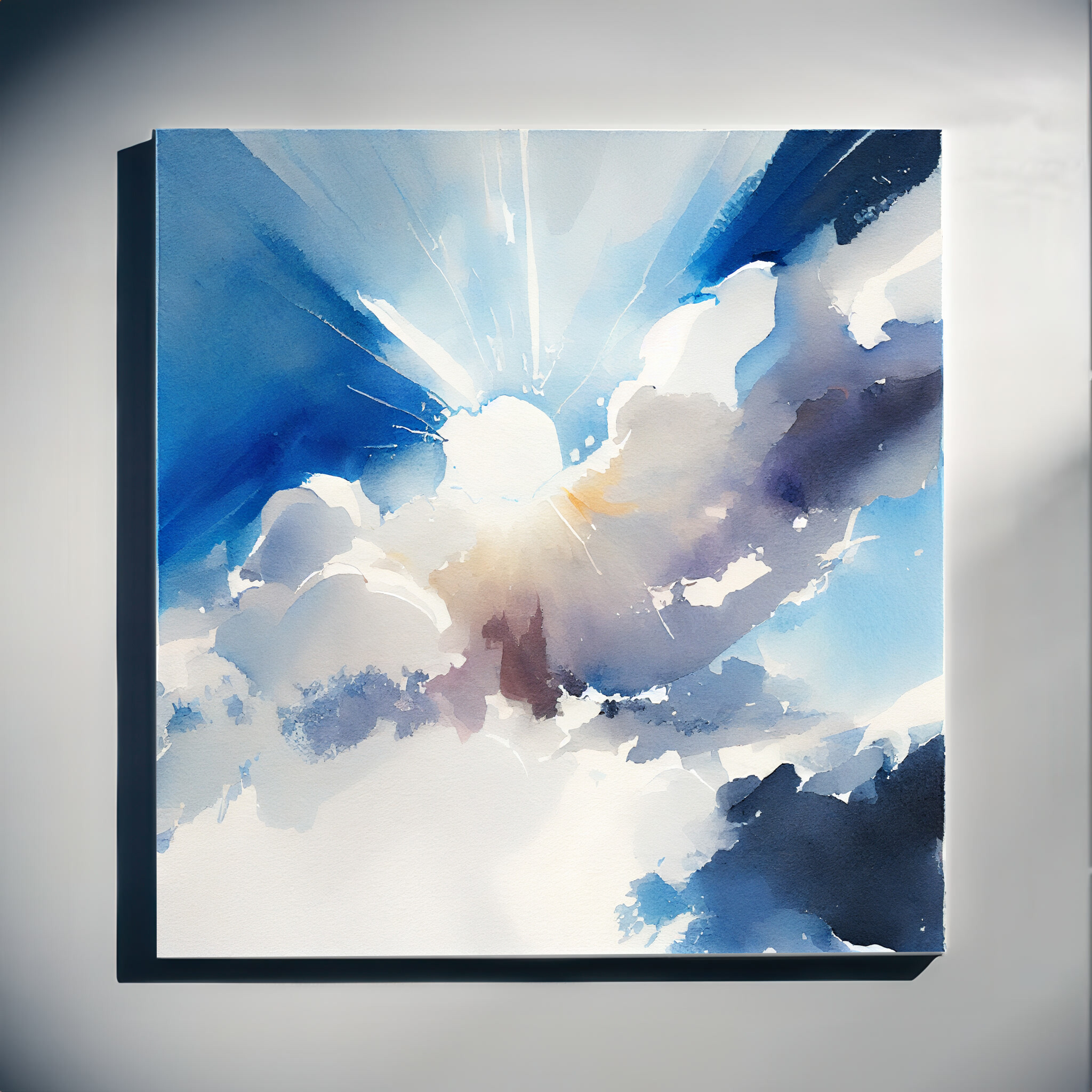 This abstract skyscape captures the ethereal beauty of Cornwall’s dynamic clouds and radiant blue sky. The modern art style brings a sense of movement and freedom, with shades of blue artfully blending to evoke a serene yet uplifting mood.