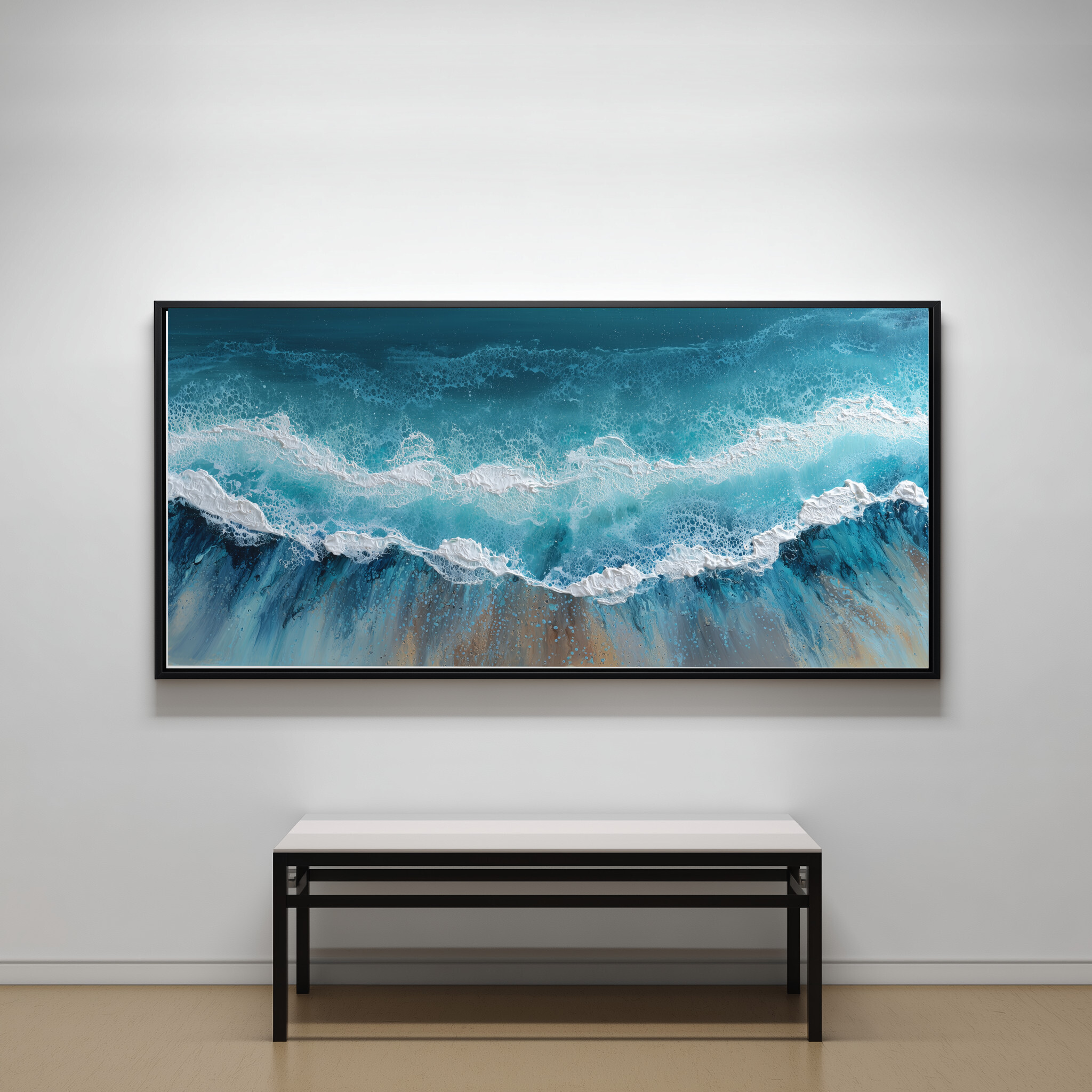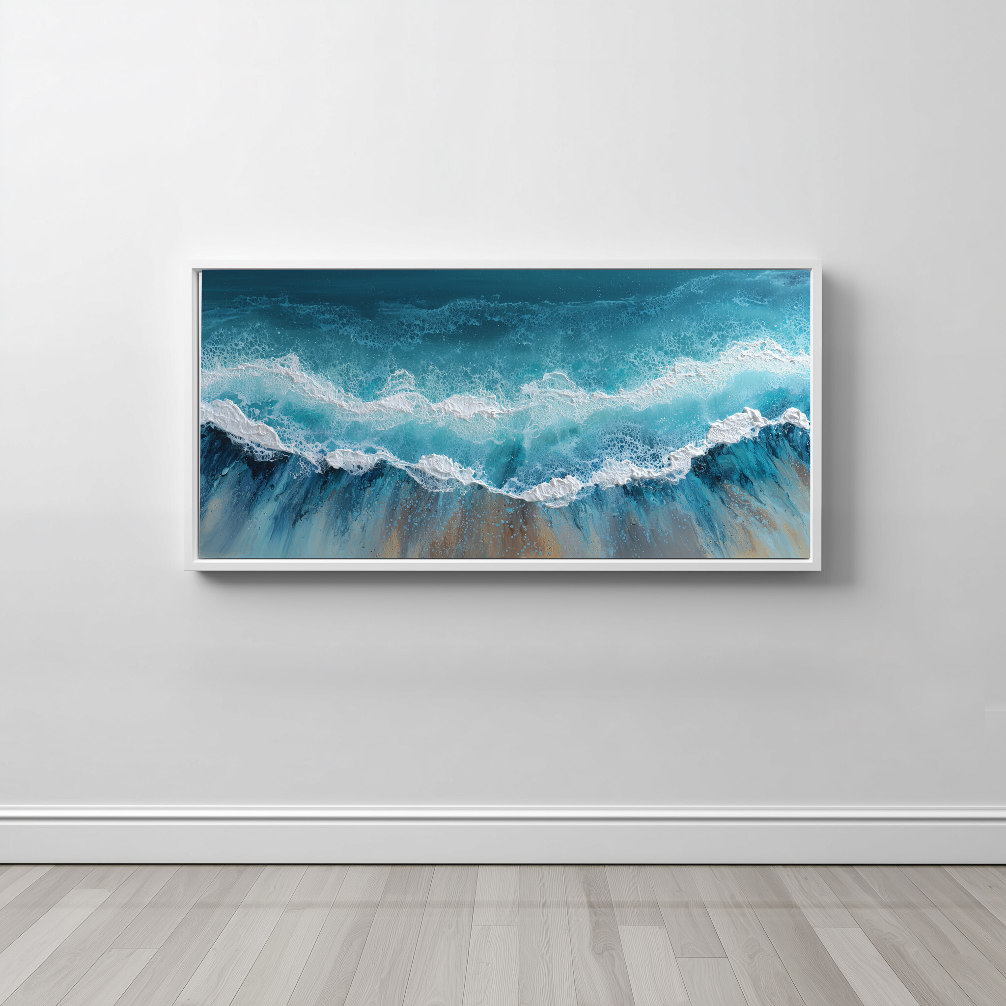 Immerse yourself in the striking abstraction of the ‘Wave From Above’, capturing the essence of Cornwall’s coastline. This stunning piece showcases shades of blue art in a captivating ocean scene. The modern style and dynamic energy make it a perfect addition to any home.