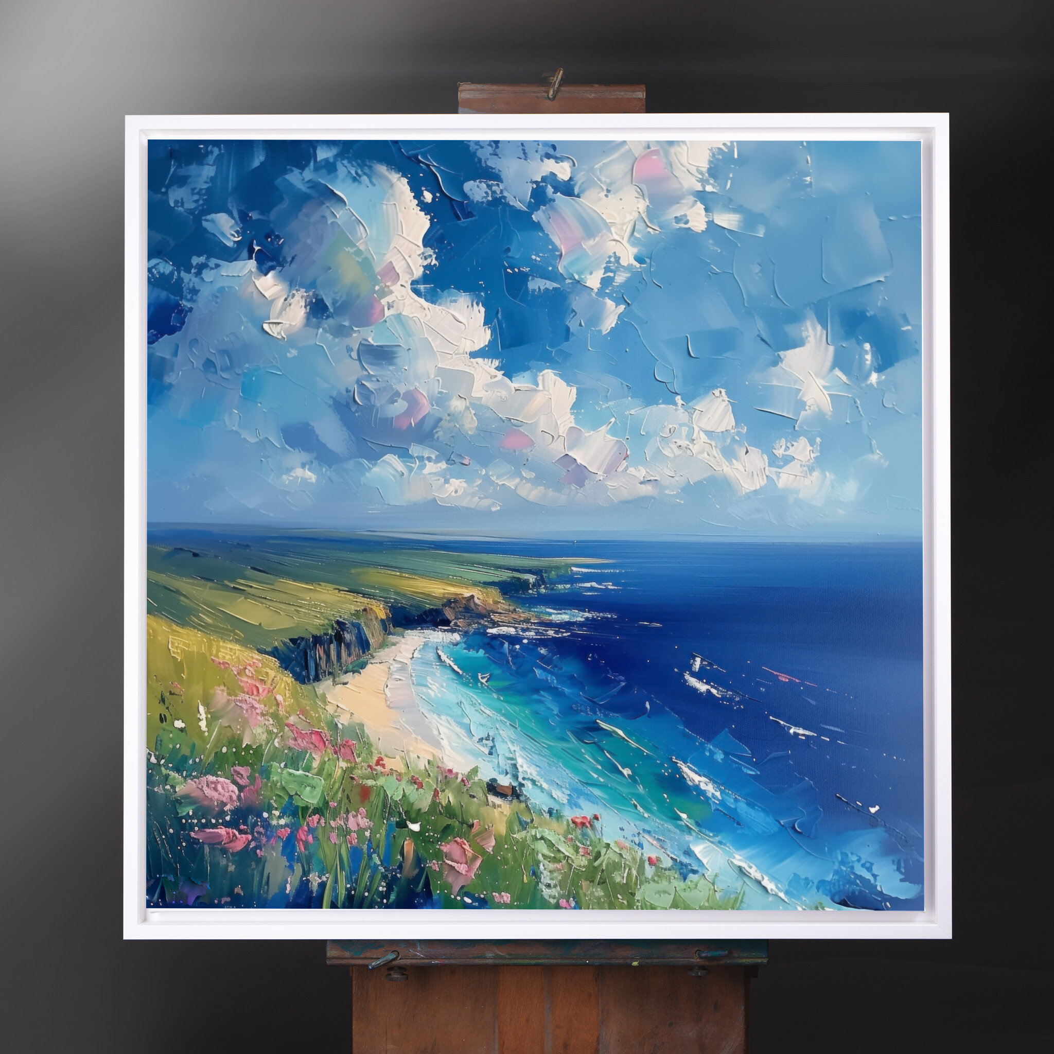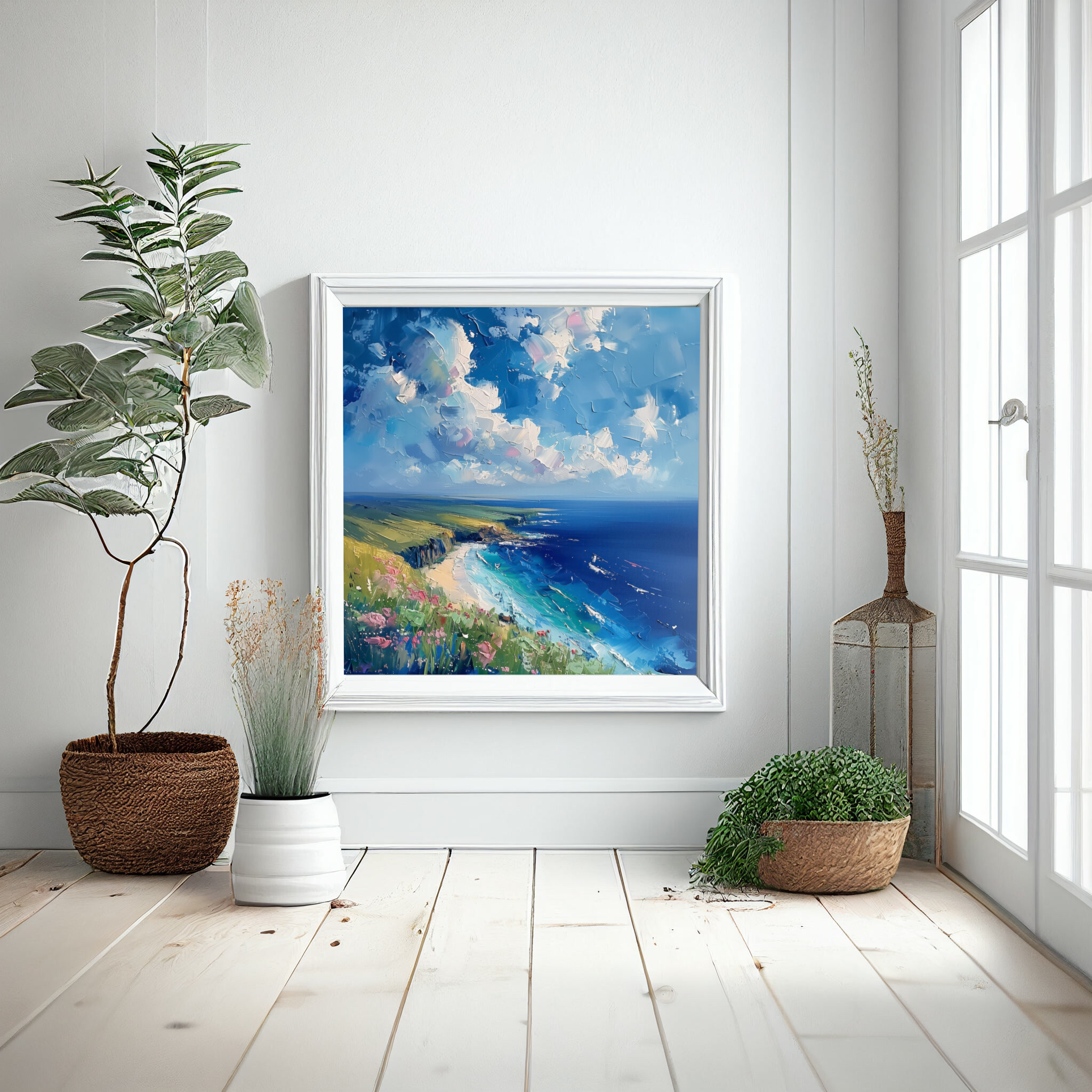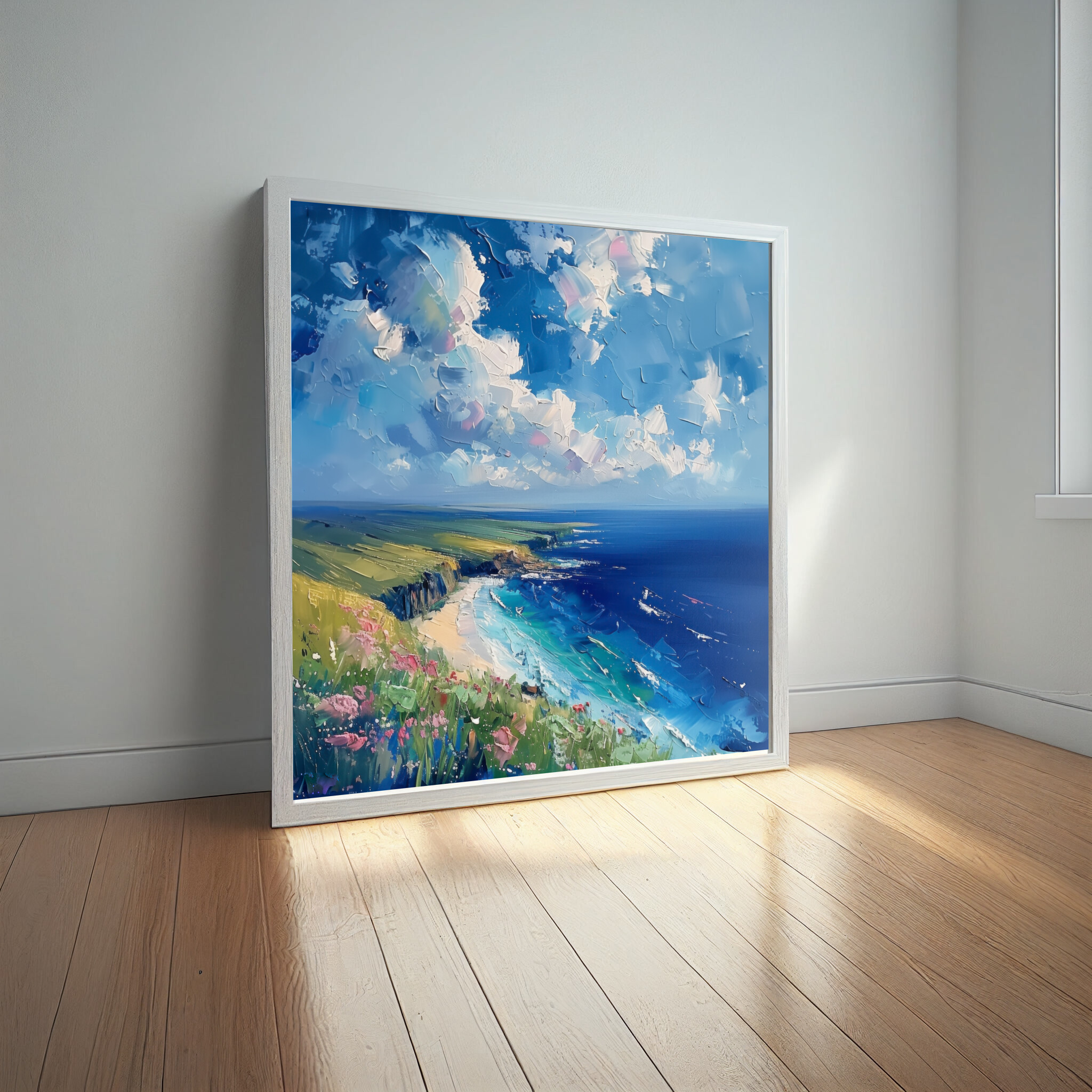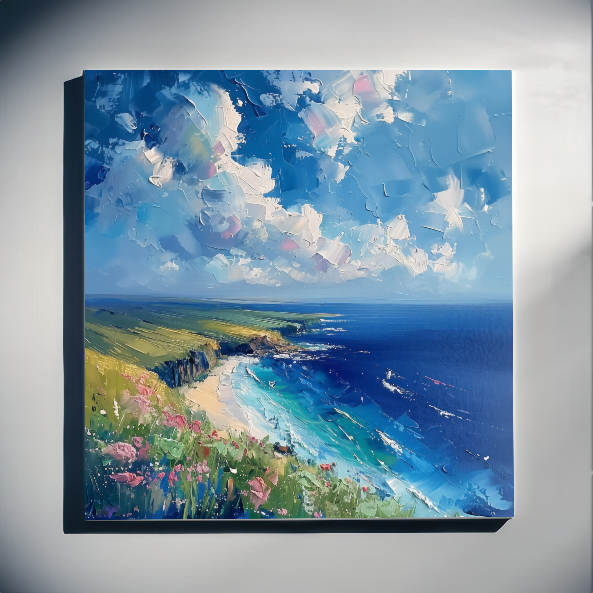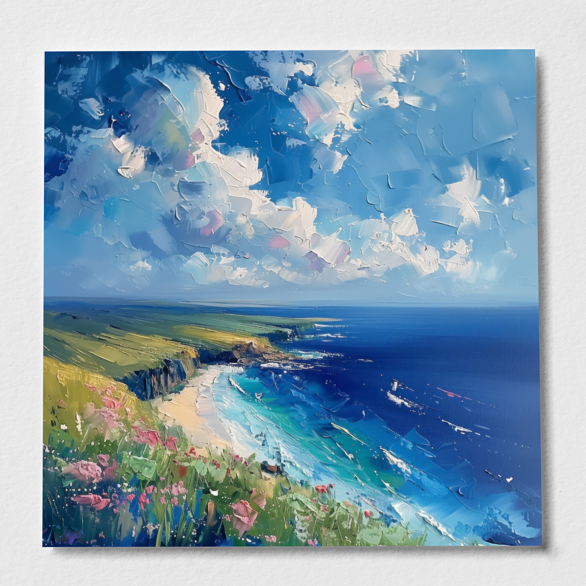 Discover the tranquil beauty of Donegal through this stunning impressionist landscape artwork depicting serene ocean views under a vast, expressive sky. The scene captures the essence of the coast with vibrant blue hues and gentle green pastures, inviting you into a world where nature’s majesty is on full display. This piece exudes a calming energy, perfect for transforming your living room, enhancing a beach decor theme, or bringing a touch of the coast into your office space. Its lively colours and impressionist style make it an engaging centrepiece. An ideal gift for art lovers, or a thoughtful housewarming gift for anyone wishing to capture the beauty of Donegal’s coastline. Available as wall art, this canvas print offers a slice of serene coastal life, sure to delight those who appreciate nature’s wonders.