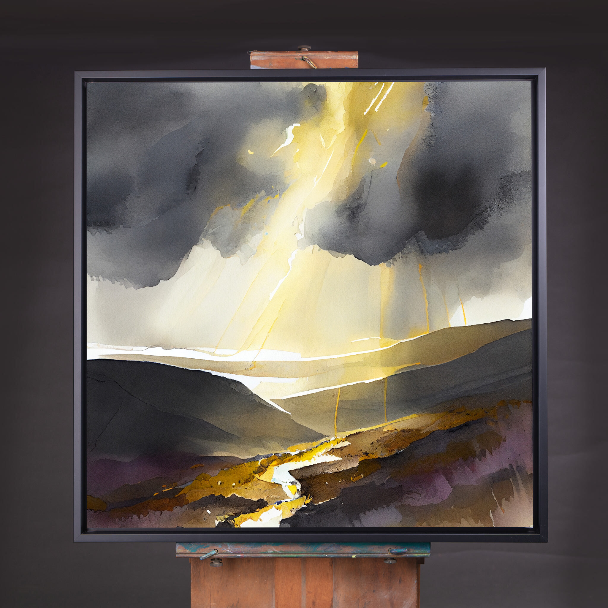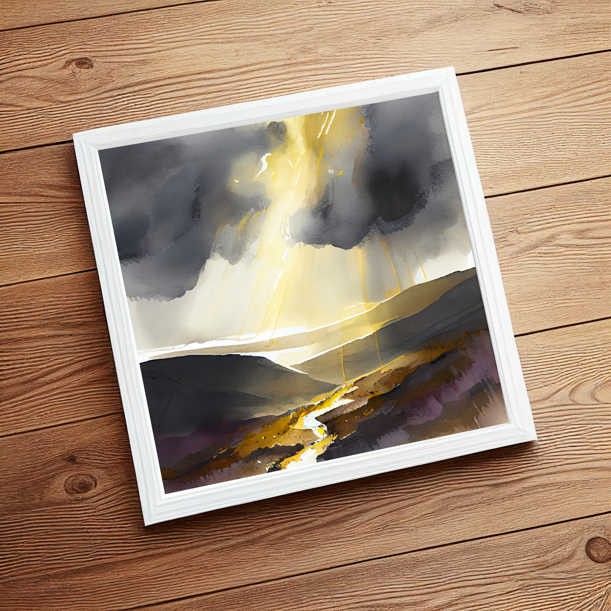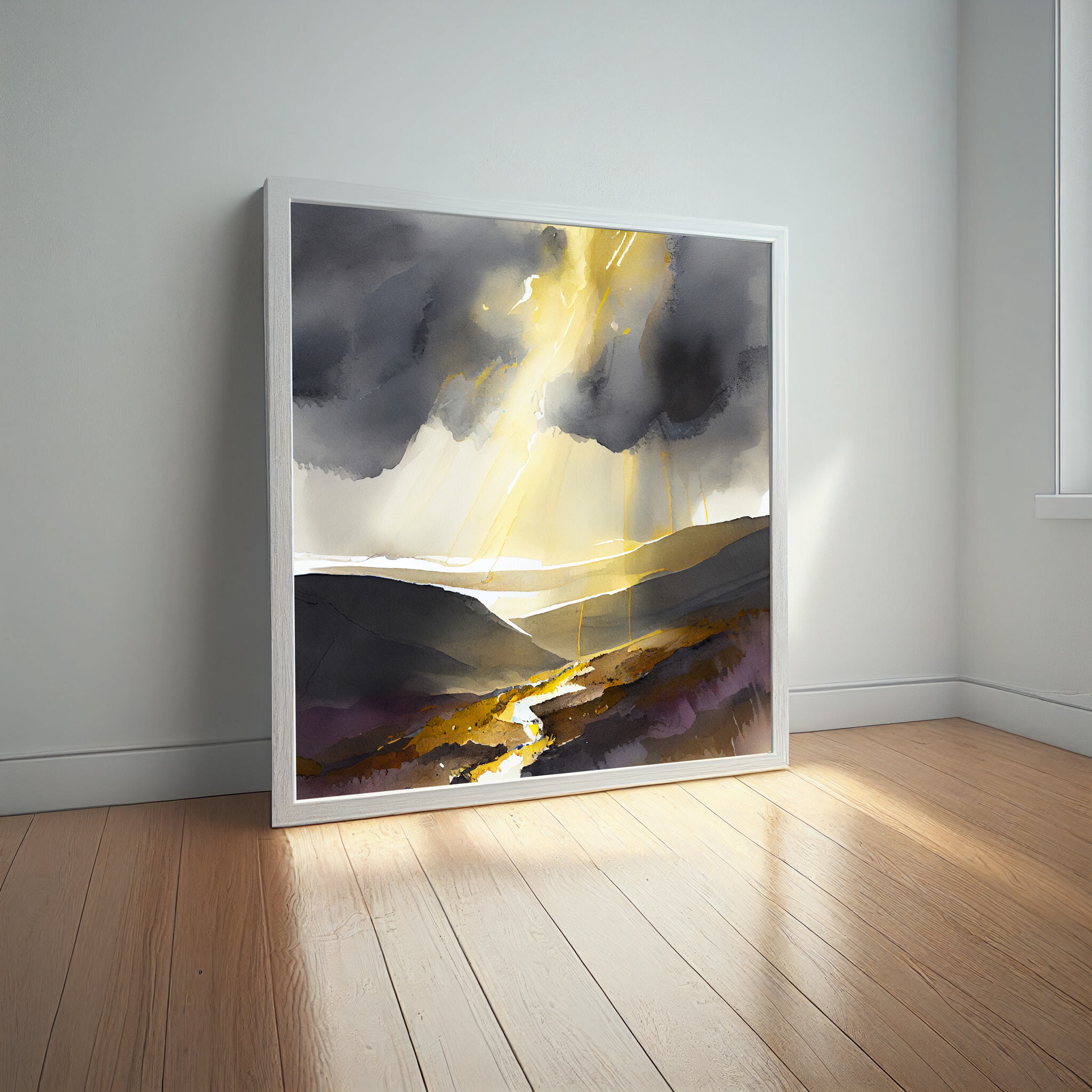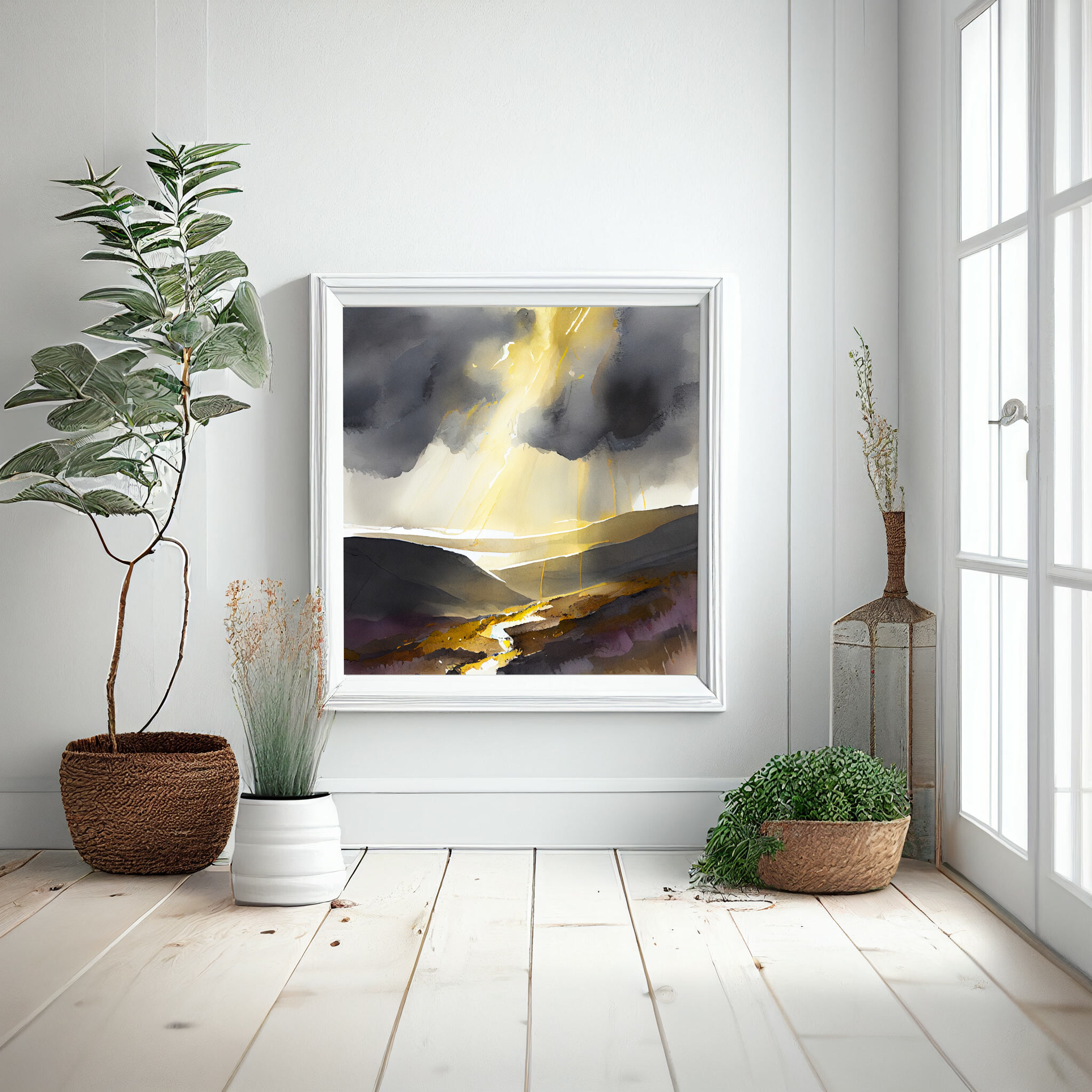 This evocative abstract piece captures the wild beauty of Exmoor, where beams of golden light pierce through dramatic grey clouds. The painting’s grey art hues and gold accents perfectly embody the essence of the landscape, creating a harmonious blend of abstraction and reality.