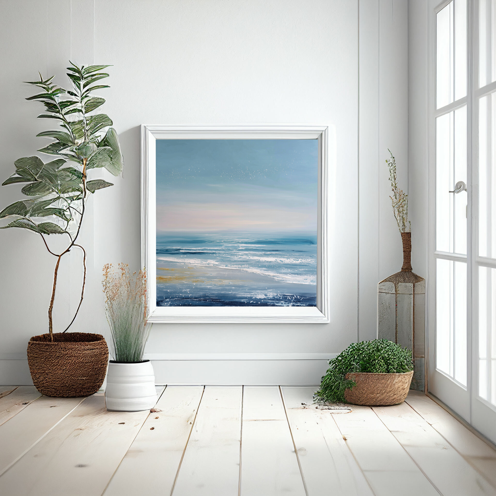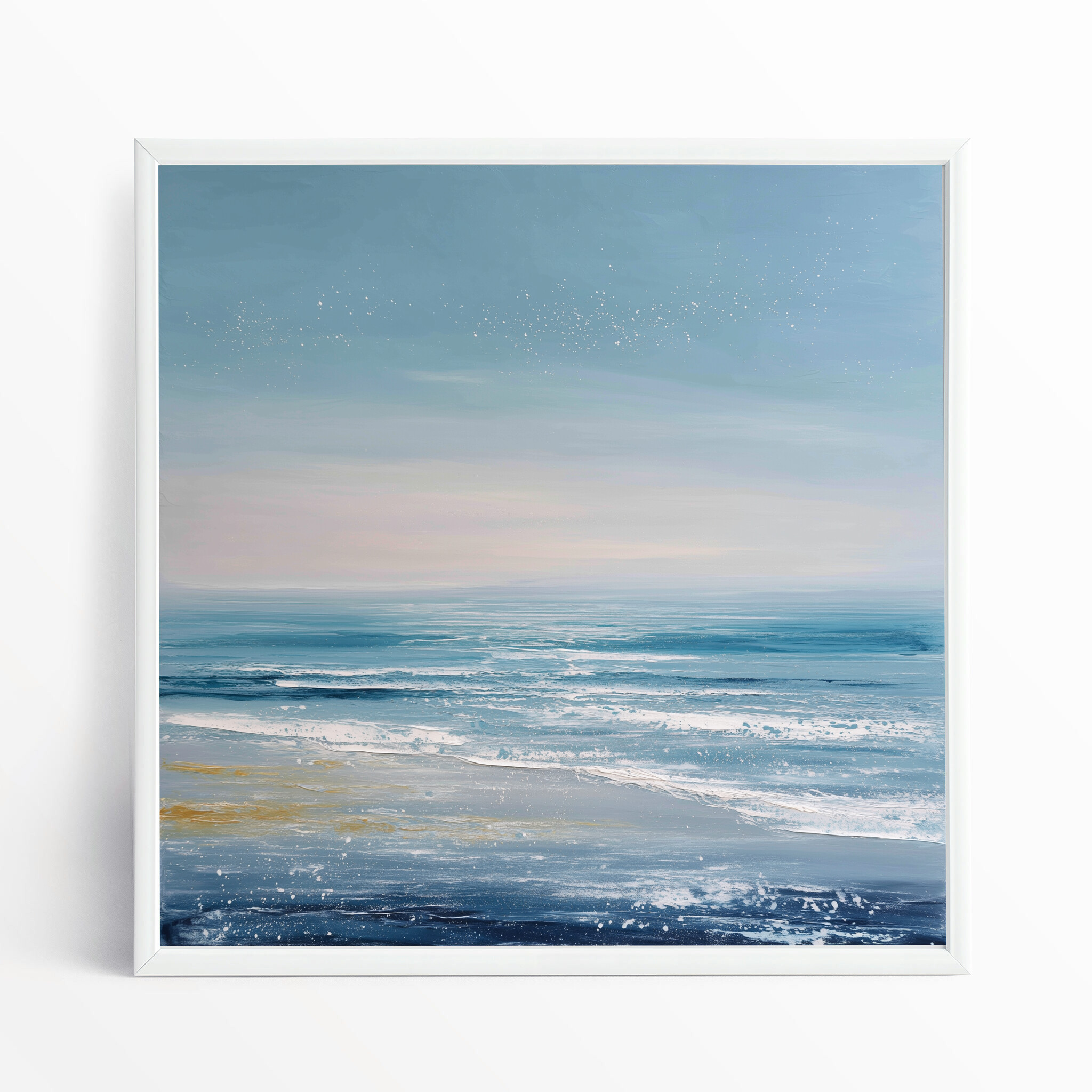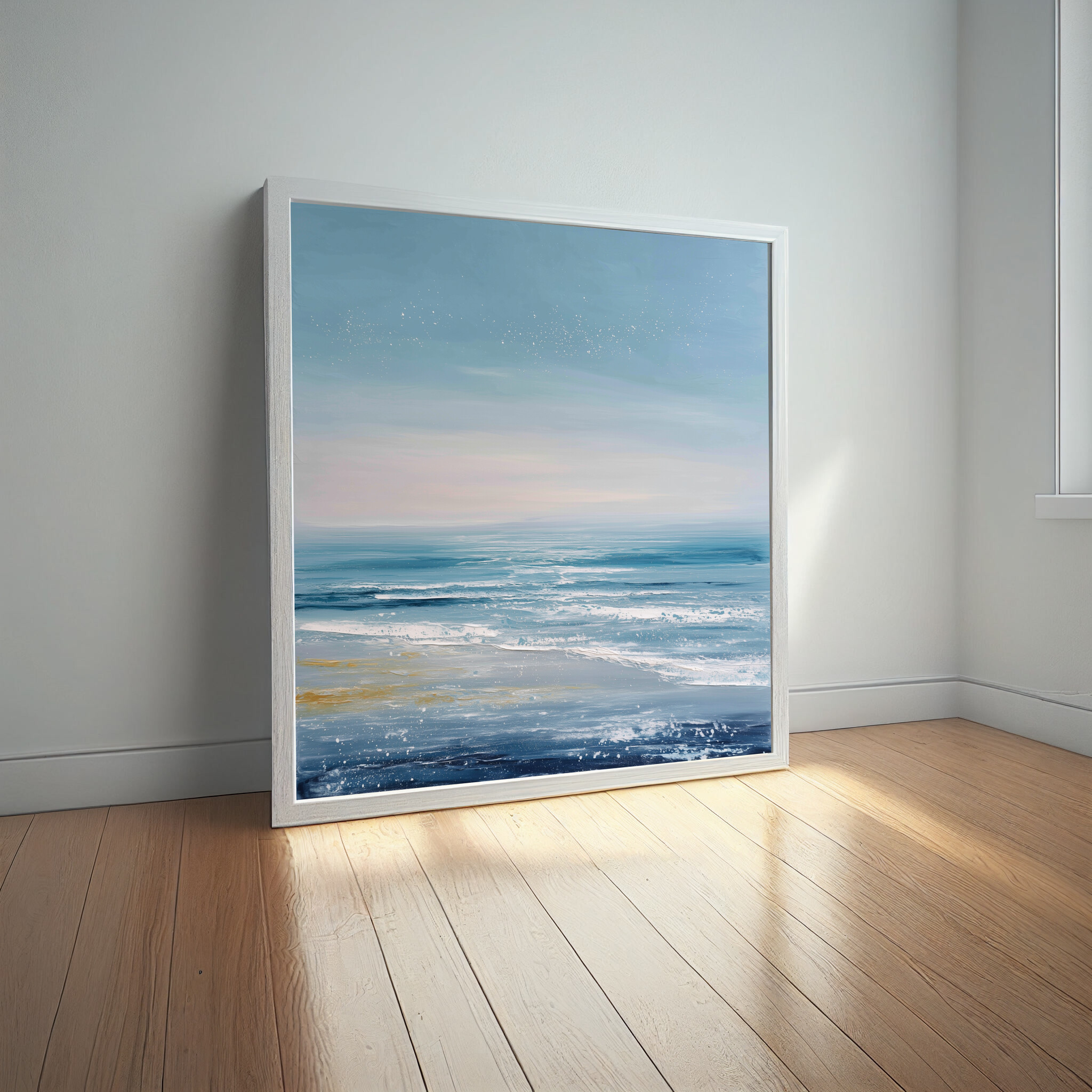 This abstract artwork captures the essence of the sea with soothing blue tones and a serene coastal landscape. The style beautifully combines abstract and minimalist elements, perfect for those who appreciate the calming presence of the sea. It brings a modern touch to any decor.