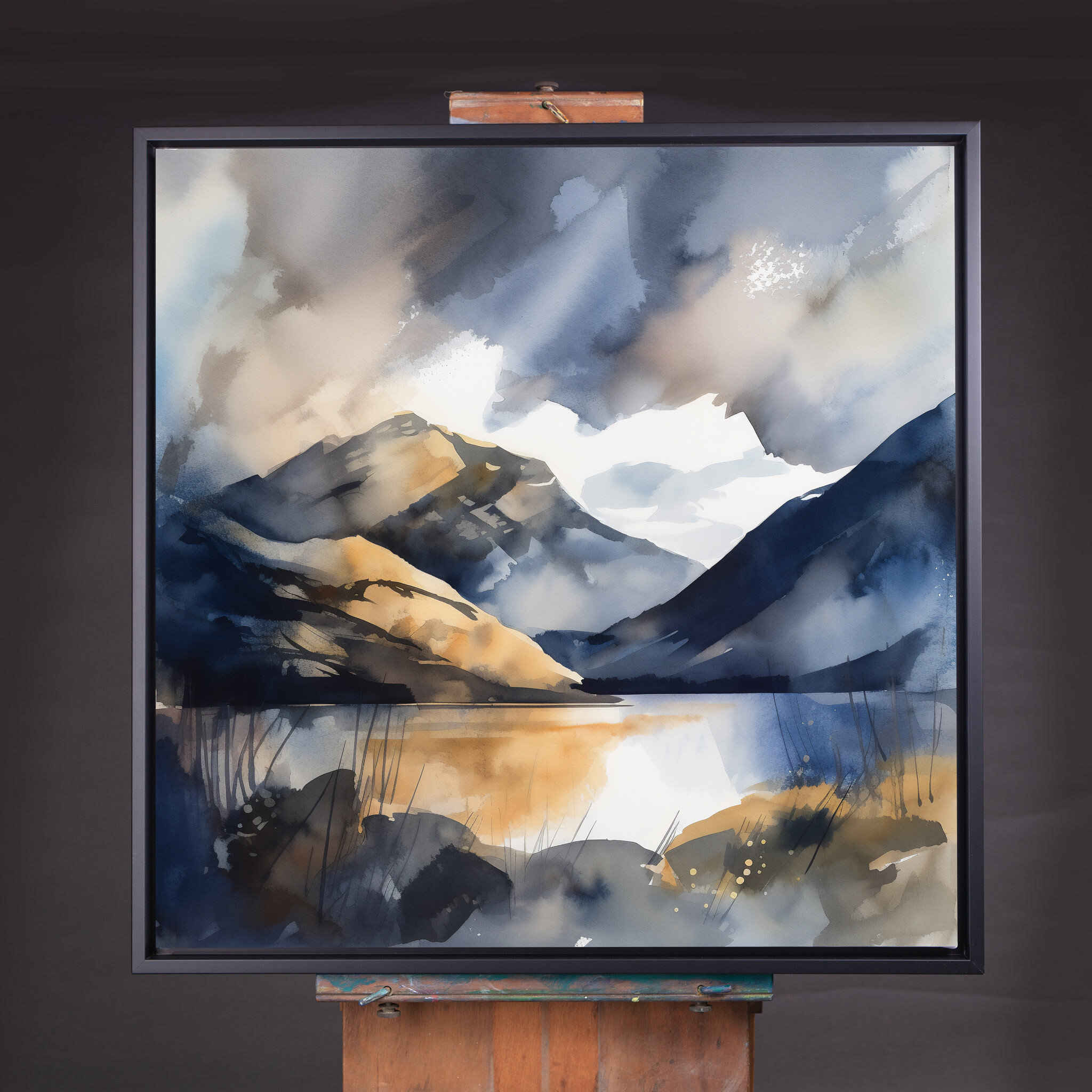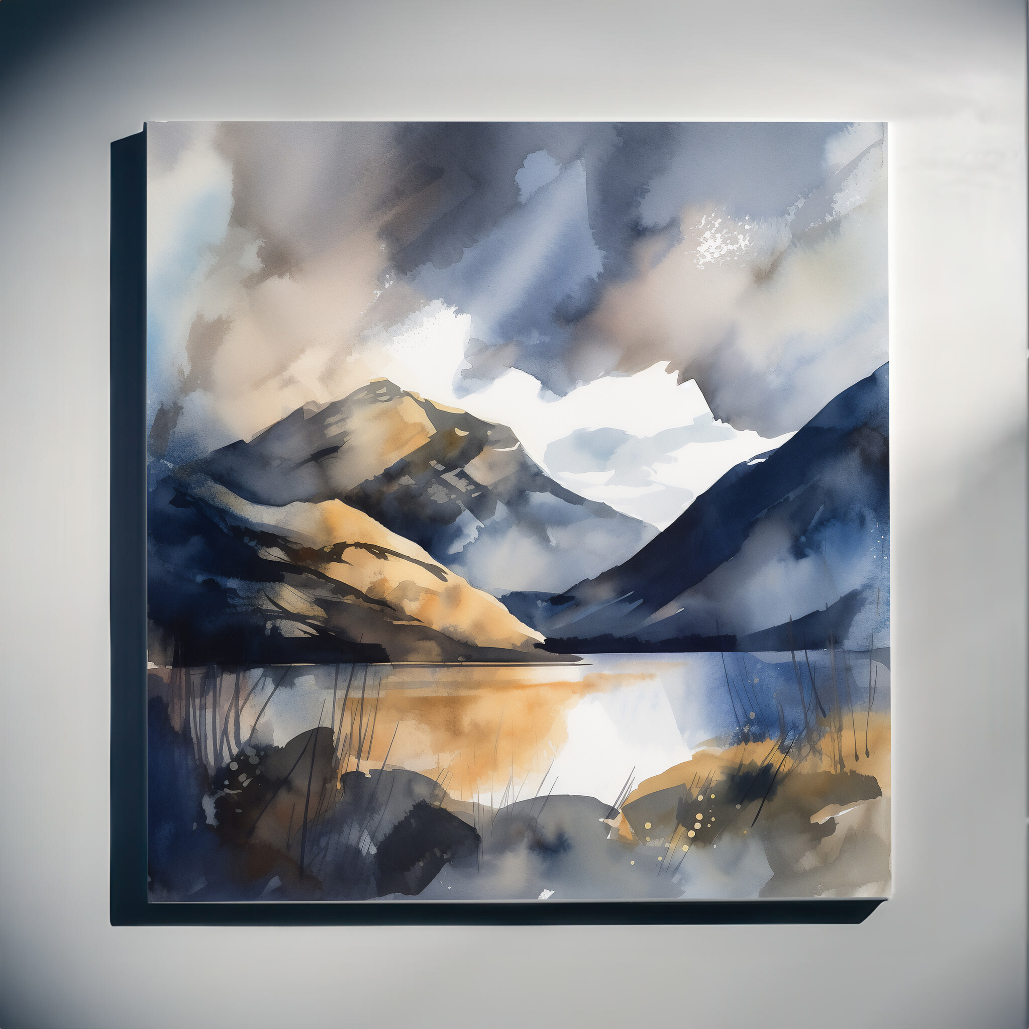 This abstract landscape captures the serene beauty of the Lake District with its magnificent mountains reflected in tranquil waters. Painted in soothing blue and earth tones, the artwork carries a peaceful and contemplative mood, making it a perfect piece for your living room. Let the calming hues transform your space, bringing a touch of nature and tranquility indoors.