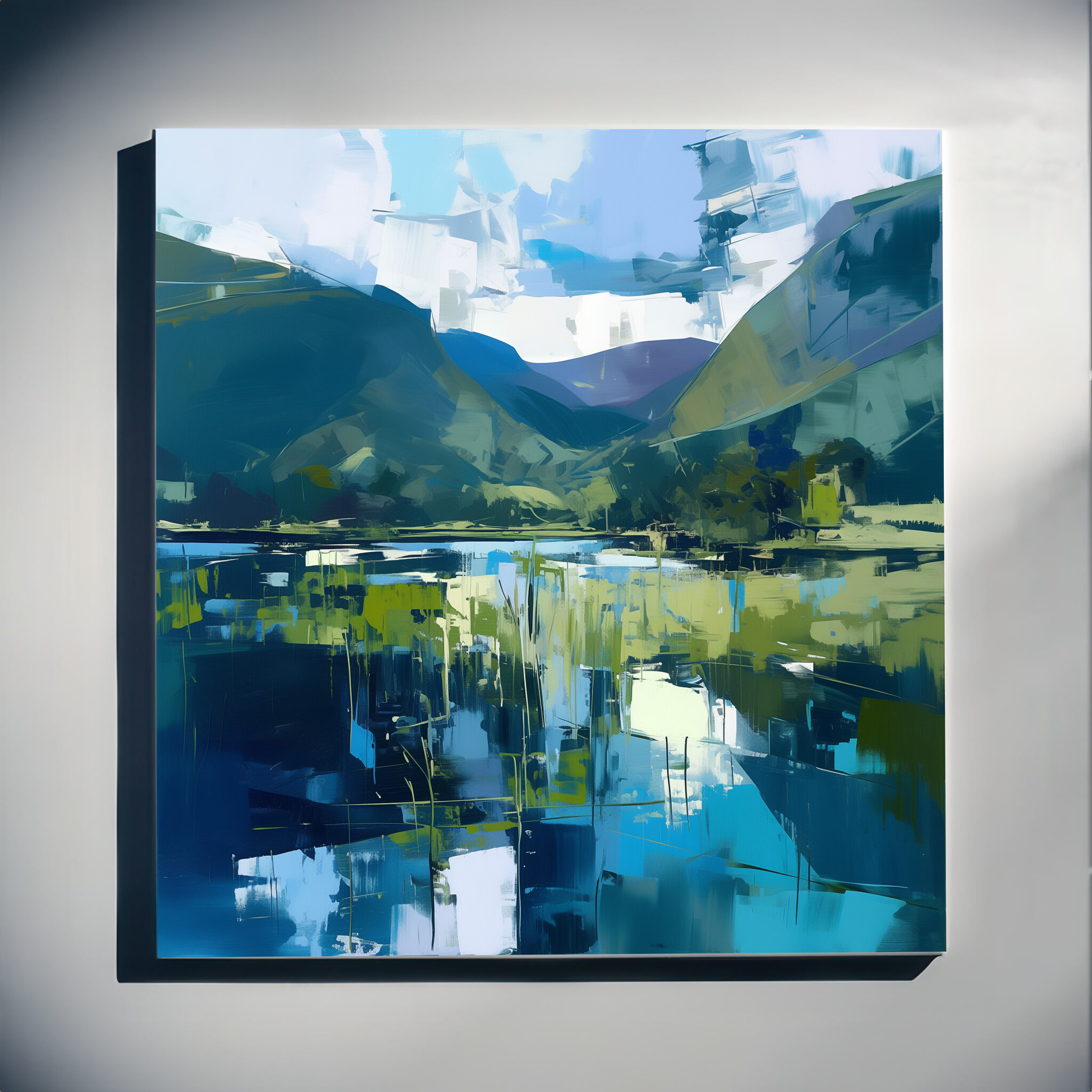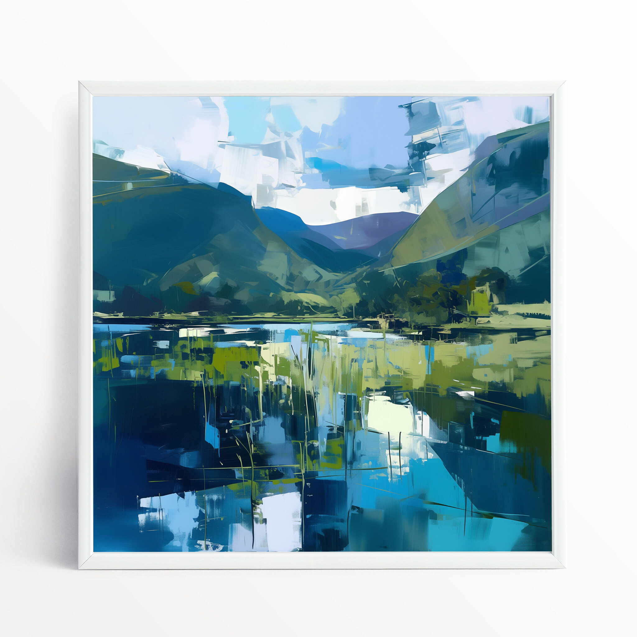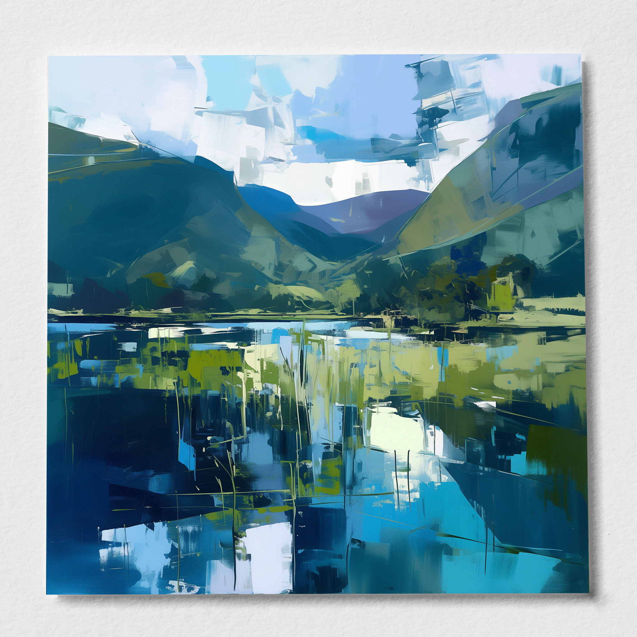 This abstract artwork beautifully captures the tranquil essence of the Lake District, with a harmonious blend of blue and green tones. The sweeping landscape is depicted in a contemporary style that evokes a sense of calm and reflection, making it a stunning addition to any home. Perfect for your living room, bedroom, or office, the piece adds a touch of serenity wherever it’s placed.