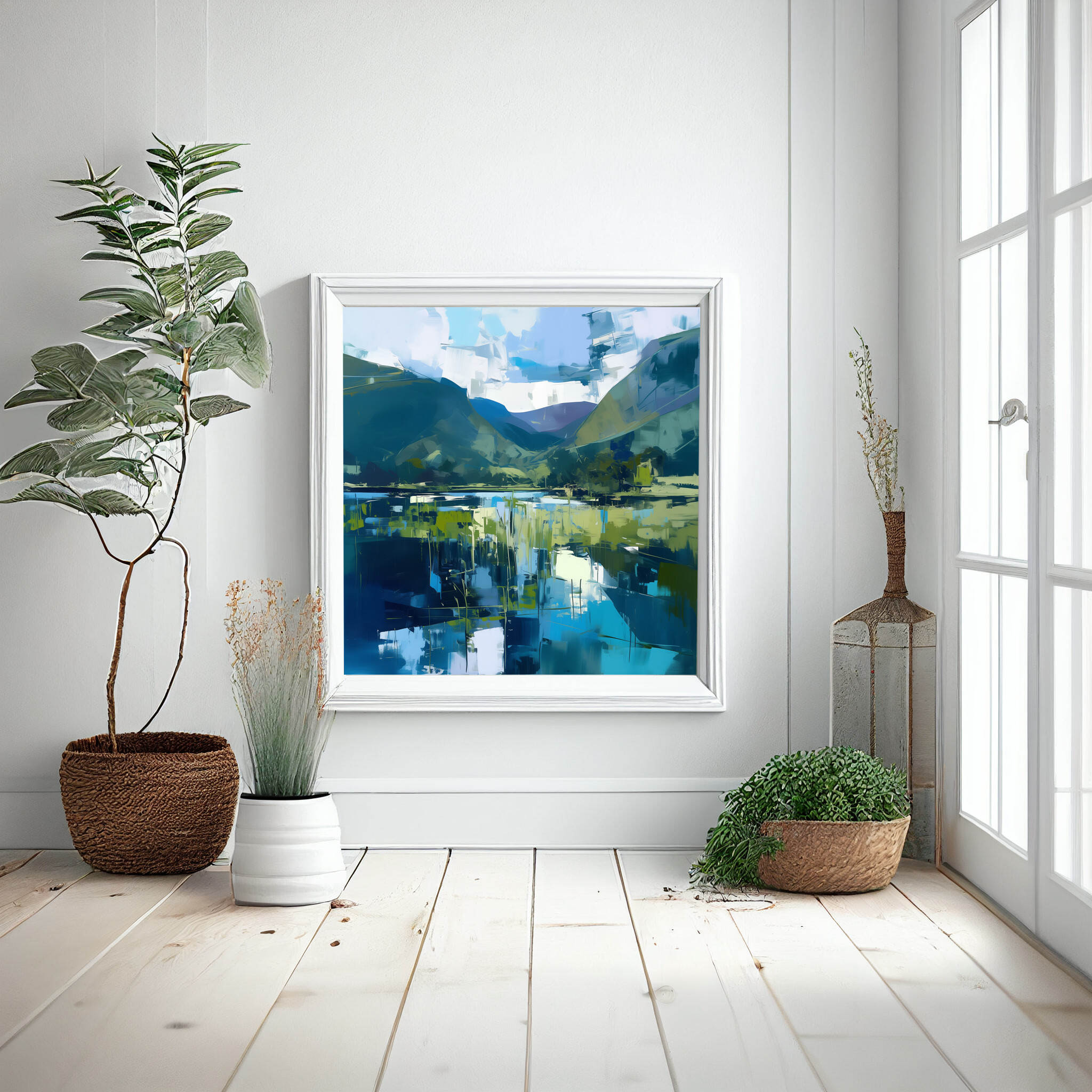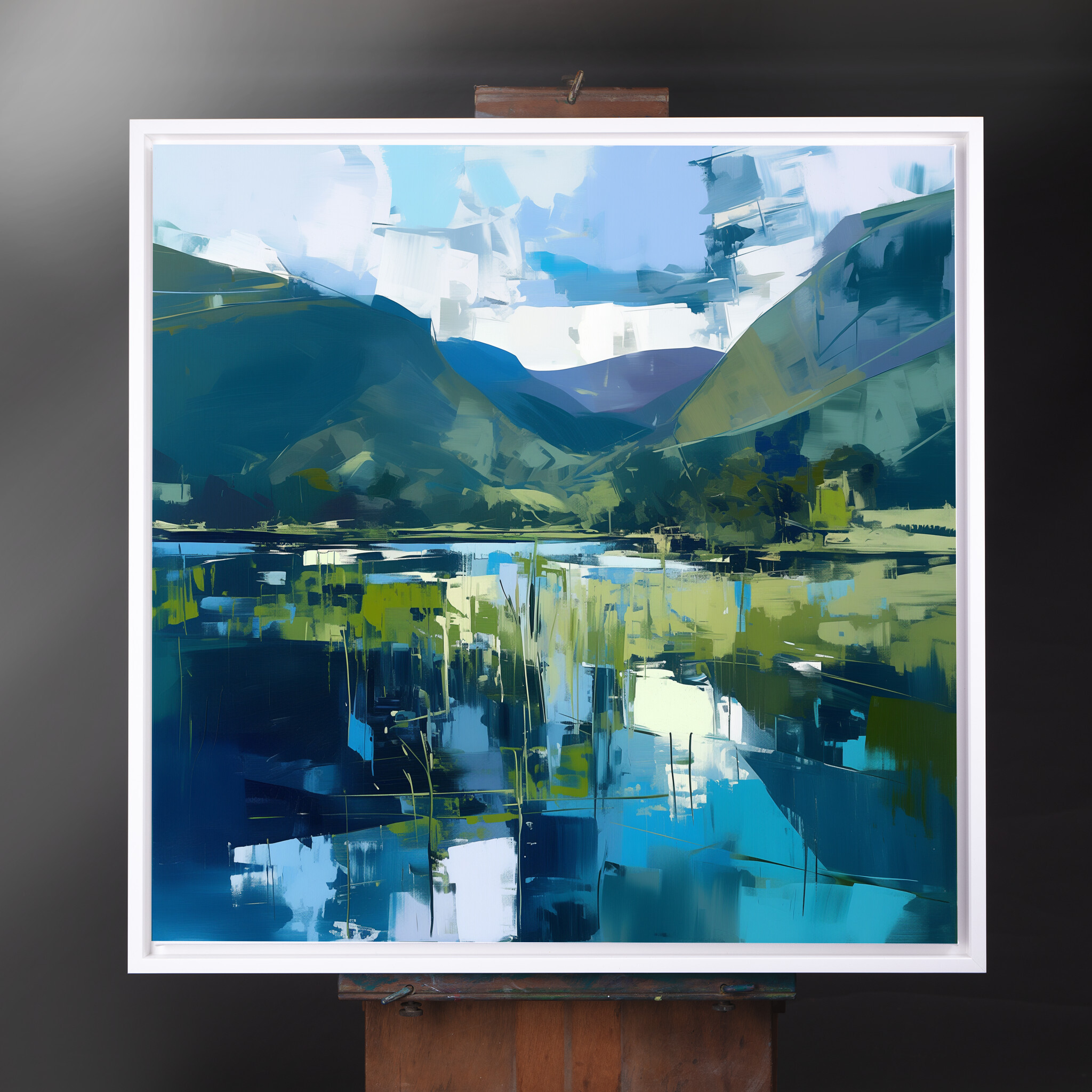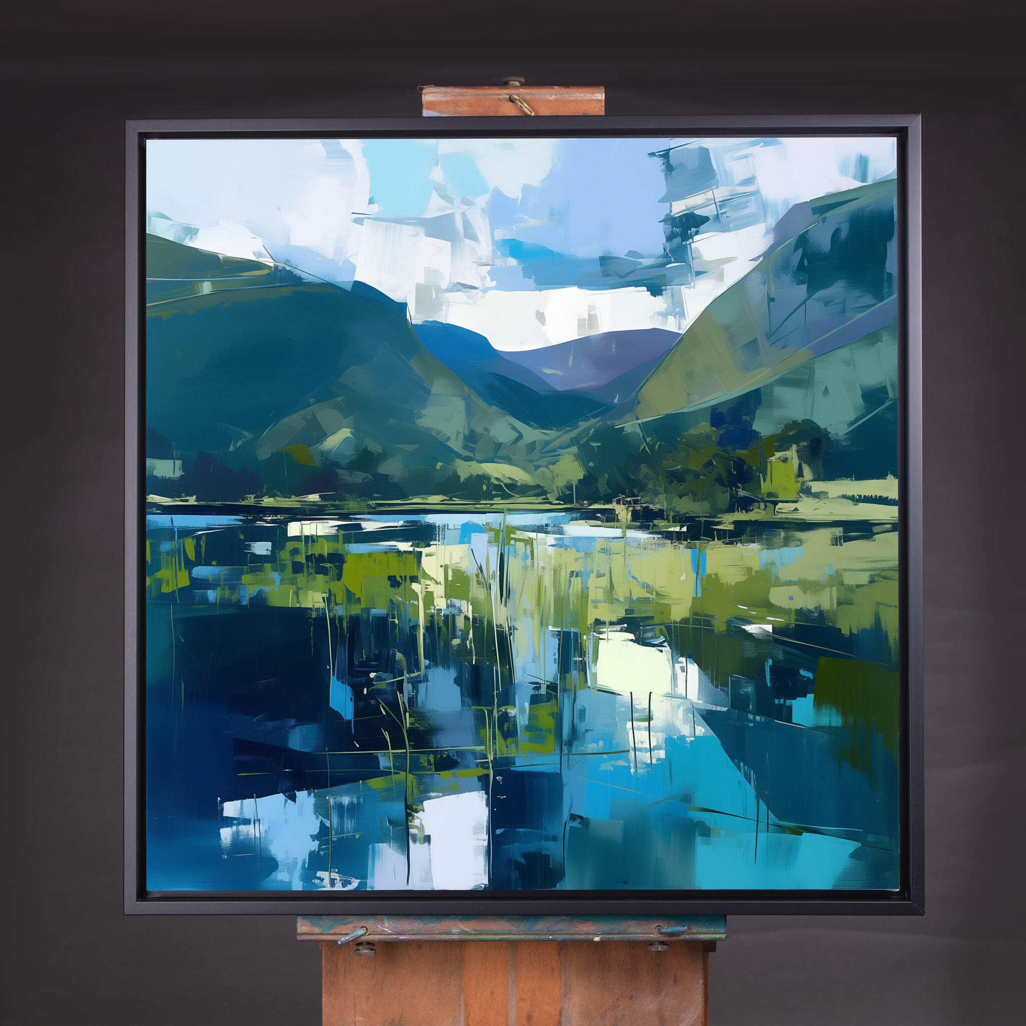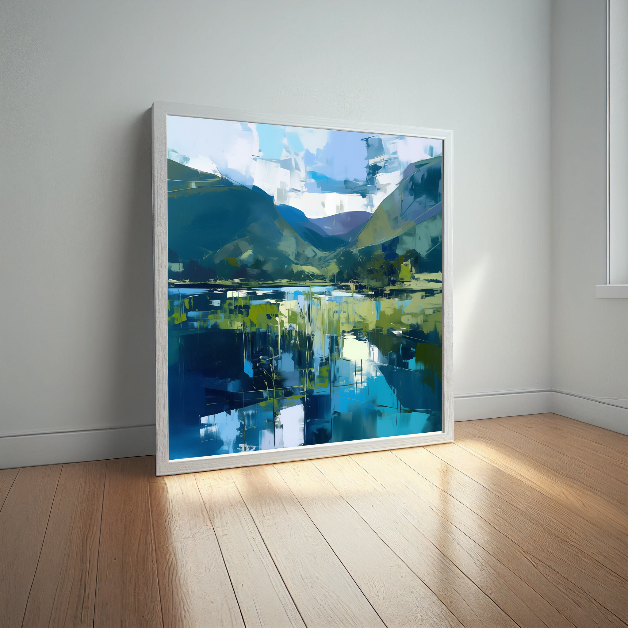 This abstract artwork beautifully captures the tranquil essence of the Lake District, with a harmonious blend of blue and green tones. The sweeping landscape is depicted in a contemporary style that evokes a sense of calm and reflection, making it a stunning addition to any home. Perfect for your living room, bedroom, or office, the piece adds a touch of serenity wherever it’s placed.