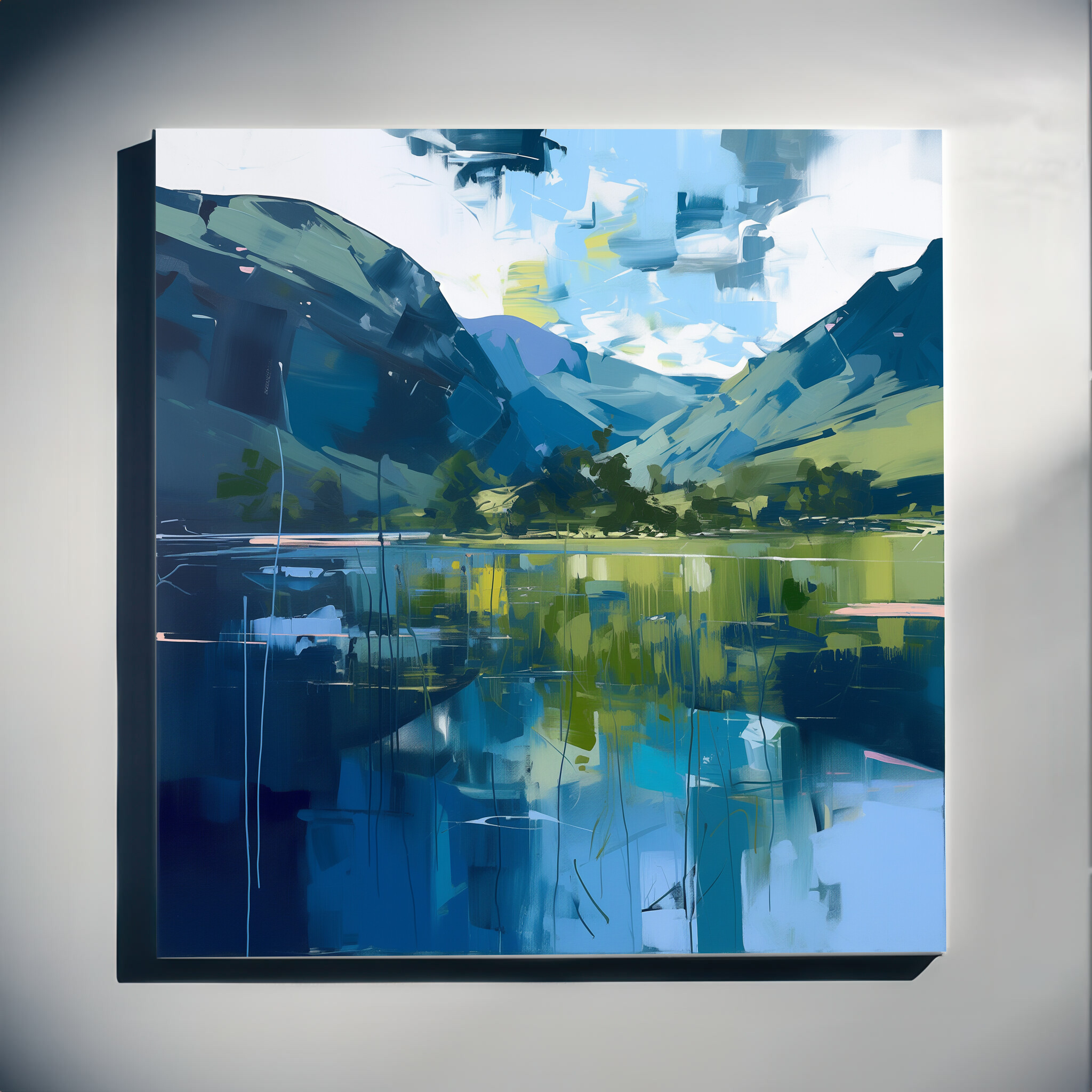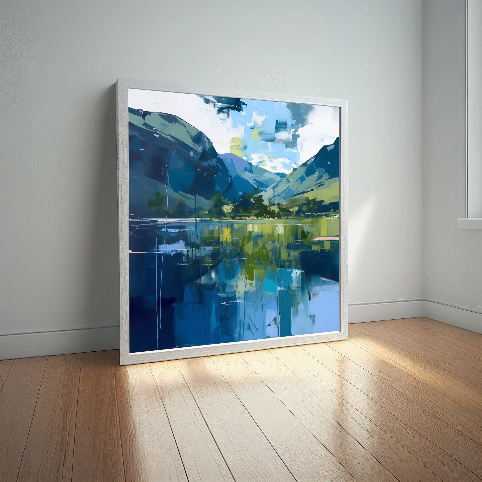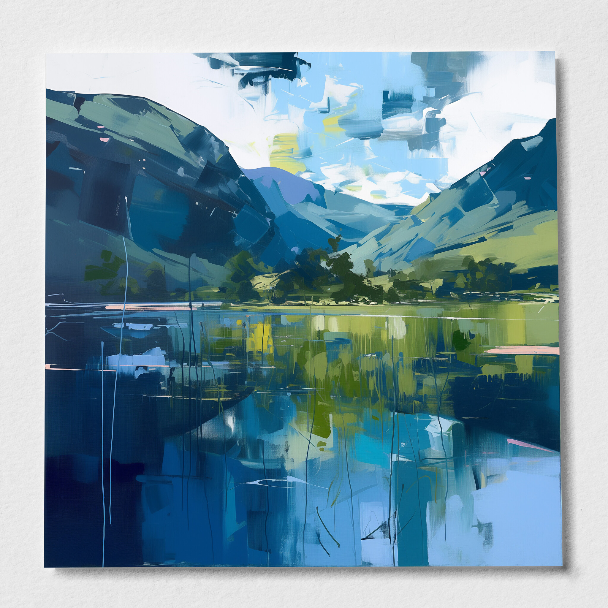 This abstract painting beautifully captures the serene beauty of the Lake District with its modern interpretation. Featuring calming blue tones, the landscape is brought to life in this stunning artwork. This piece is perfect for adding a touch of elegance to any space, whether it’s for your living room, bedroom, or office.