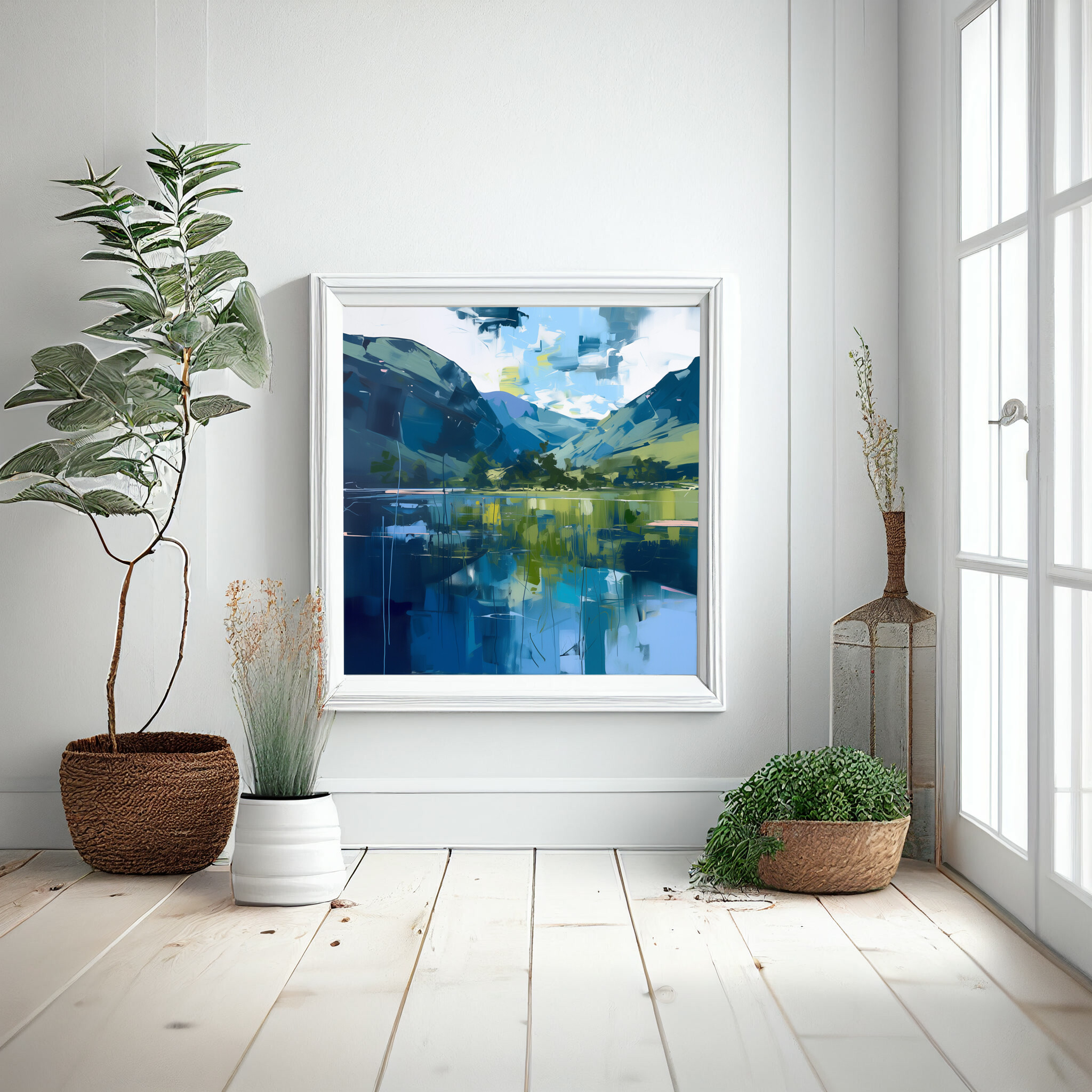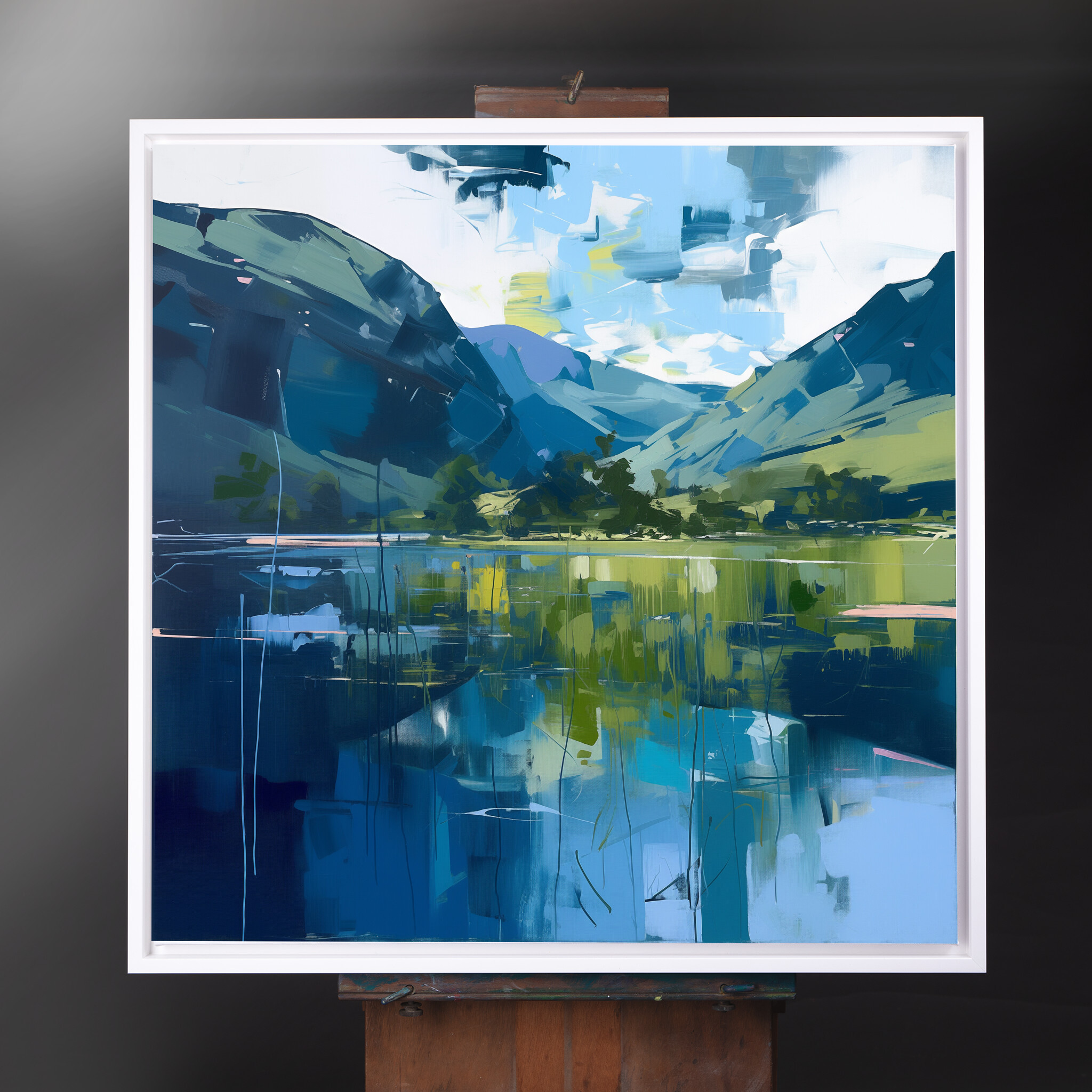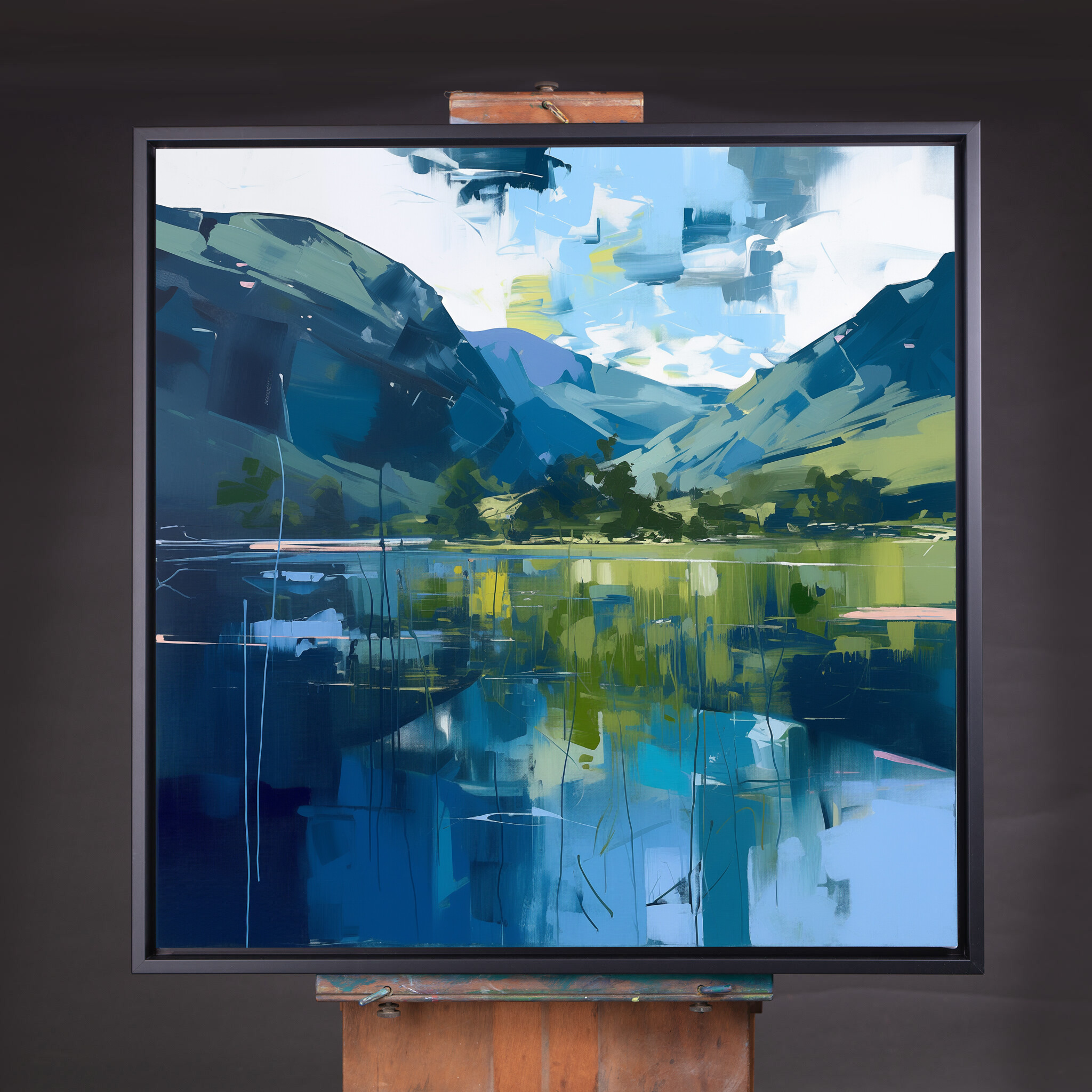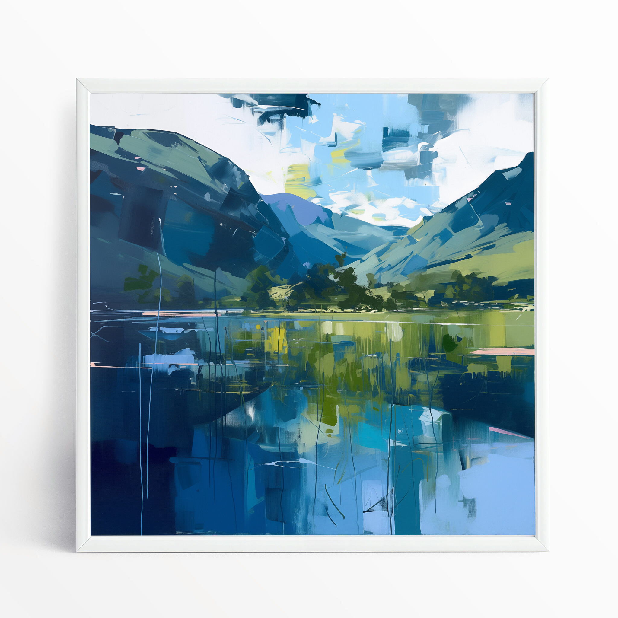 This abstract painting beautifully captures the serene beauty of the Lake District with its modern interpretation. Featuring calming blue tones, the landscape is brought to life in this stunning artwork. This piece is perfect for adding a touch of elegance to any space, whether it’s for your living room, bedroom, or office.