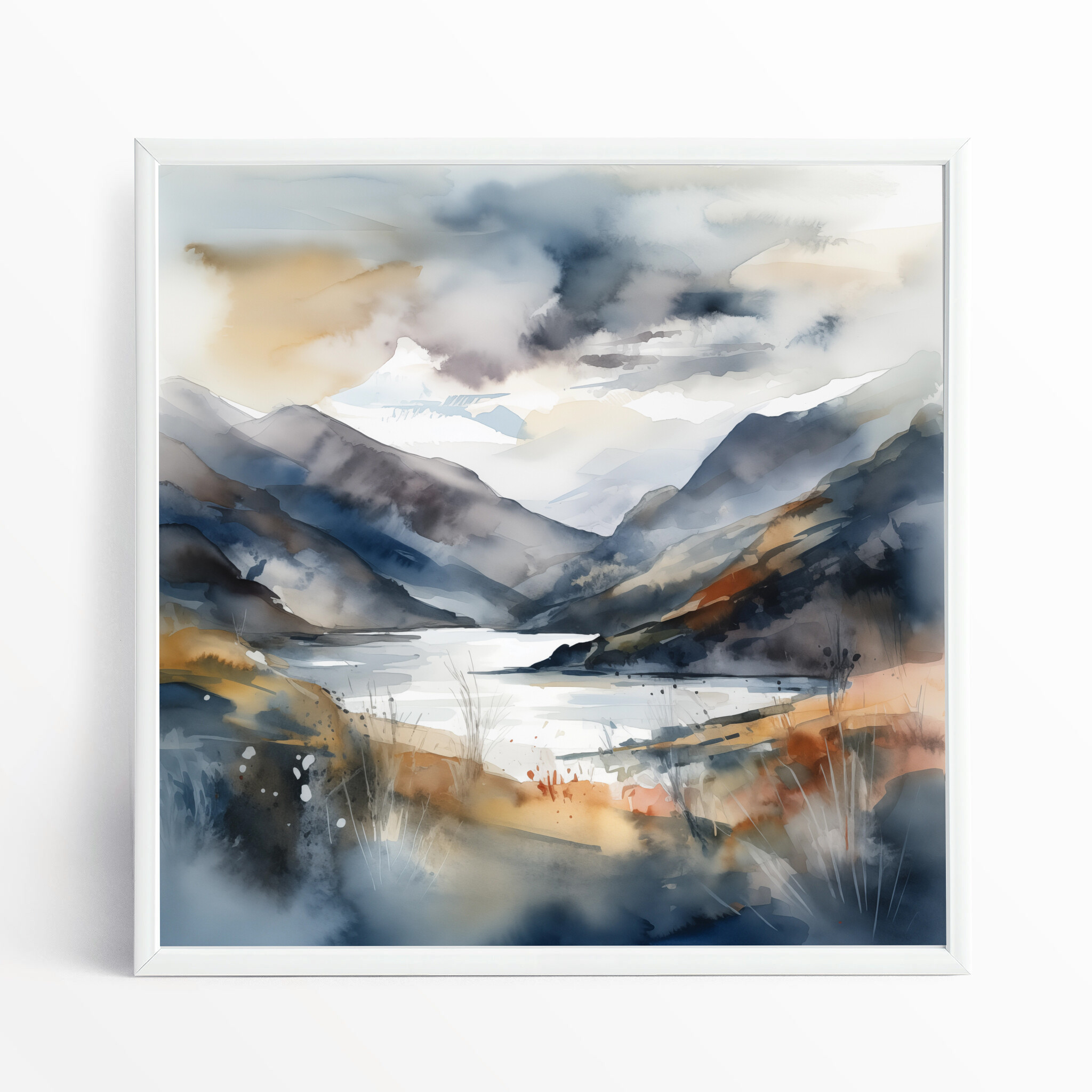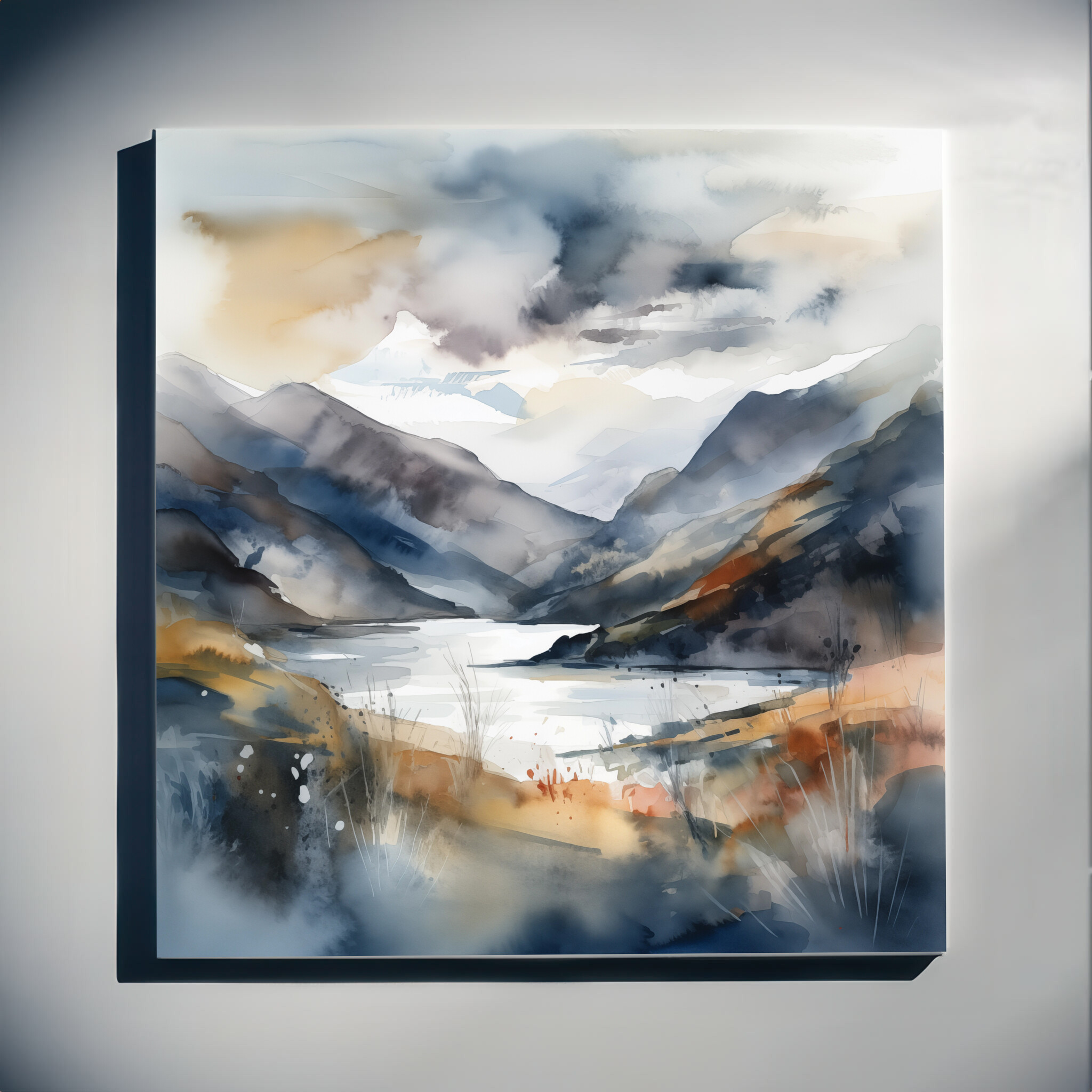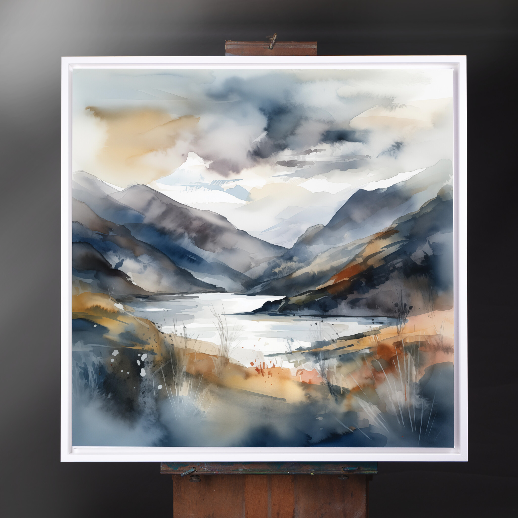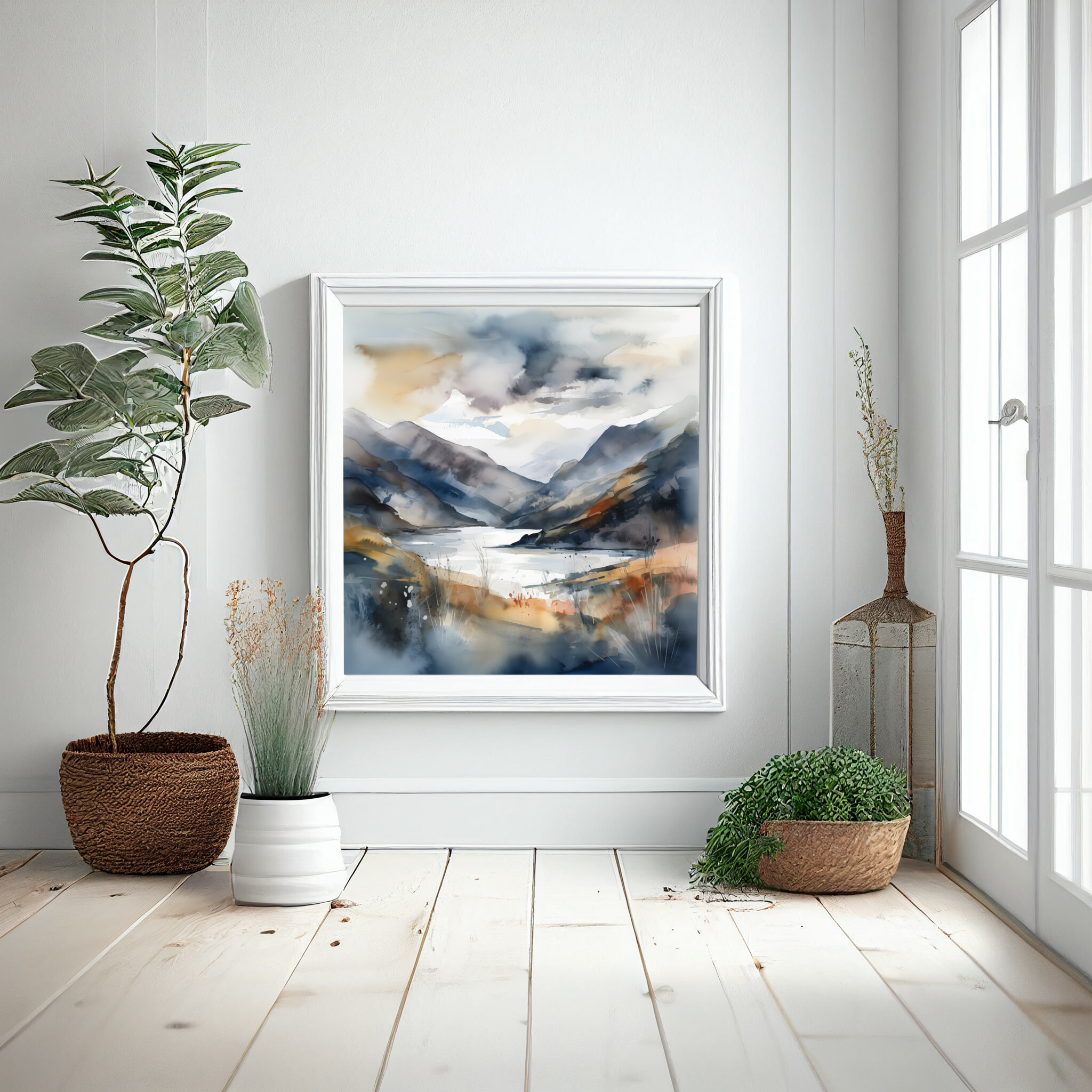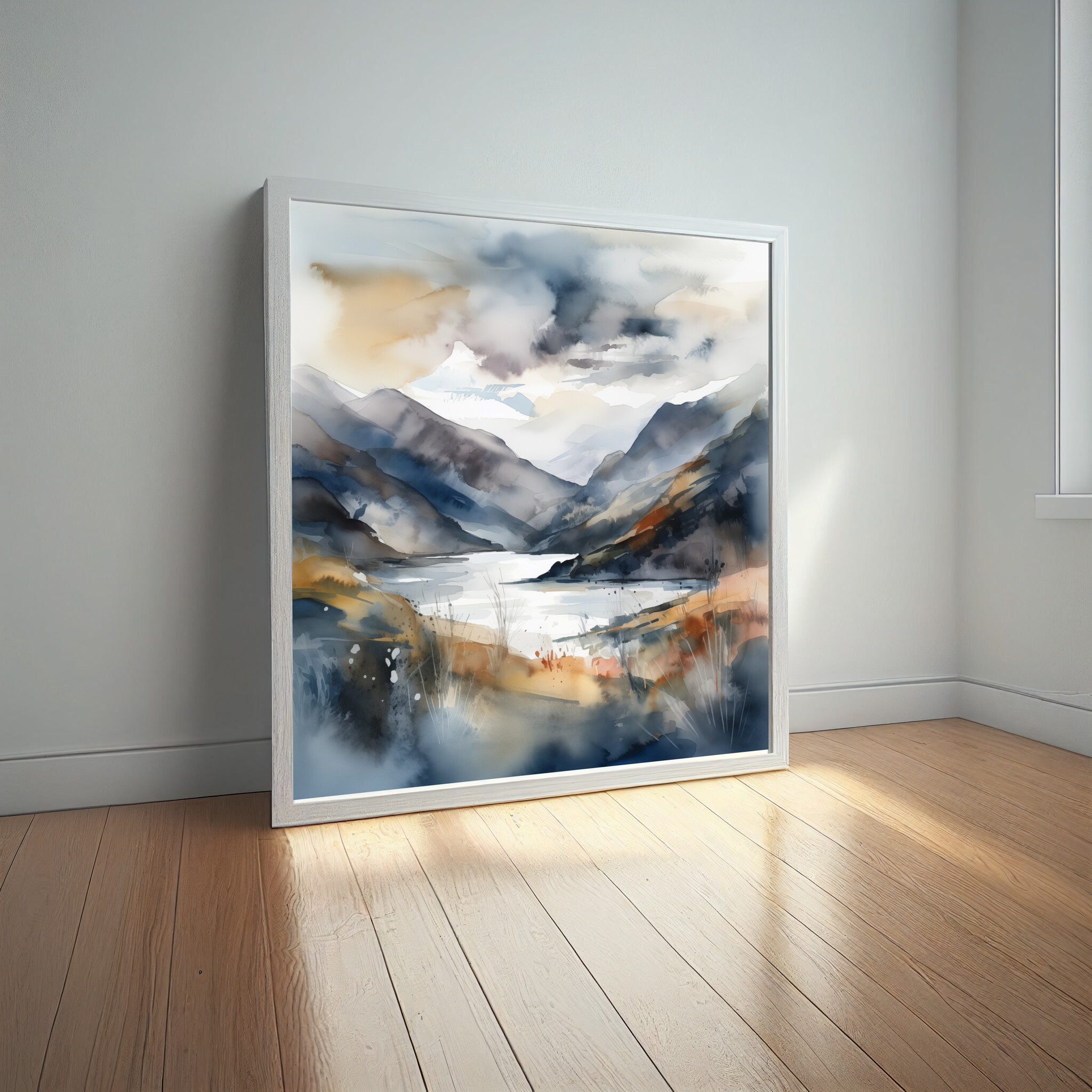 This abstract landscape captures the serene beauty of the Lake District, with swirling blues and warm tones conveying an ethereal mood. The artwork’s fluid style and captivating palette make it a standout piece for any home. Perfect as living room art, its calming presence will enhance your space.