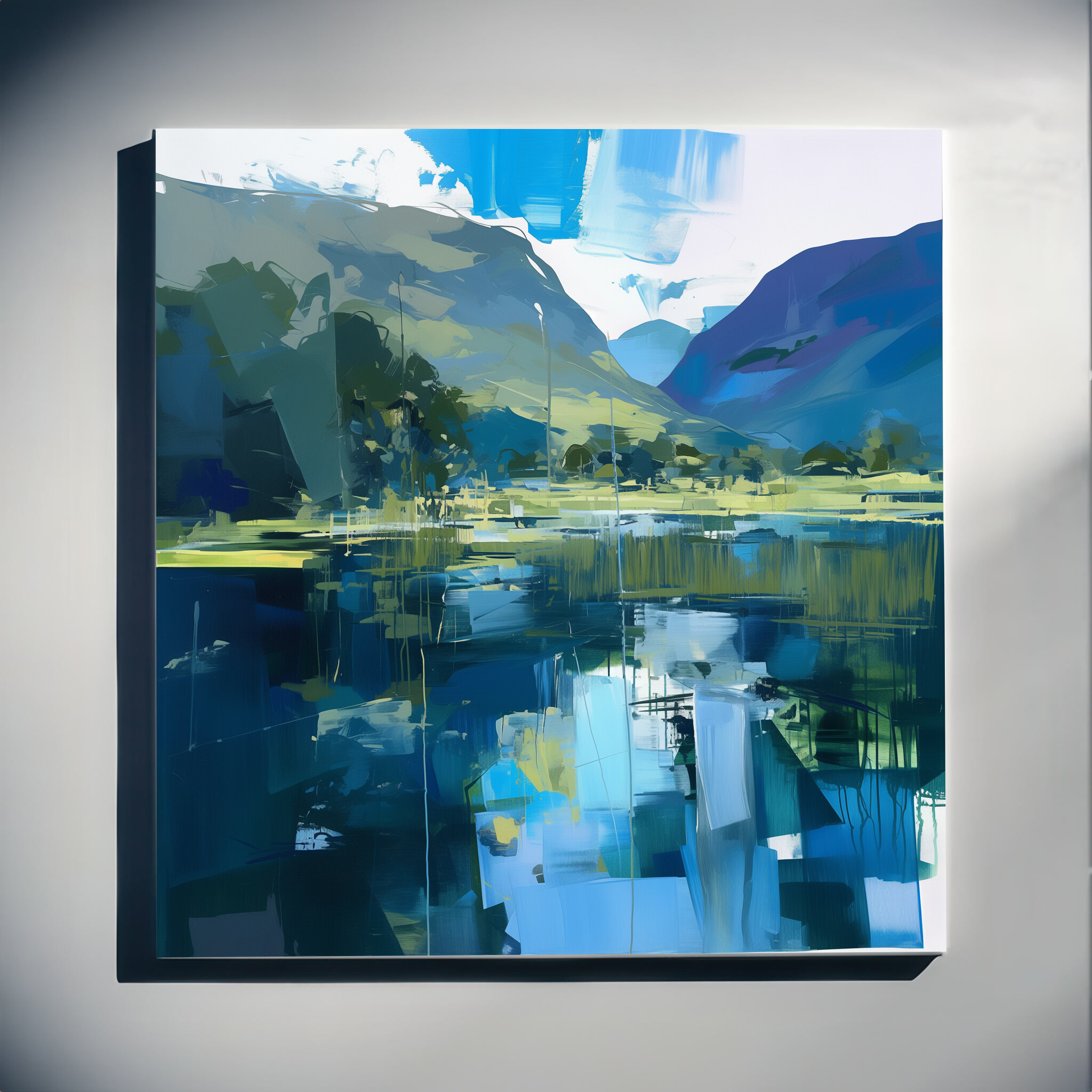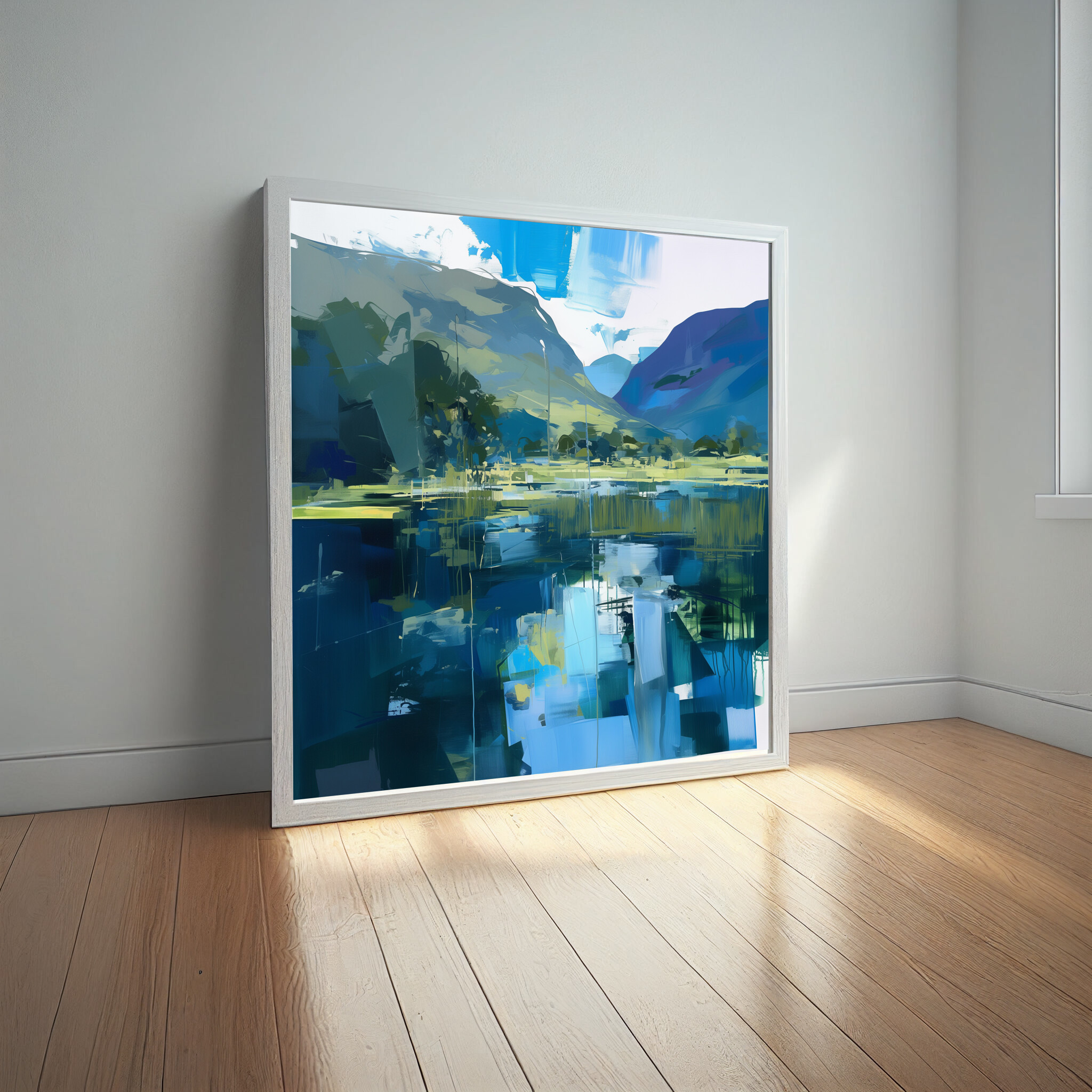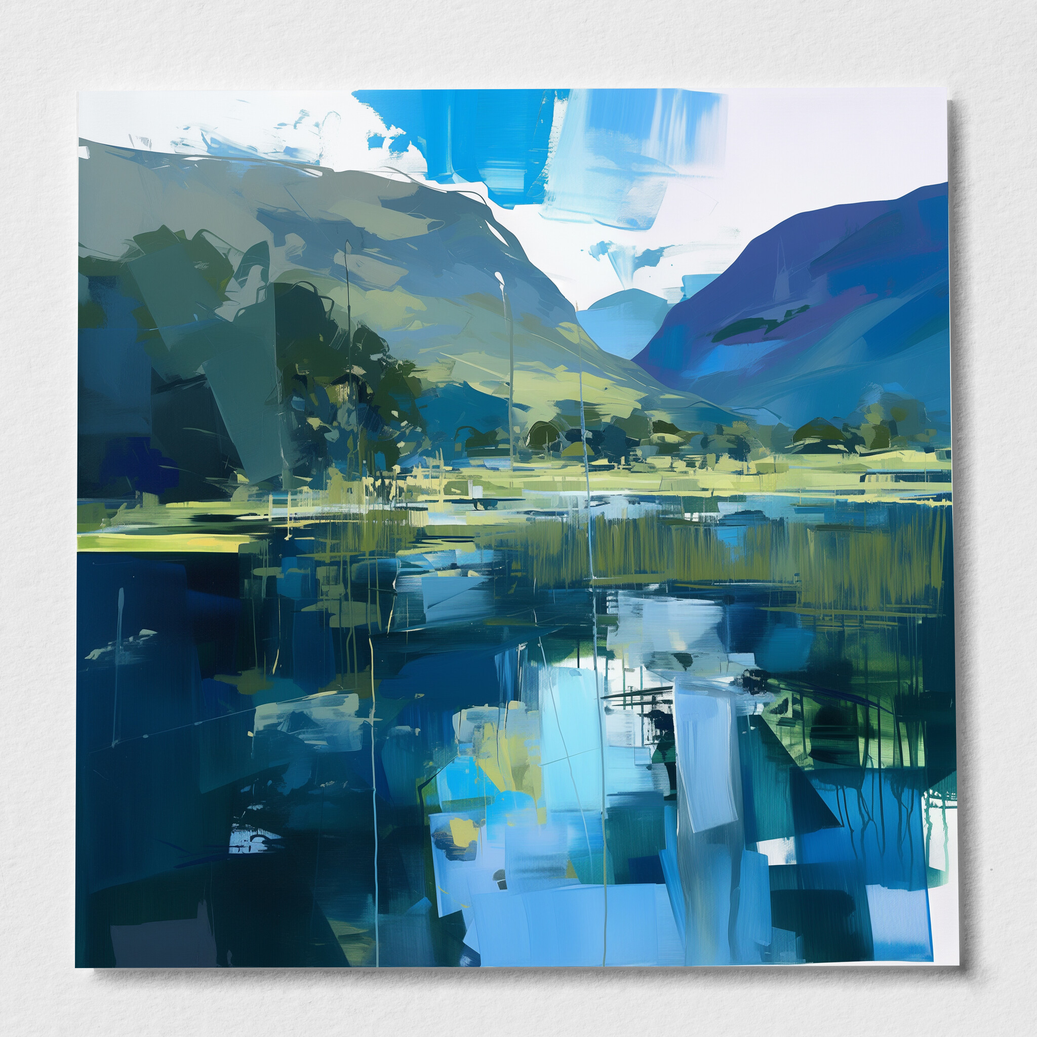 This captivating abstract depiction of the Lake District captures the tranquil beauty of this iconic location. Rendered in rich blue tones with elements of impressionism, it’s a stunning piece of wall art that brings the serenity of water and hills into your home. The interplay of colours creates a dynamic, yet calming landscape.