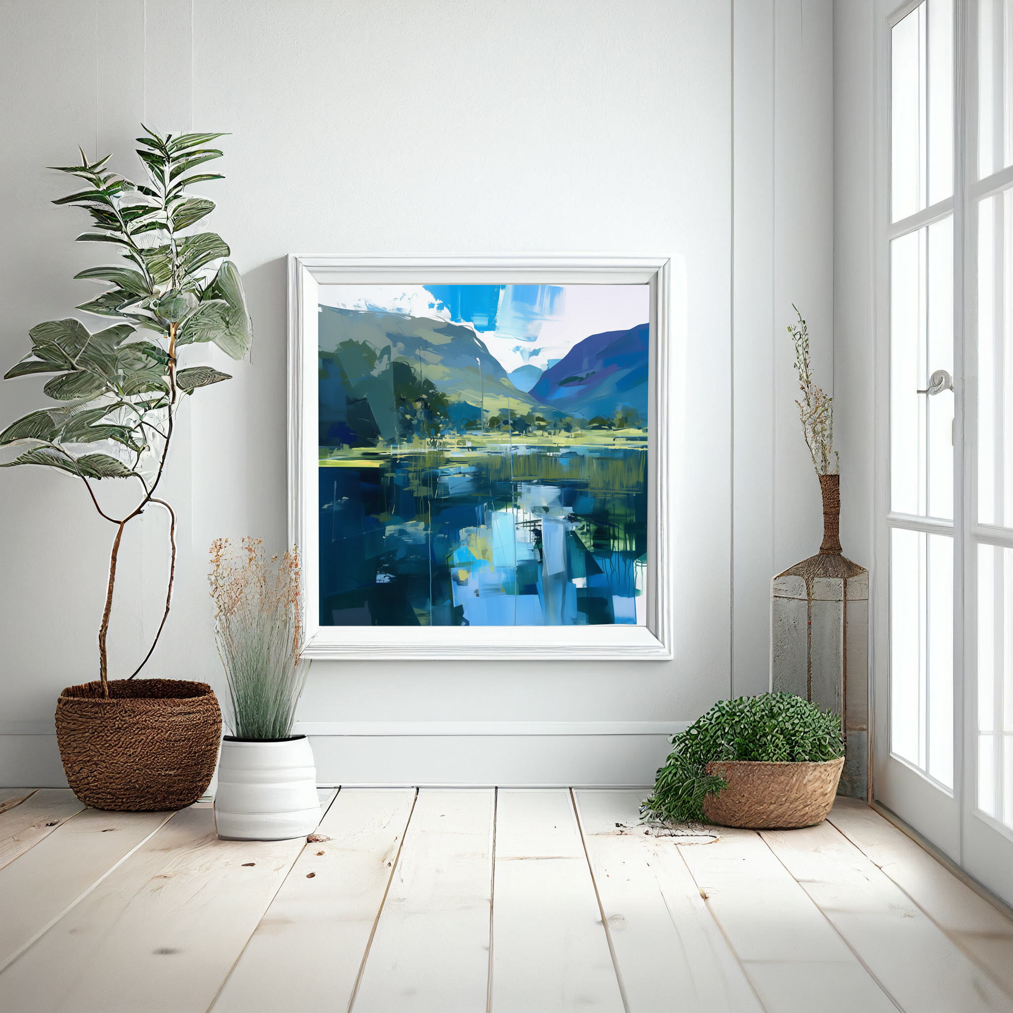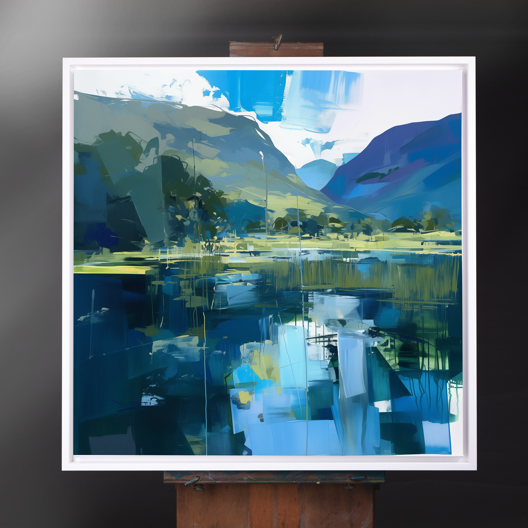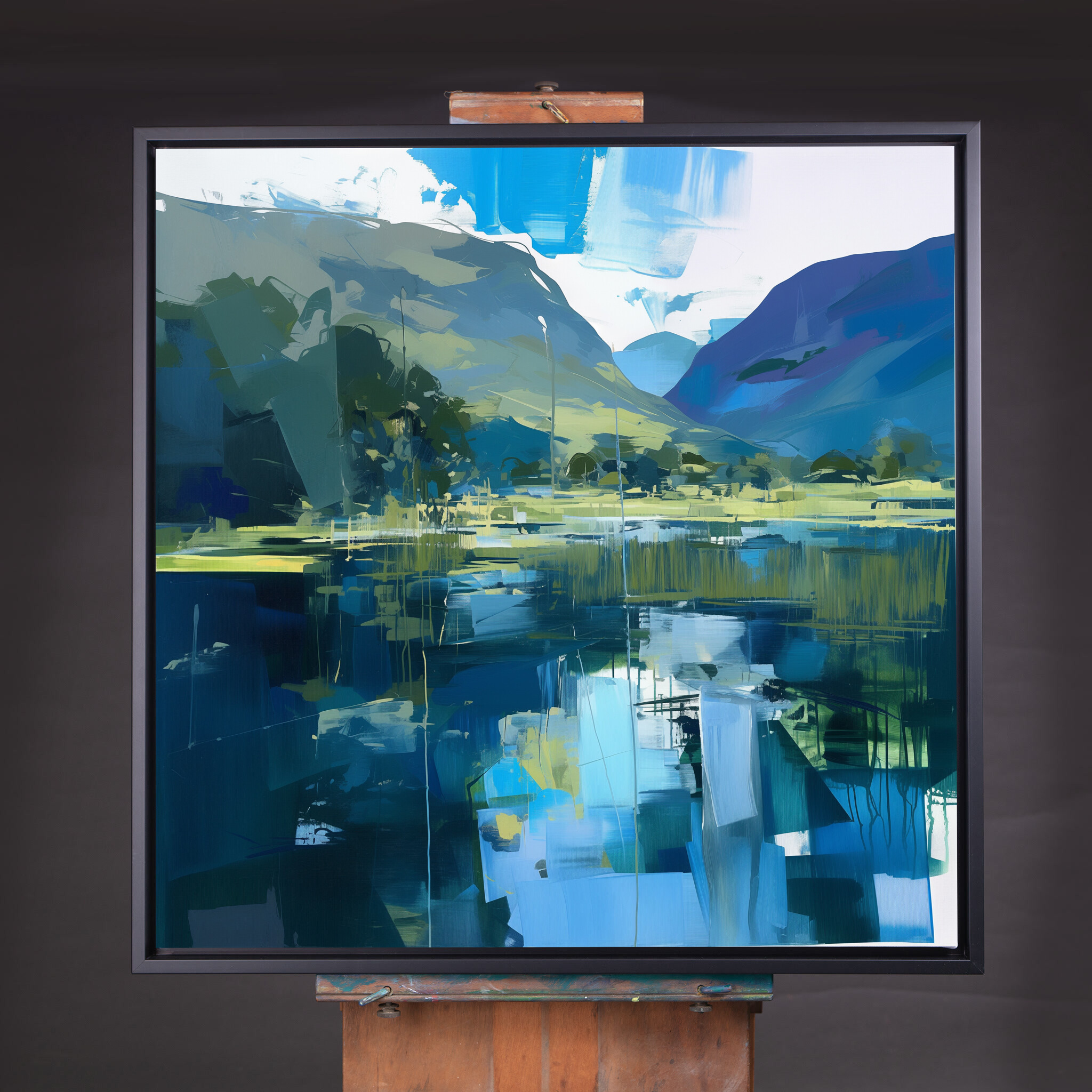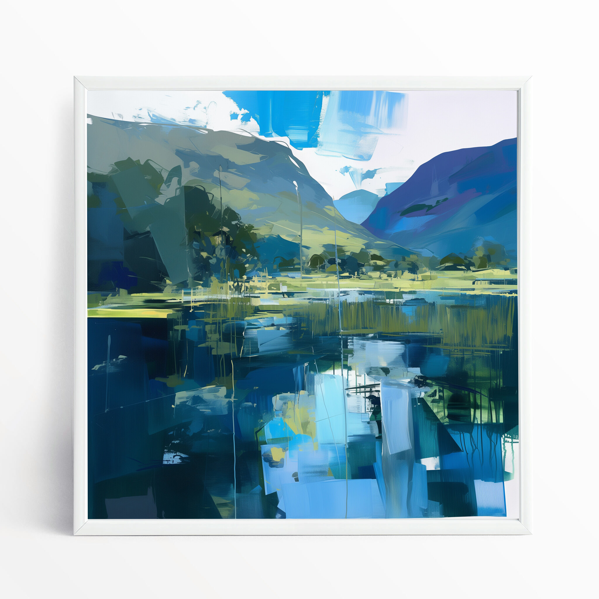 This captivating abstract depiction of the Lake District captures the tranquil beauty of this iconic location. Rendered in rich blue tones with elements of impressionism, it’s a stunning piece of wall art that brings the serenity of water and hills into your home. The interplay of colours creates a dynamic, yet calming landscape.