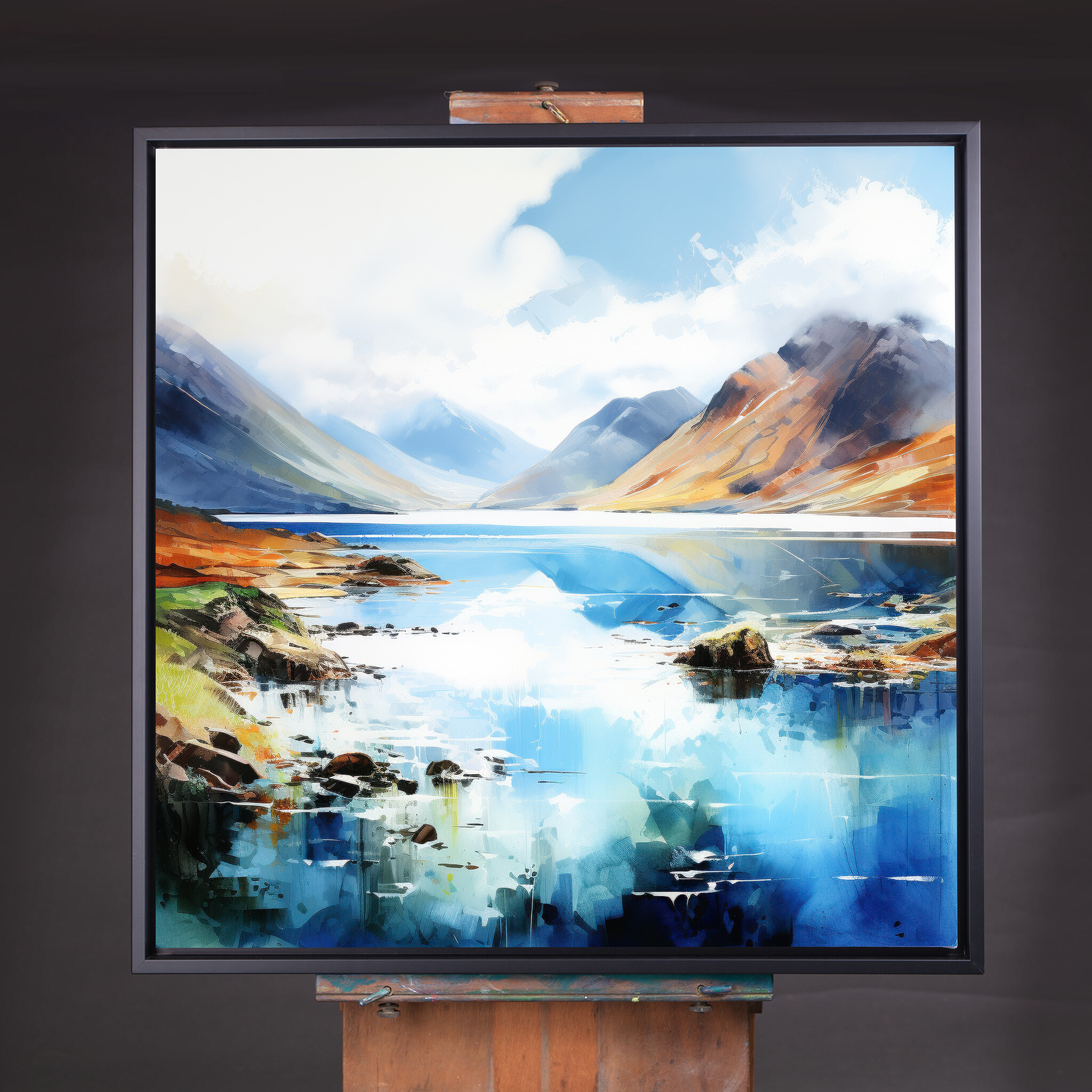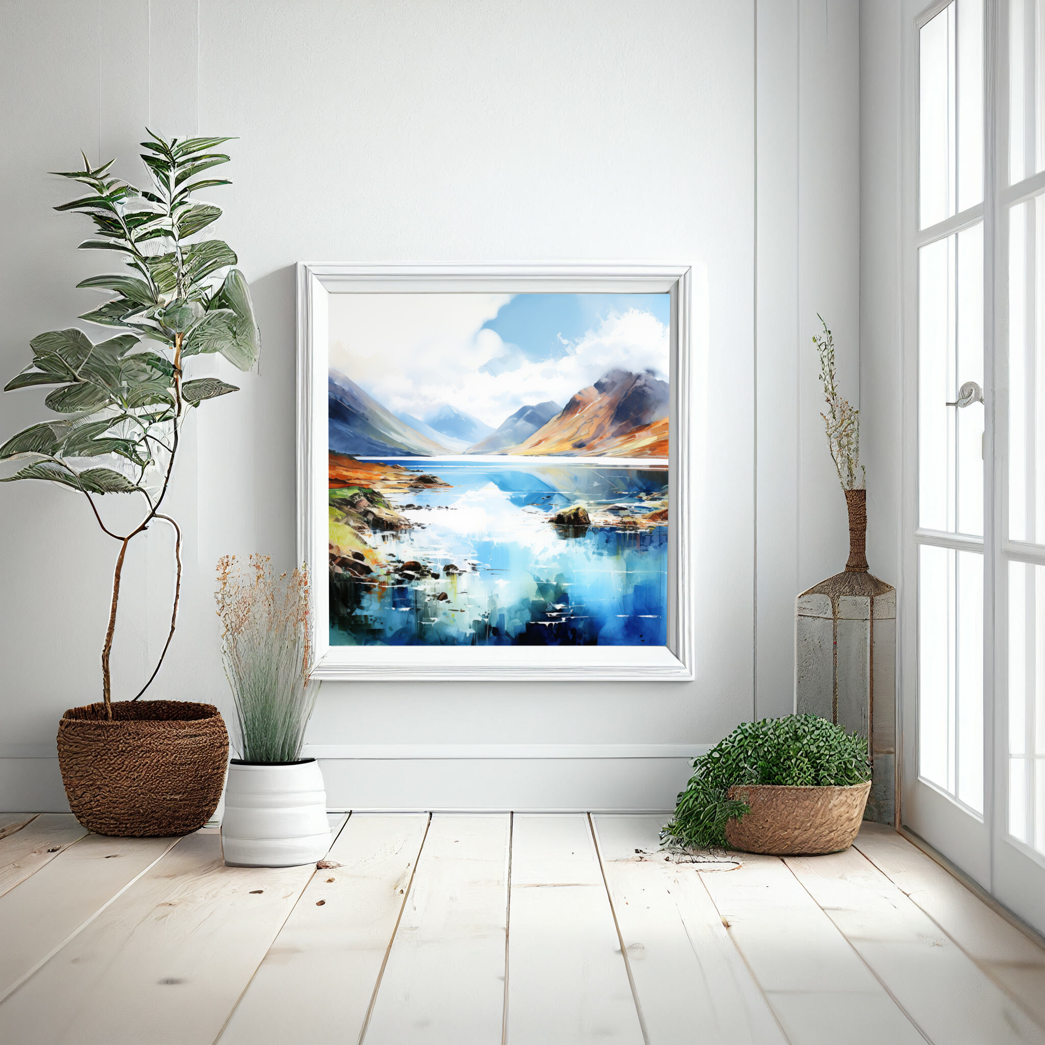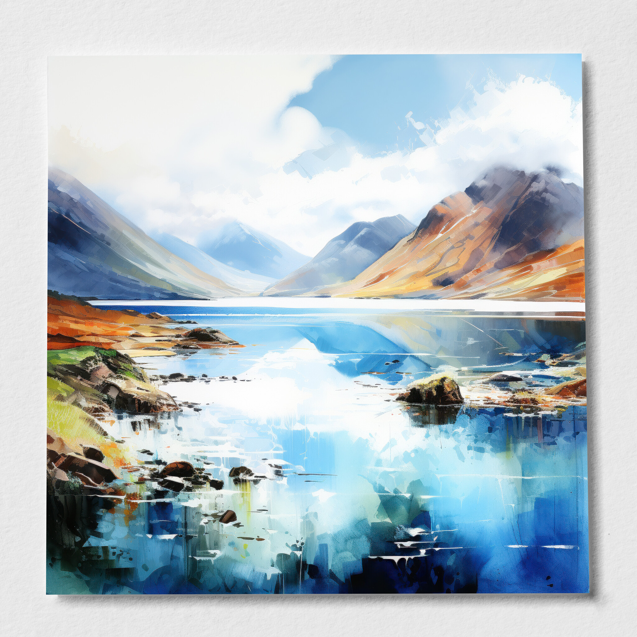 Immerse yourself in the breathtaking beauty of the Lake District with this impressionist landscape artwork. Capturing the serene blue hues of the water reflecting the surrounding peaks, it evokes a sense of tranquillity and natural splendour. Accents of warm tones provide a striking contrast, enhancing its visual appeal.