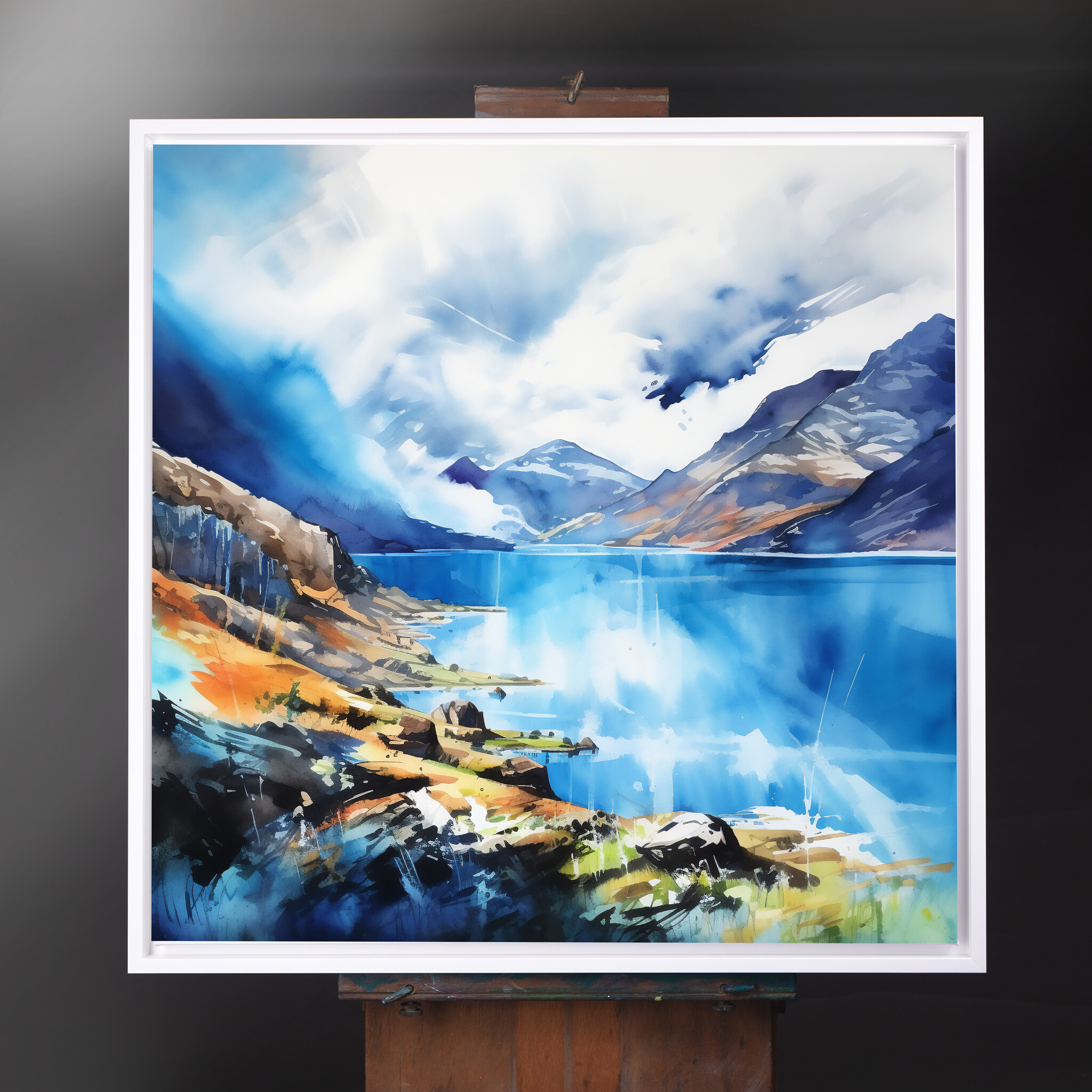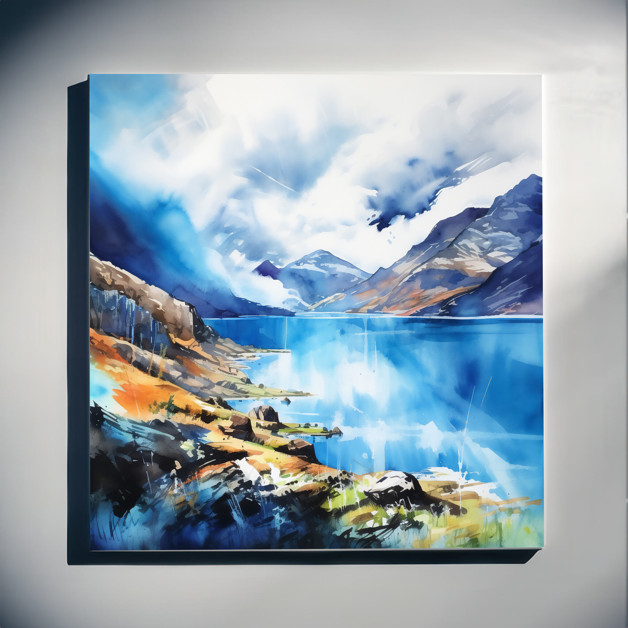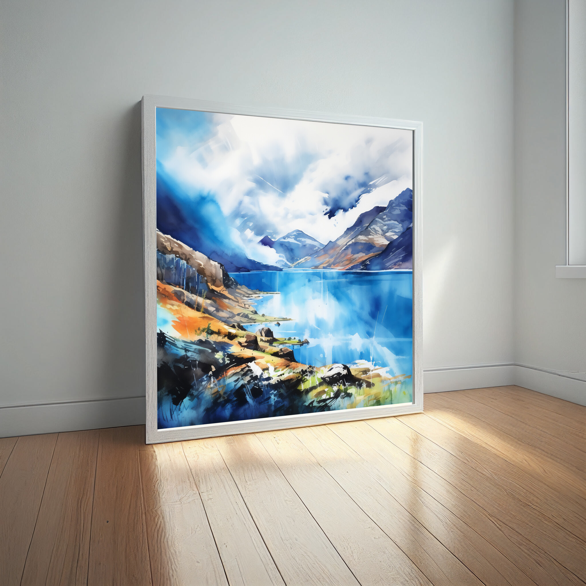 This stunning impressionist artwork captures the serene beauty of the Lake District, with its blue hues and dramatic mountain vistas. The artwork conveys a tranquil yet dynamic atmosphere, using cool tones that effortlessly draw the viewer in.
