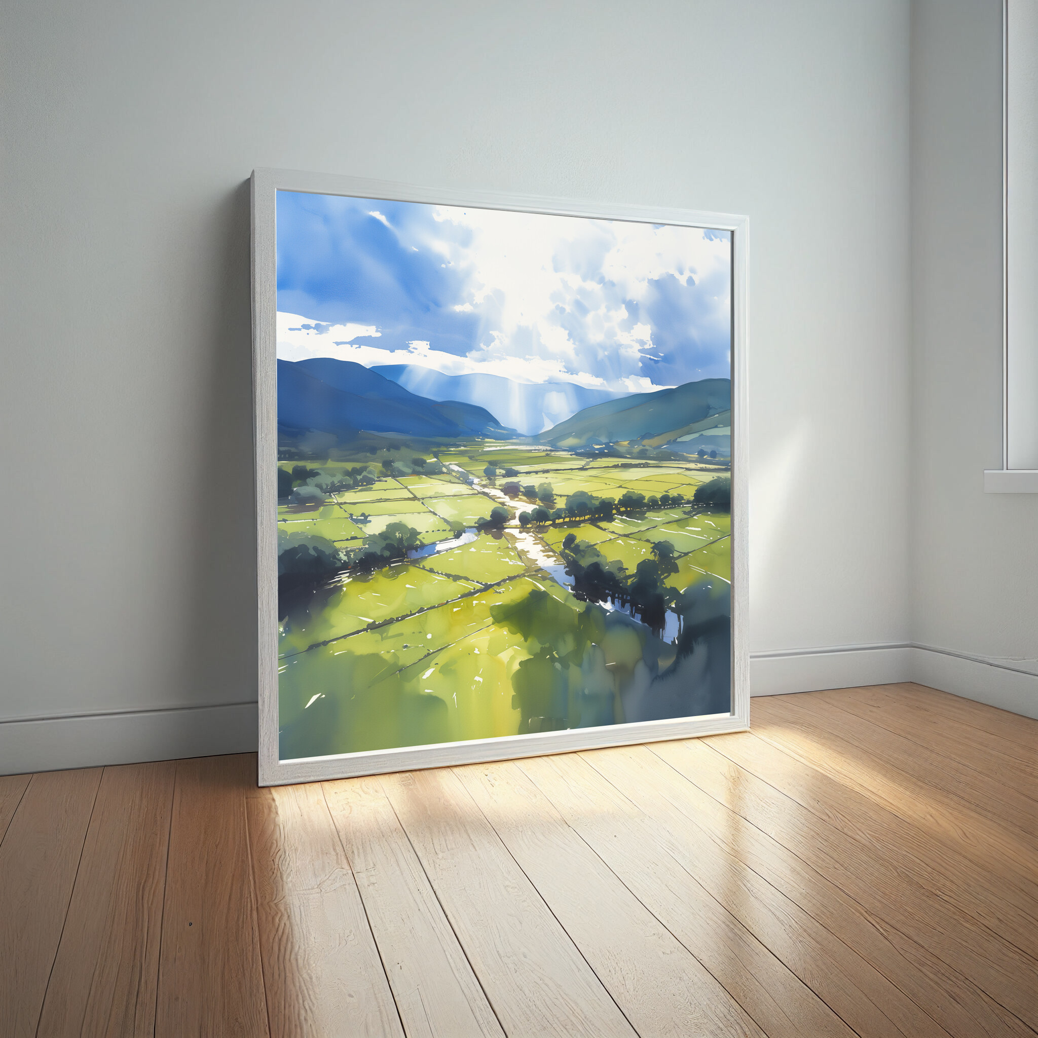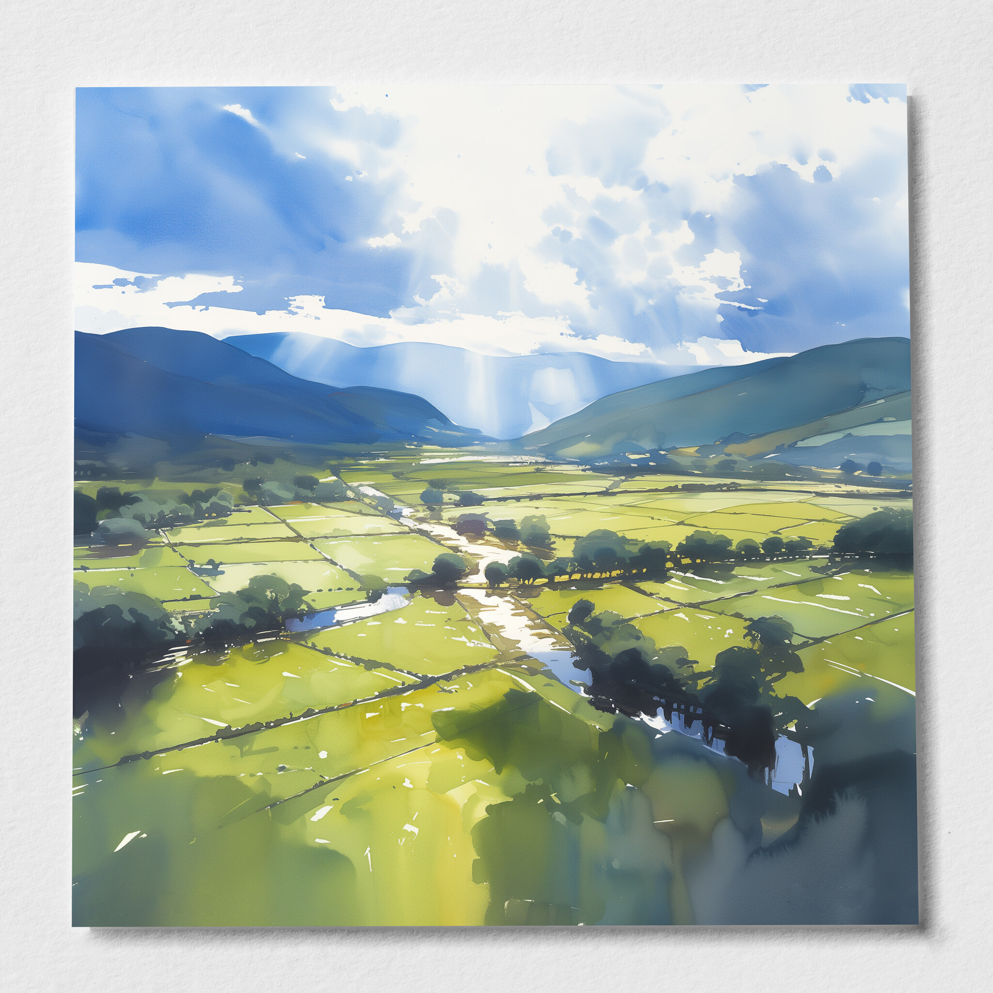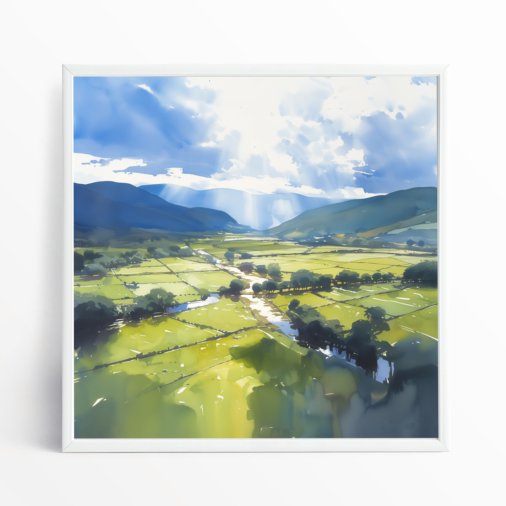 Immerse yourself in the tranquil beauty of the Lake District with this impressionist landscape. Capturing the serene blues of the sky and lush greens of the fields, this artwork brings the peaceful essence of nature into your home. Perfectly crafted in an impressionist style, this piece embodies a soothing harmony of colour and light.