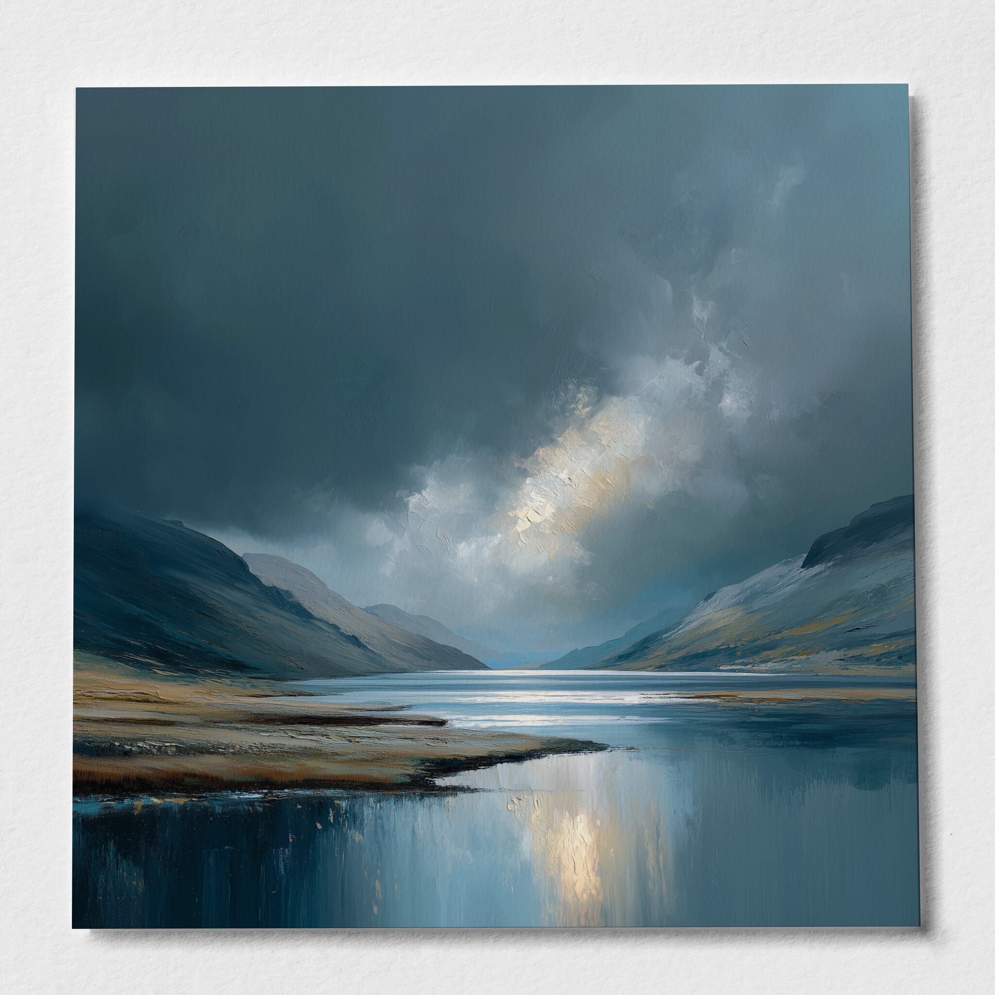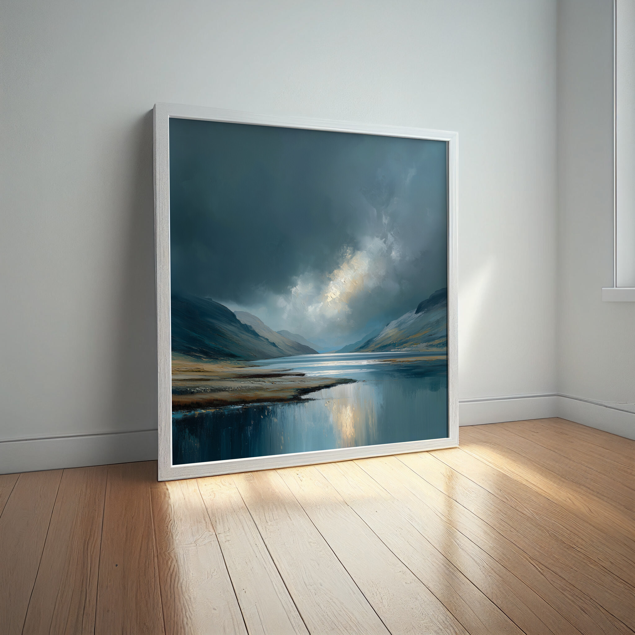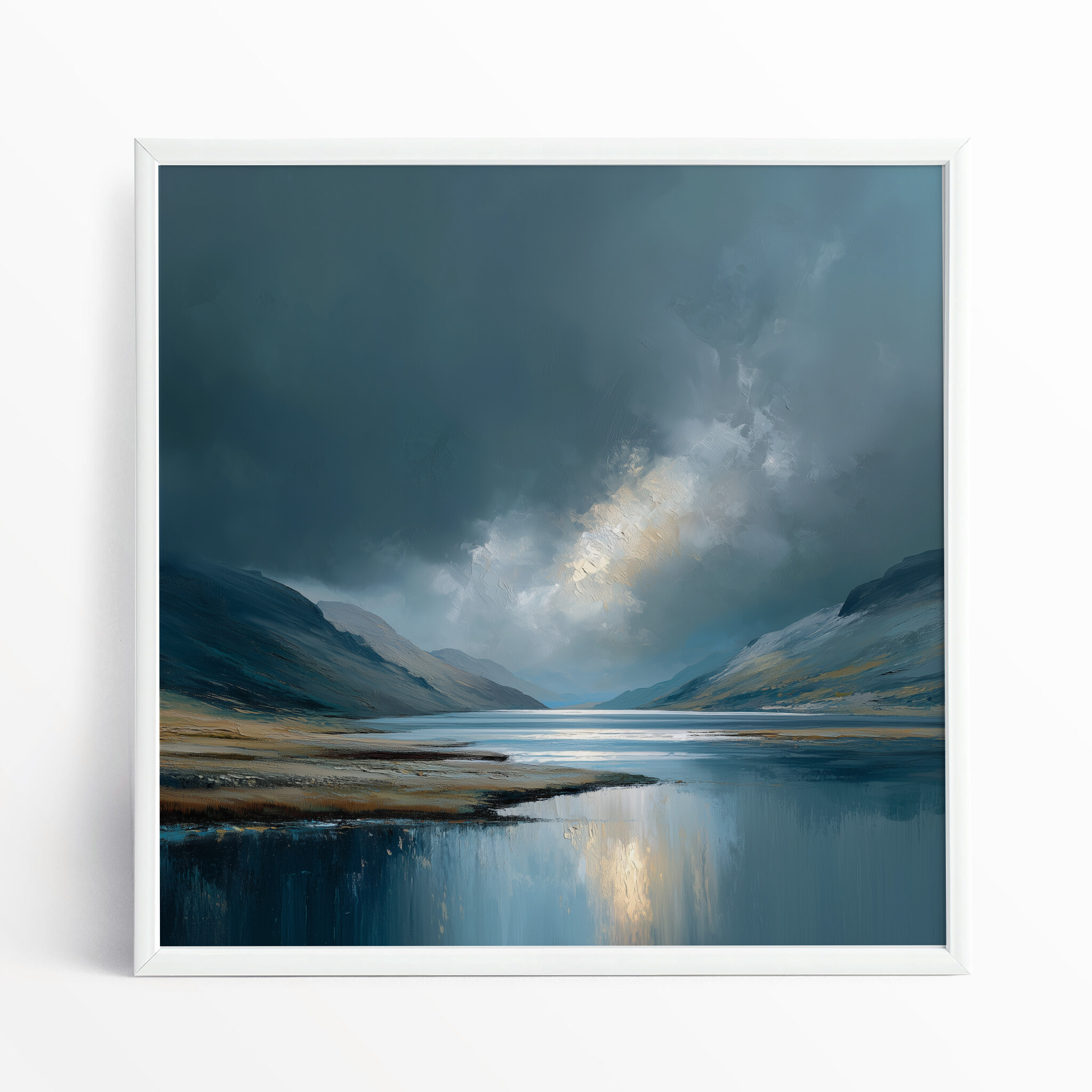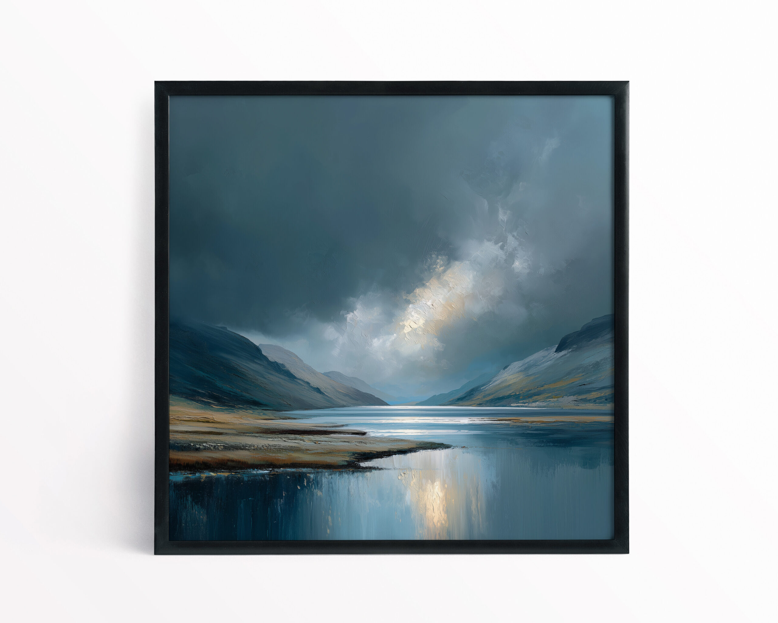 This impressionist artwork captures the serene beauty of the Lake District, with its expansive blue tones and calming grey neutral palette. The landscape is enveloped in a tranquil atmosphere, depicting the timeless allure of these iconic lakes, bathed in the softness of diffused light.