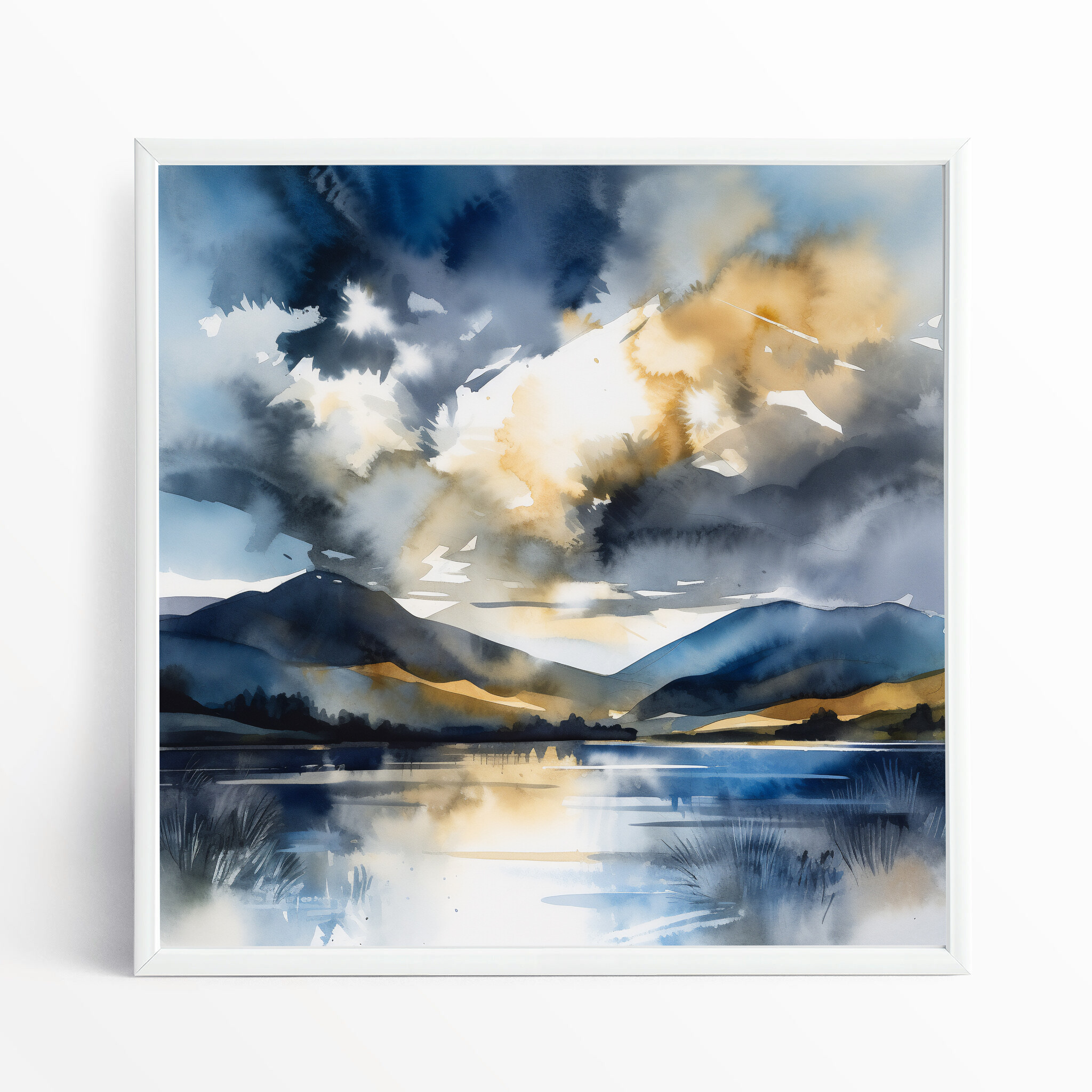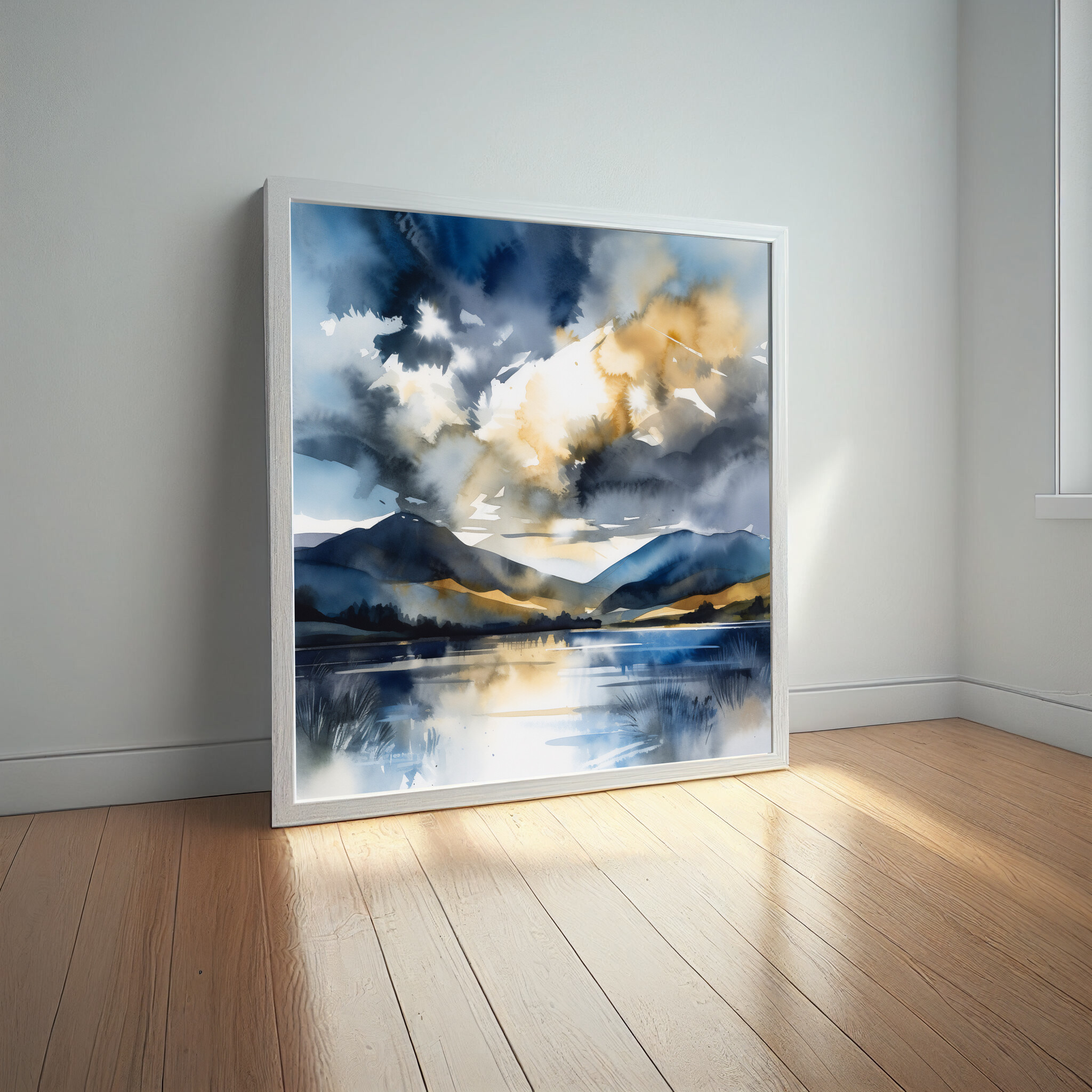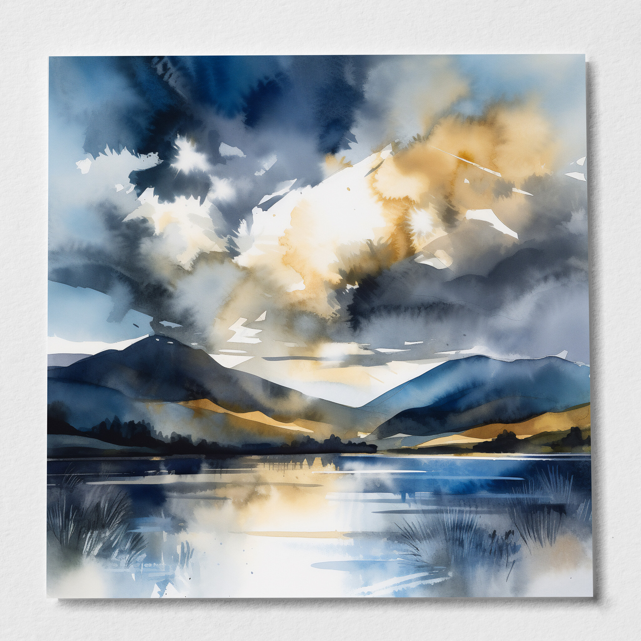 This impressionist artwork captures the serene beauty of the Lake District, with its reflective waters and majestic hills enveloped in blue tones and subtle gold accents. The calm essence is beautifully translated through an impressionist style that brings a touch of tranquility to any space.