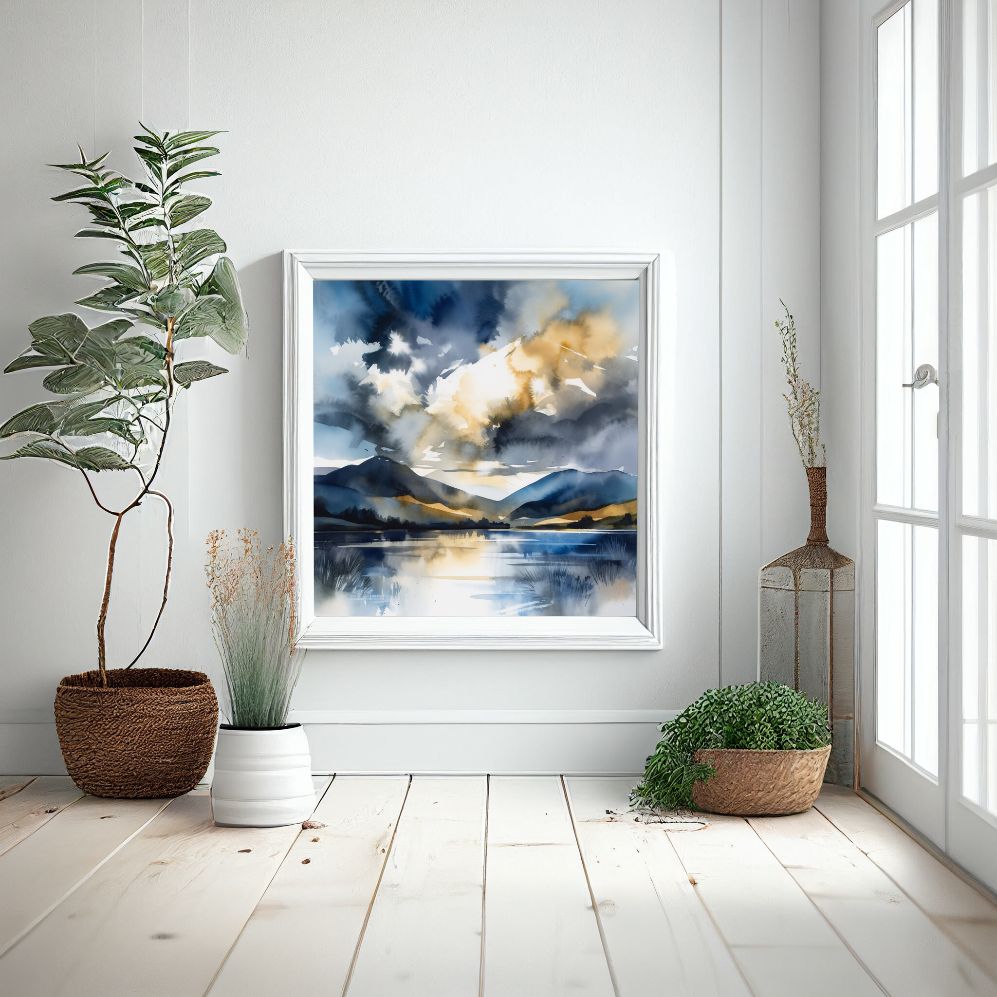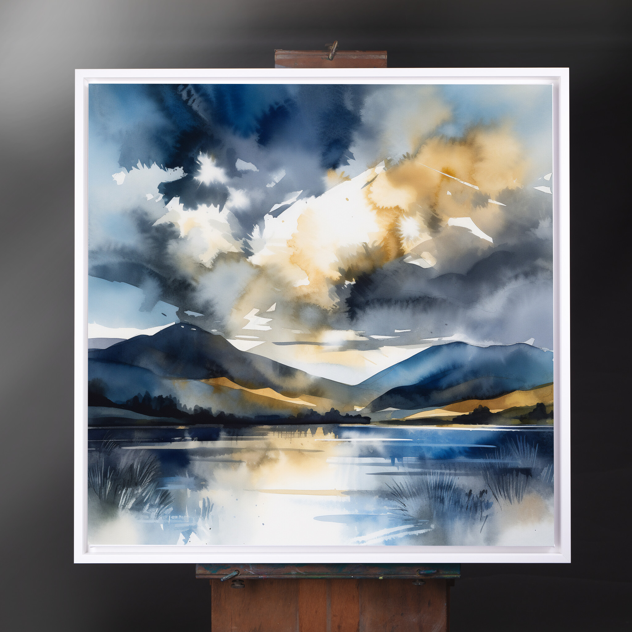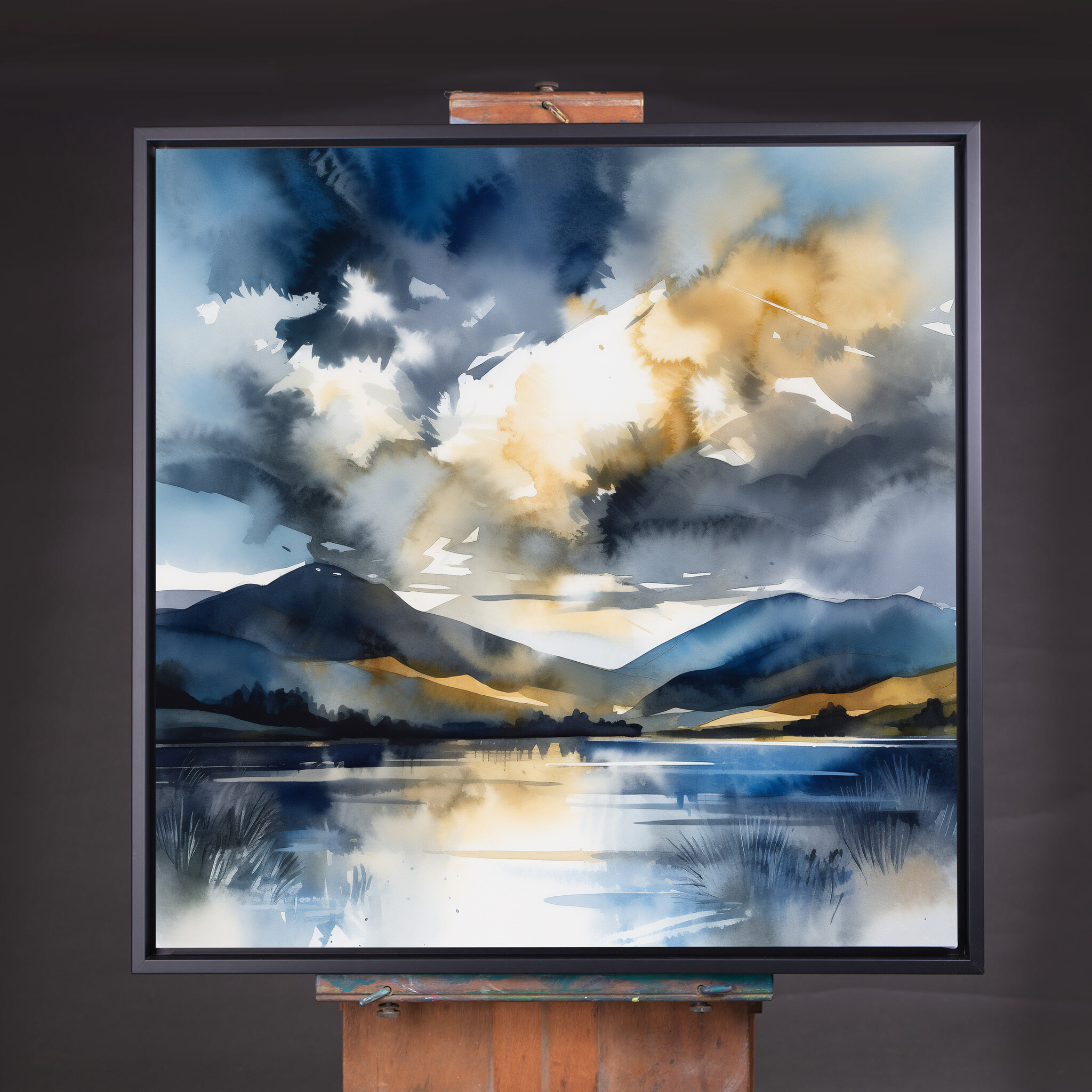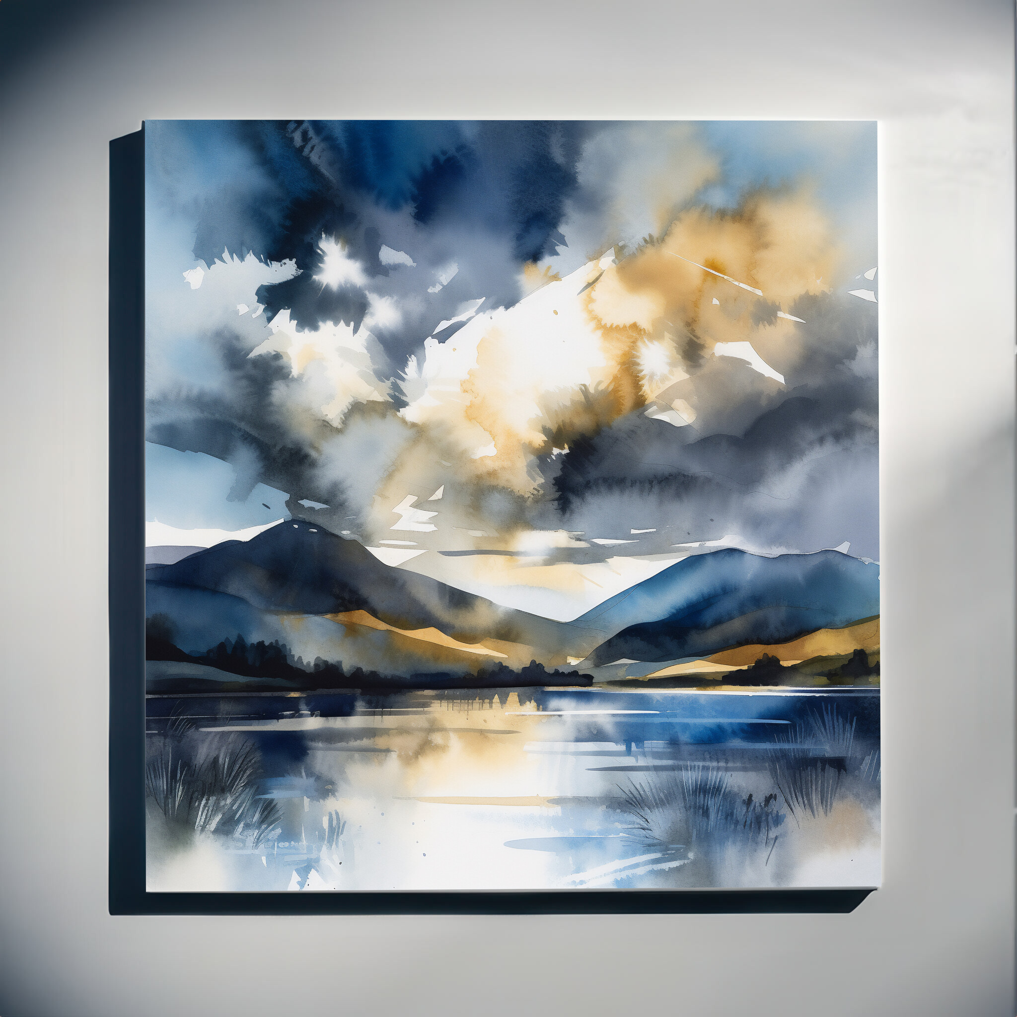 This impressionist artwork captures the serene beauty of the Lake District, with its reflective waters and majestic hills enveloped in blue tones and subtle gold accents. The calm essence is beautifully translated through an impressionist style that brings a touch of tranquility to any space.