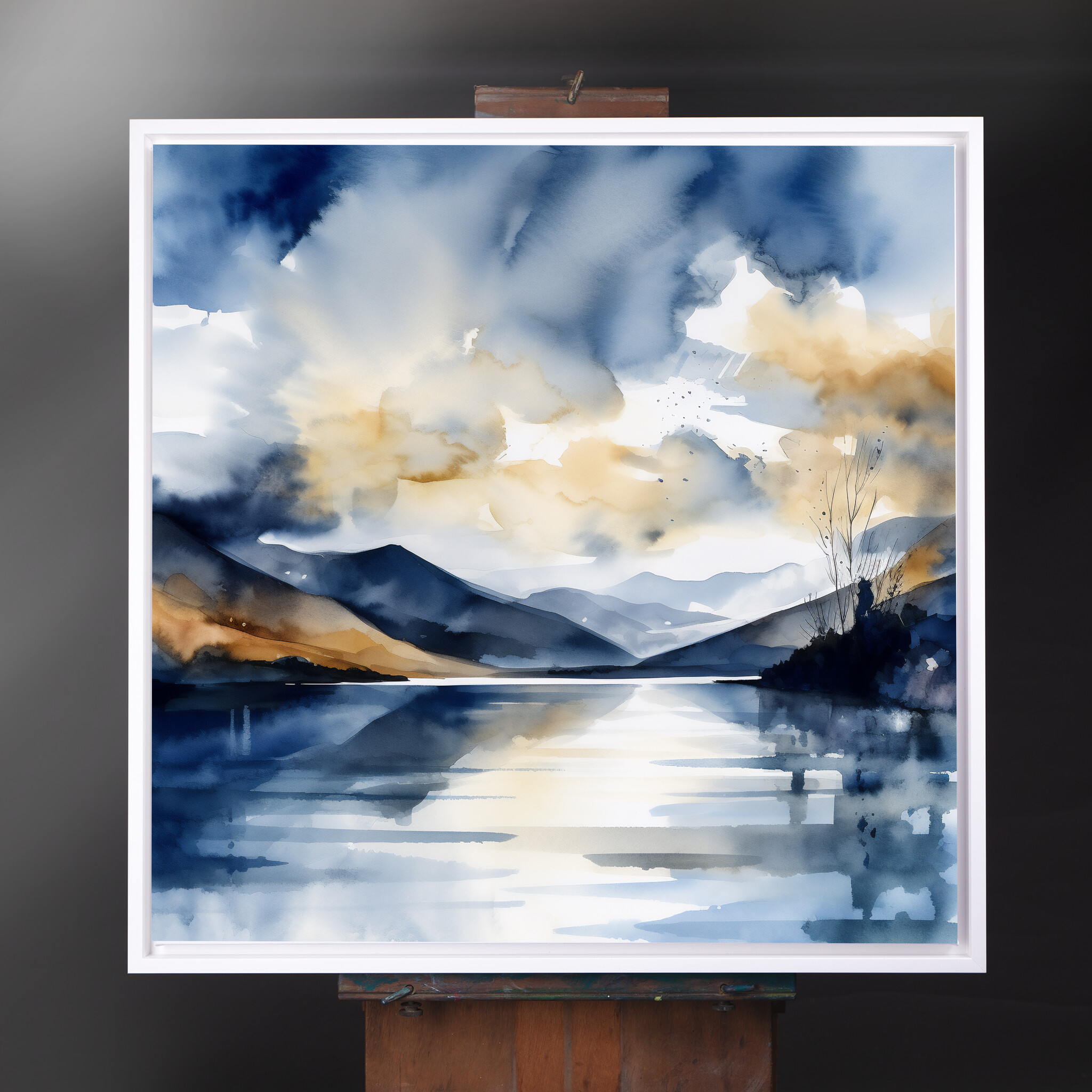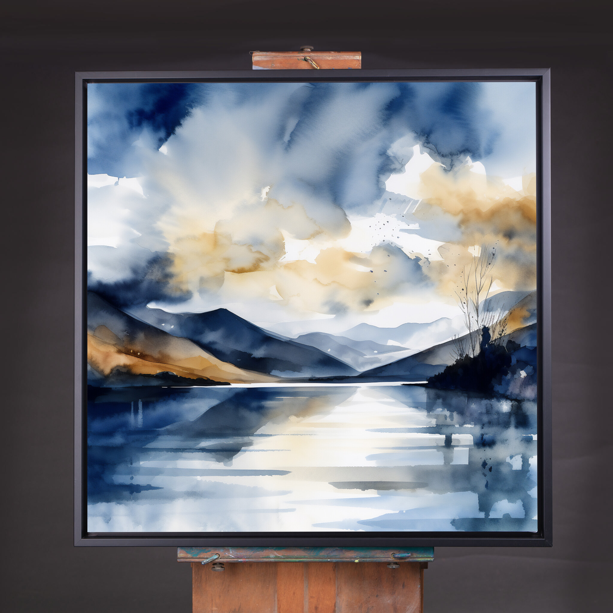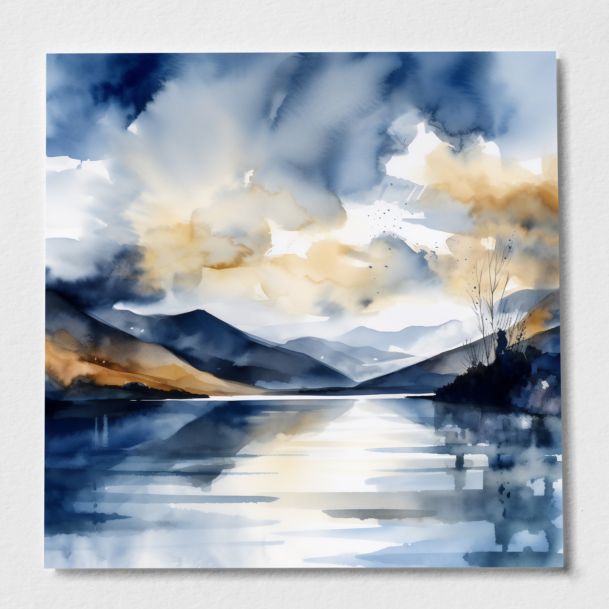 This stunning watercolor painting captures the tranquil beauty of the Lake District, depicting a serene landscape with rolling hills and a reflective lake. With a predominant blue palette accented by warm tones, this artwork blends the impressionist style with a modern flair, bringing a soothing ambiance to your space.