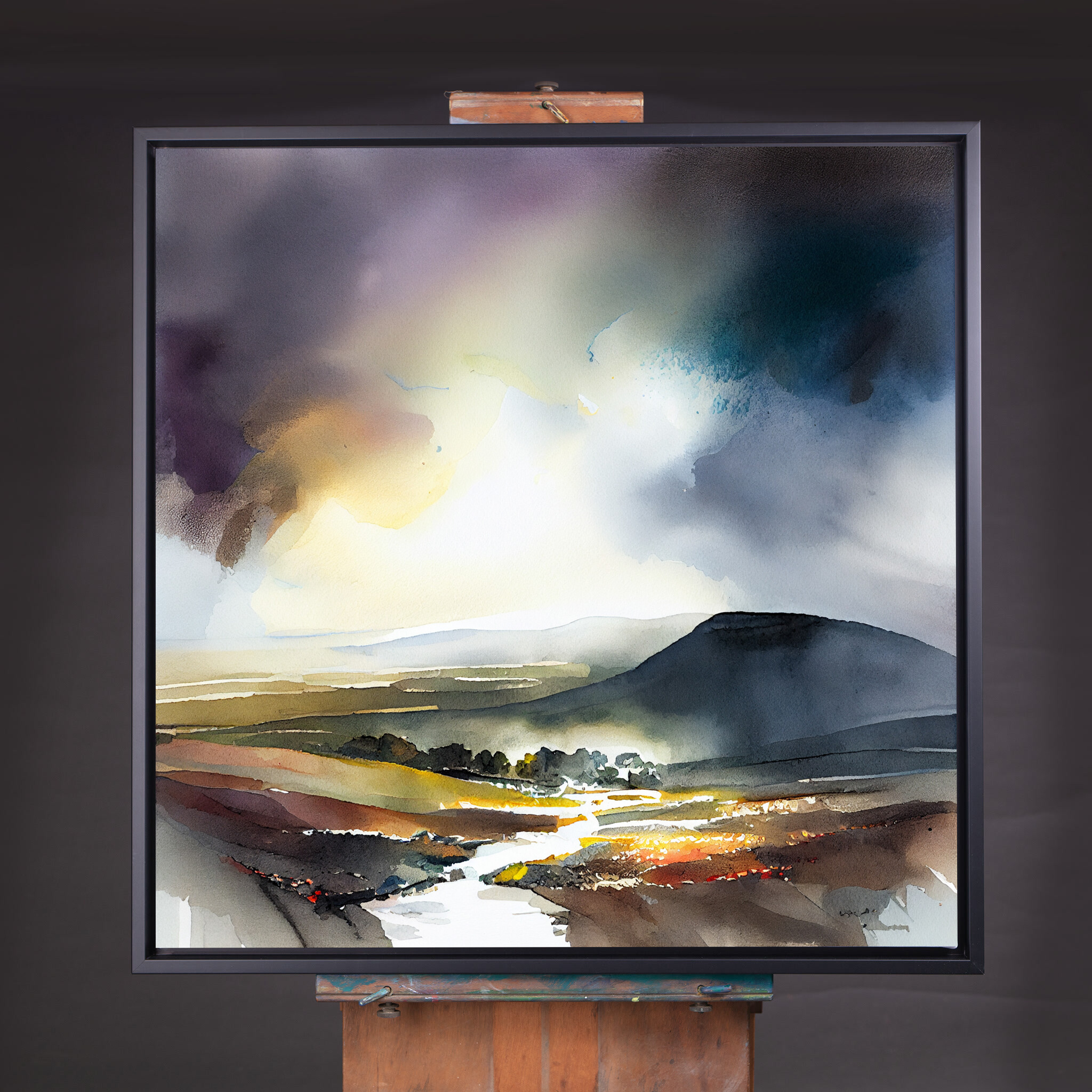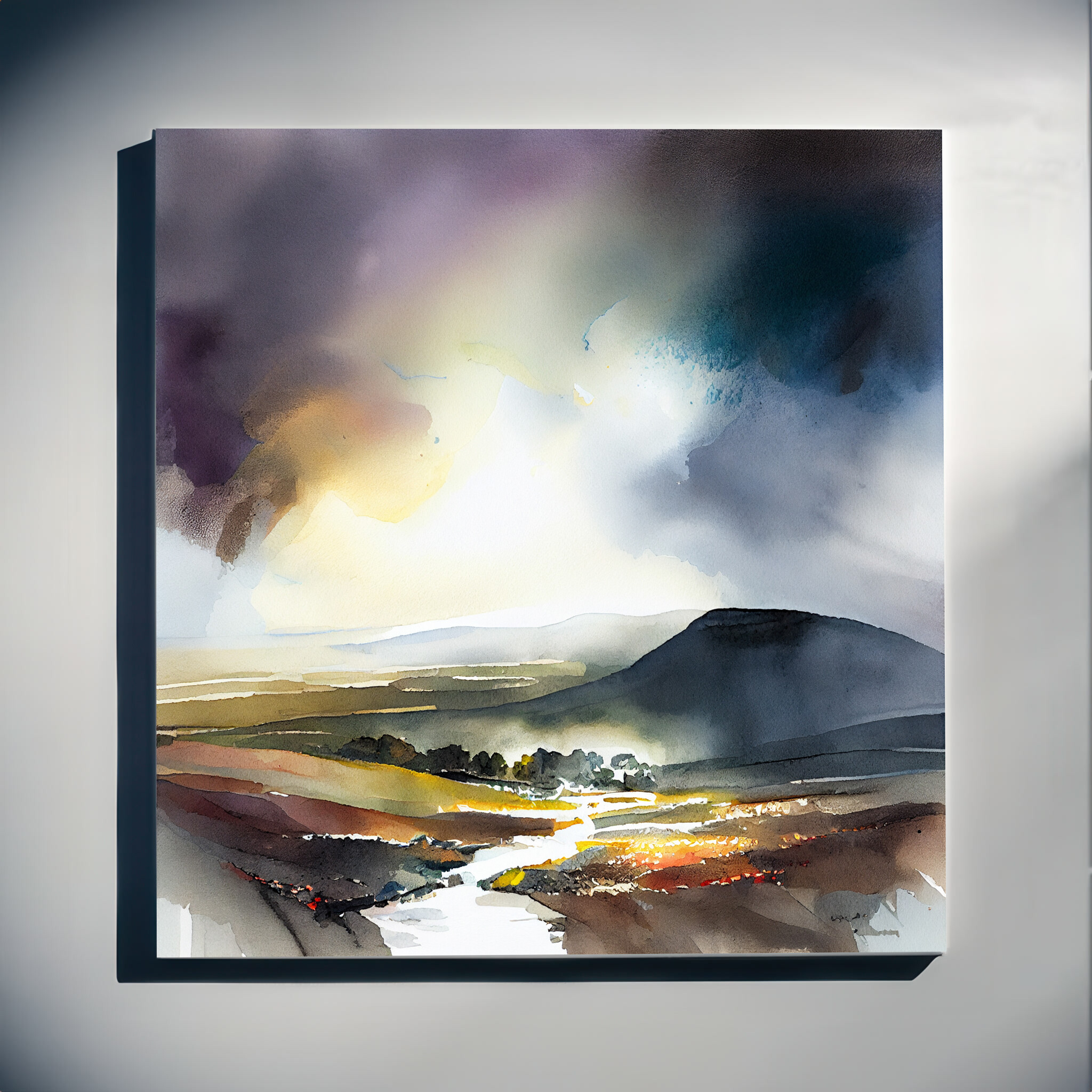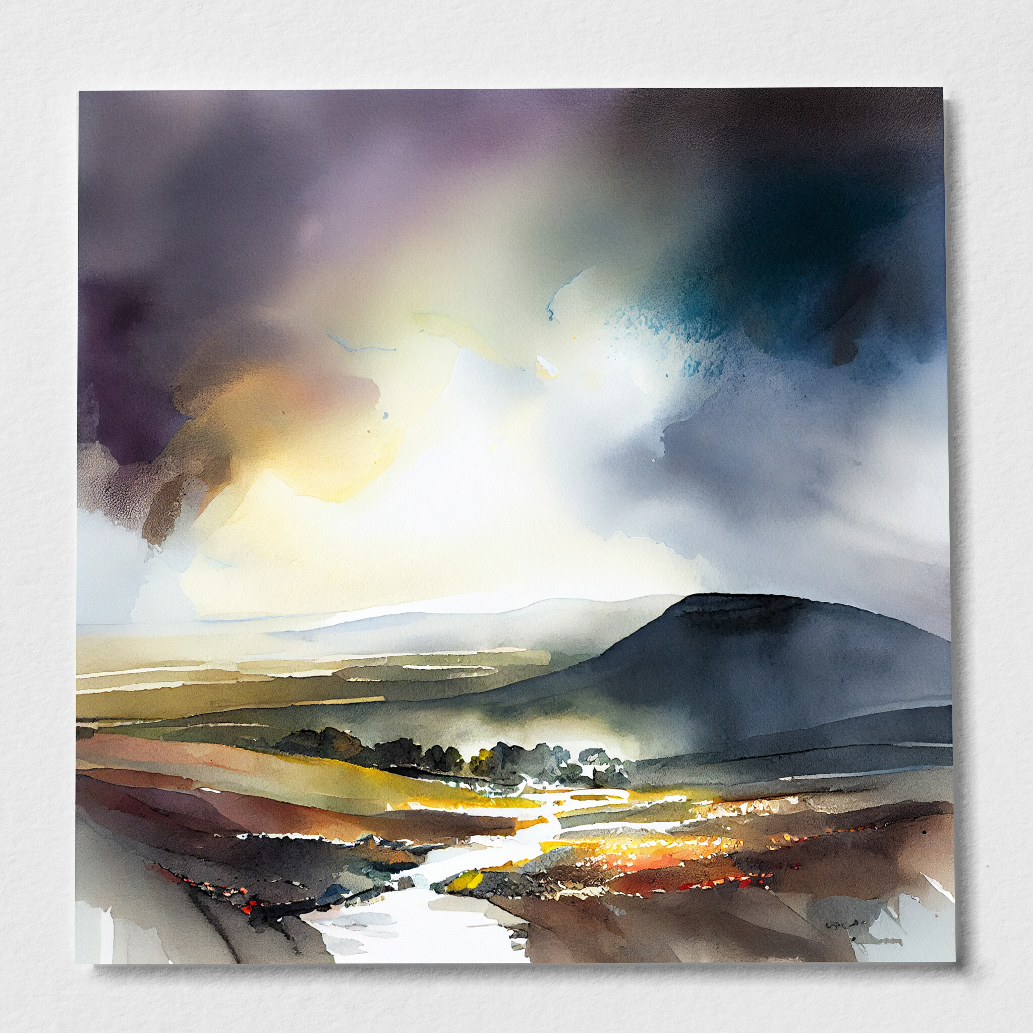 This captivating watercolour painting beautifully captures the enchanting landscape of the Lake District. With a mastery of warm tones and hints of purple, the scene invokes a tranquil mood, perfect for those who seek peace and serenity. The elegance of this piece lies in its ability to transport you to the heart of nature, with rolling hills and a dreamy sky.