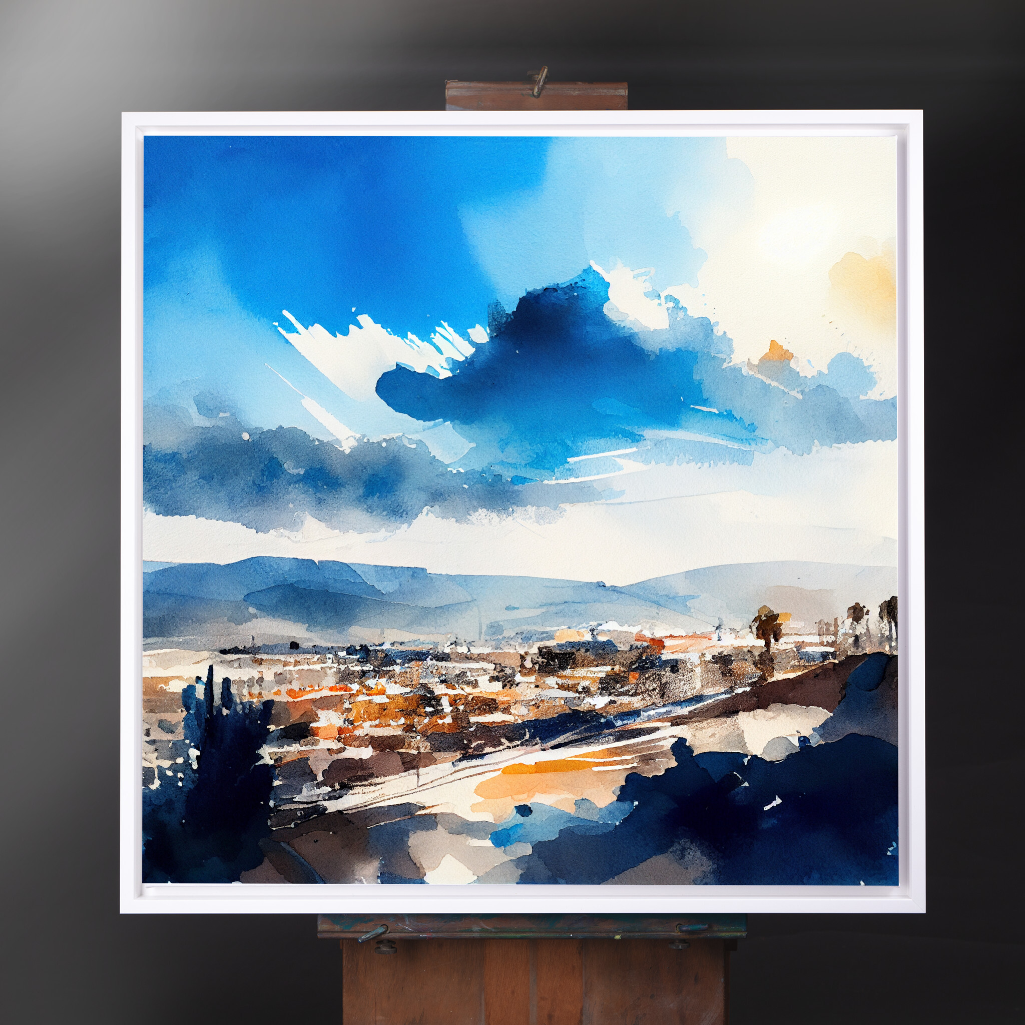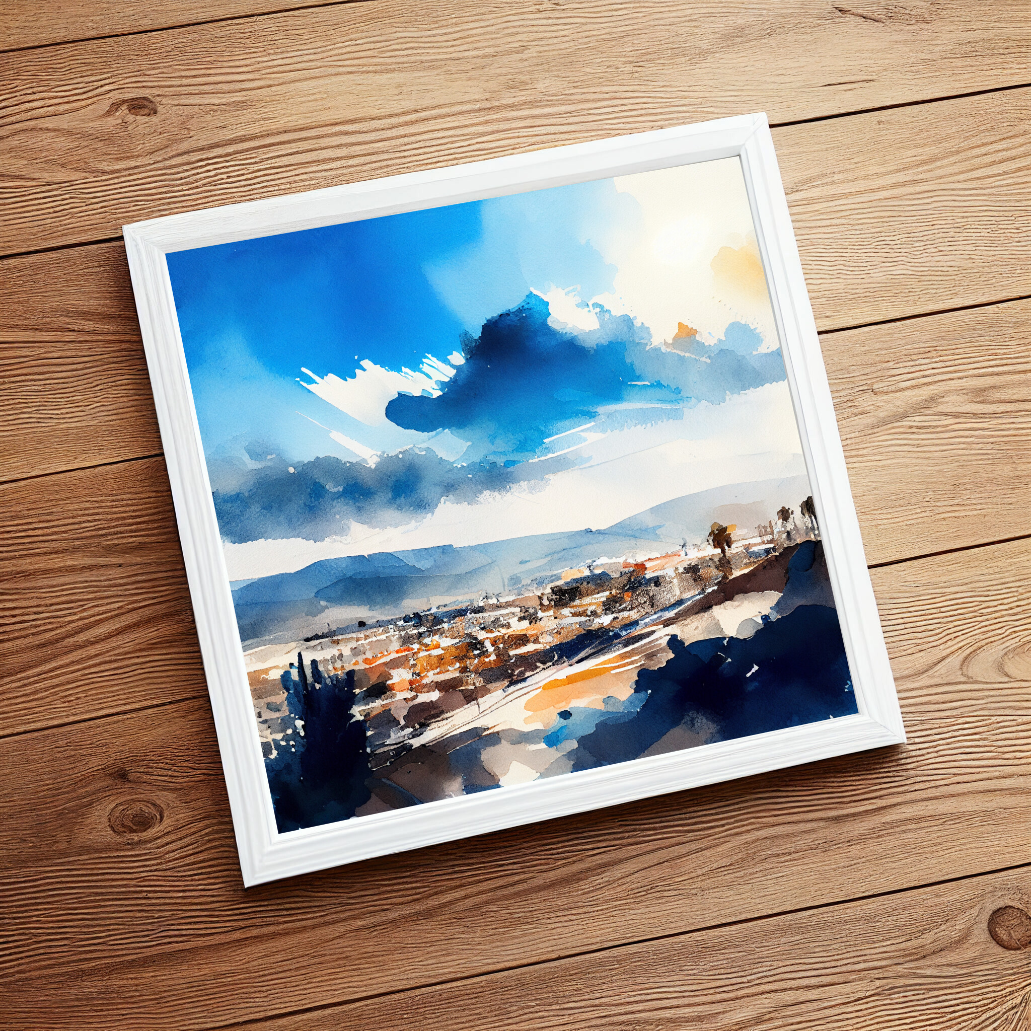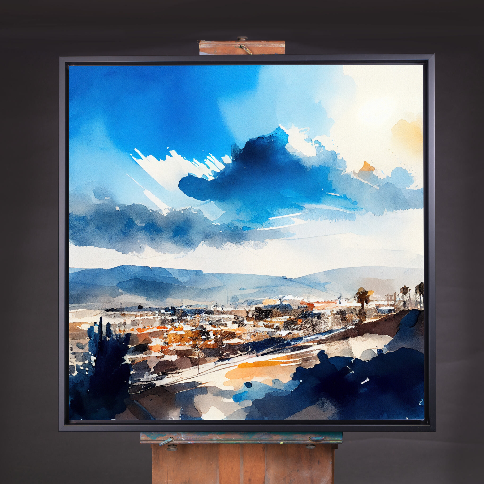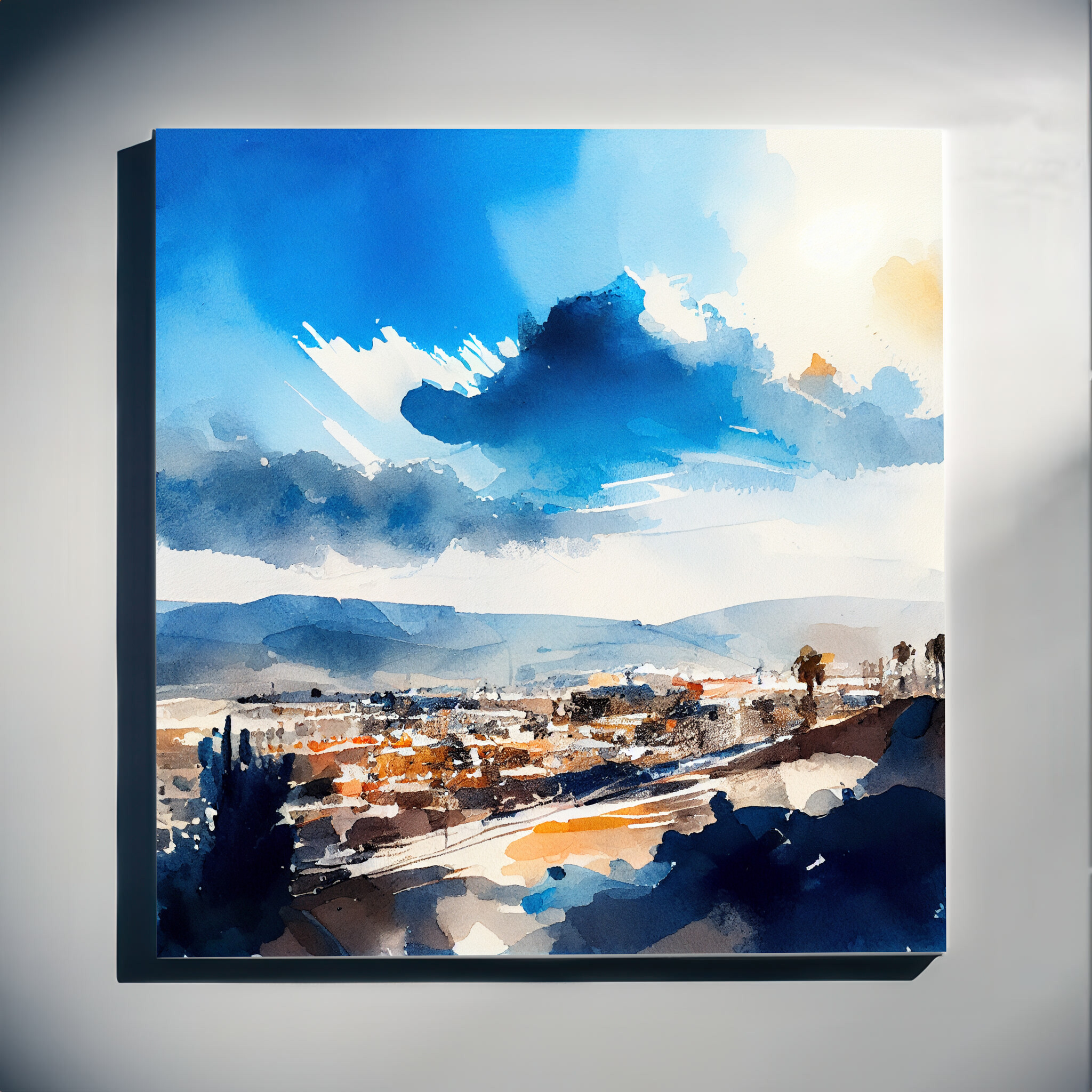 This captivating watercolor artwork beautifully portrays the dynamic landscape of Los Angeles, with its striking blue hues and subtle warm tones. The abstract cloud formations and bustling urban scene create a lively, inviting atmosphere. Perfectly blending elements of nature with metropolitan charm, this piece embodies a unique artistic style, reflecting the vibrancy of the “City of Angels.”