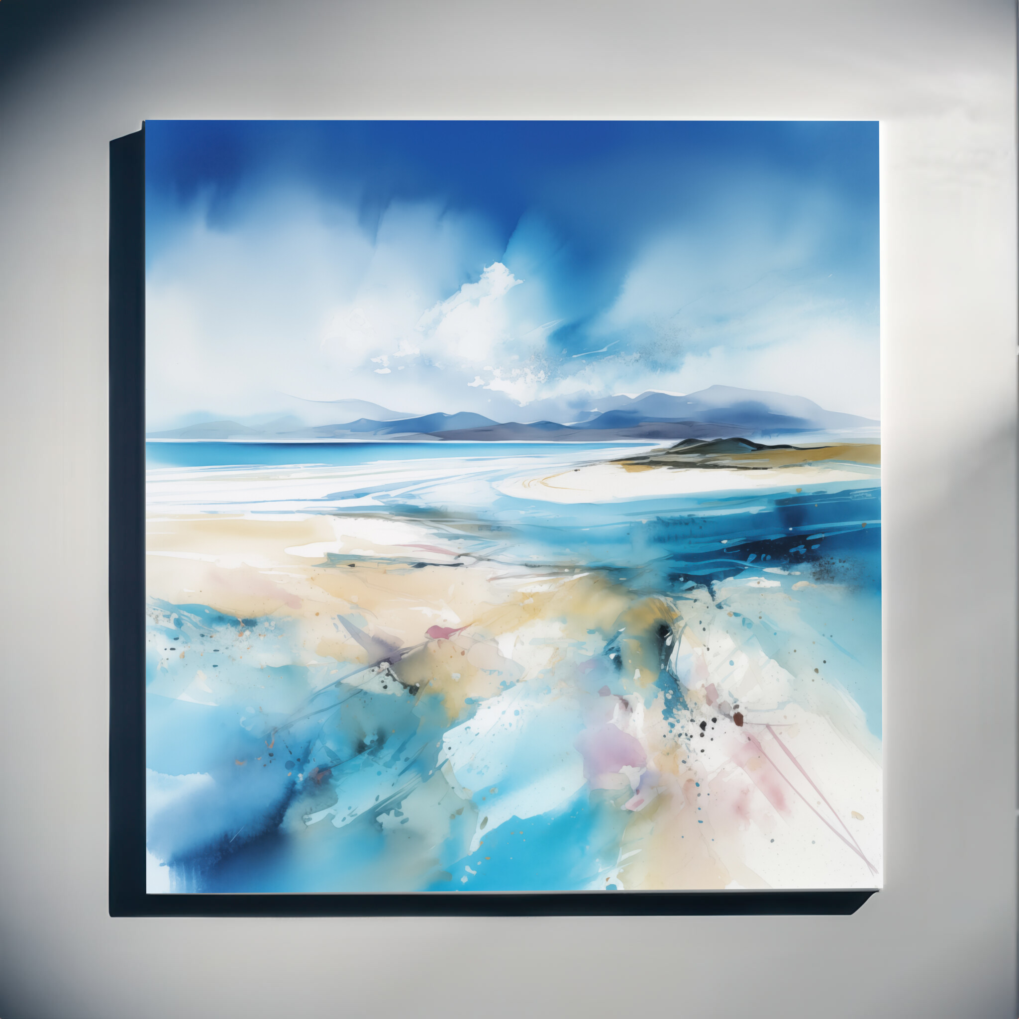This captivating abstract artwork beautifully captures the serene essence of the Luskenty coastal landscape. With predominant blue tones and gentle touches of earth tones, it evokes a sense of tranquillity and peace. The contemporary style and depiction of the ocean make it an exquisite addition to your home decor.