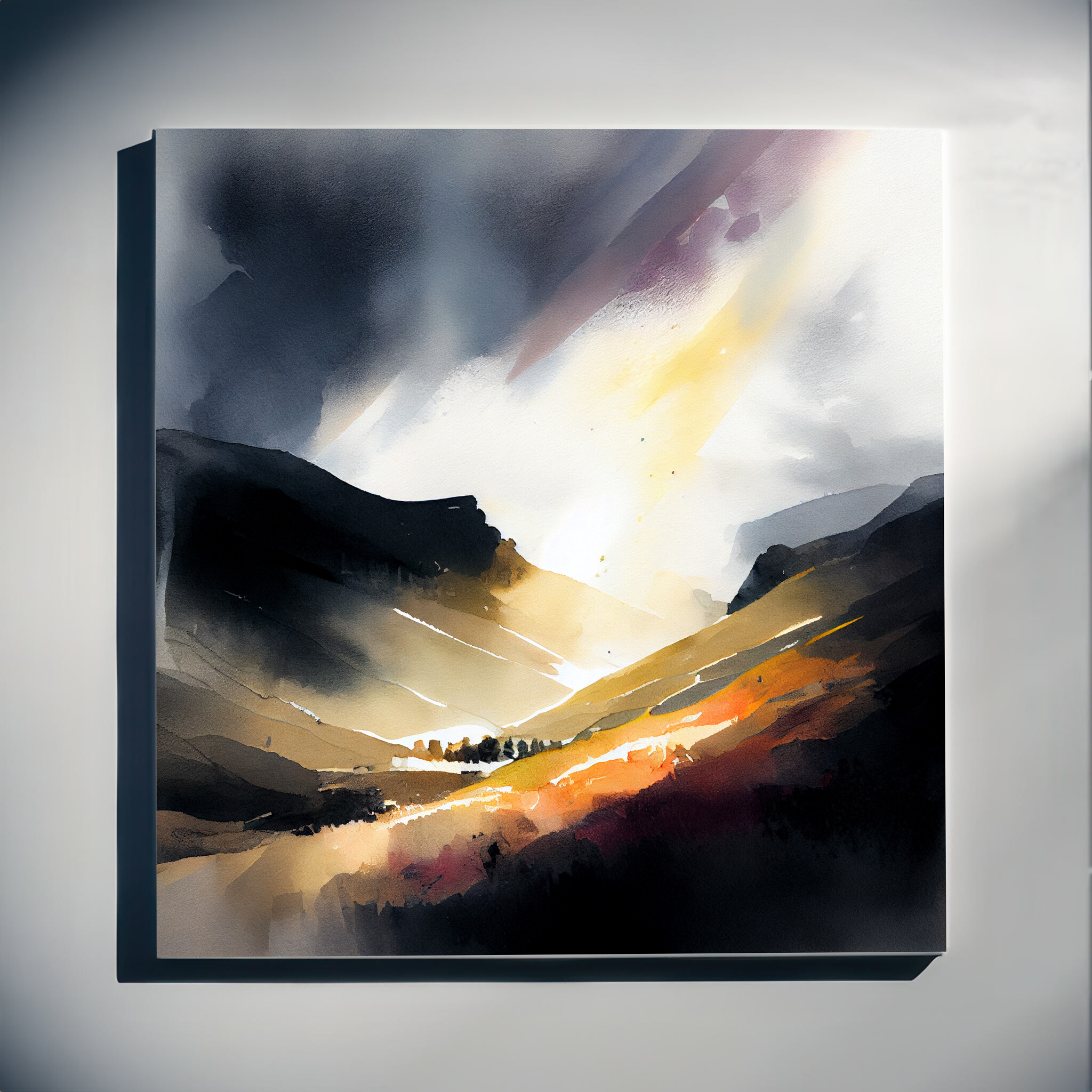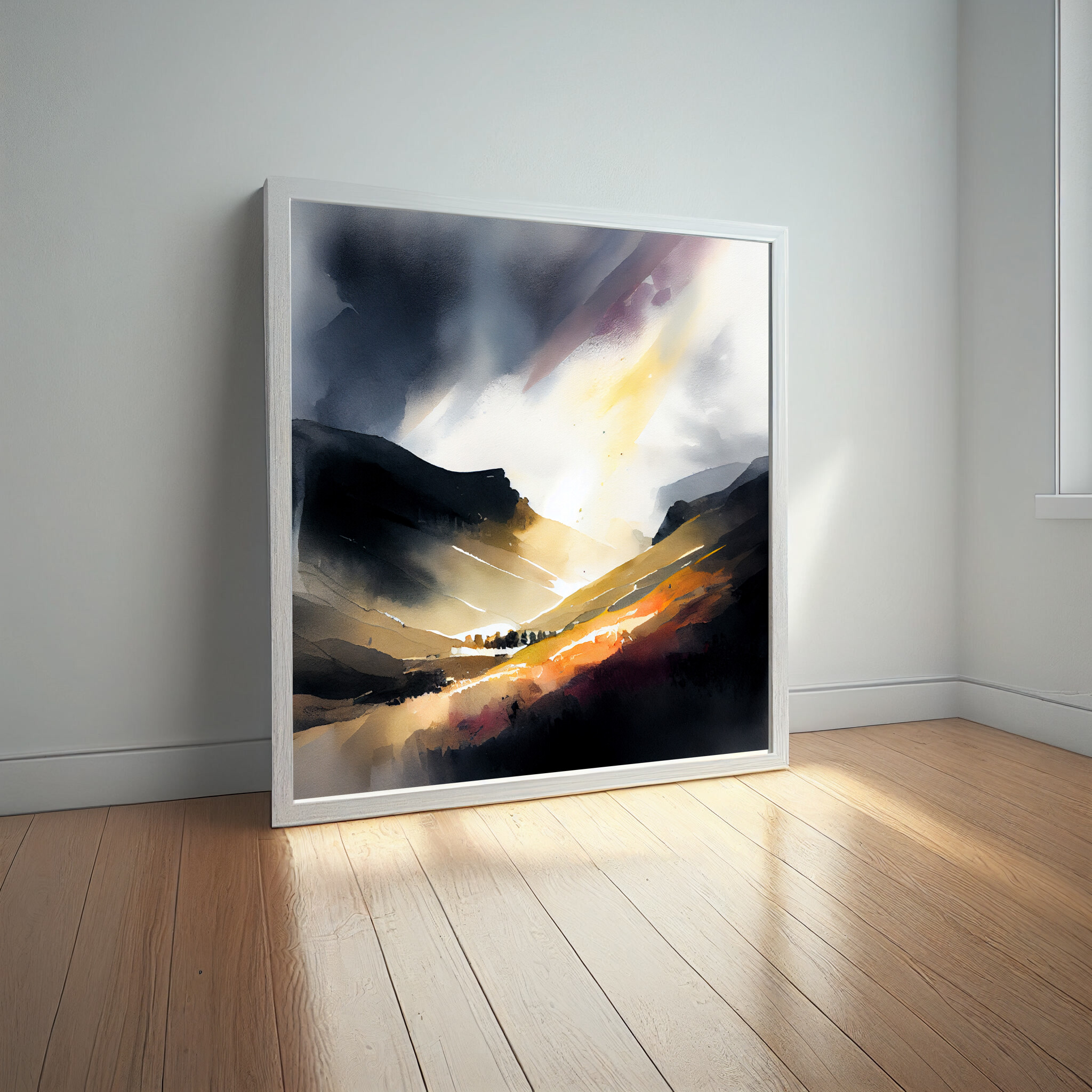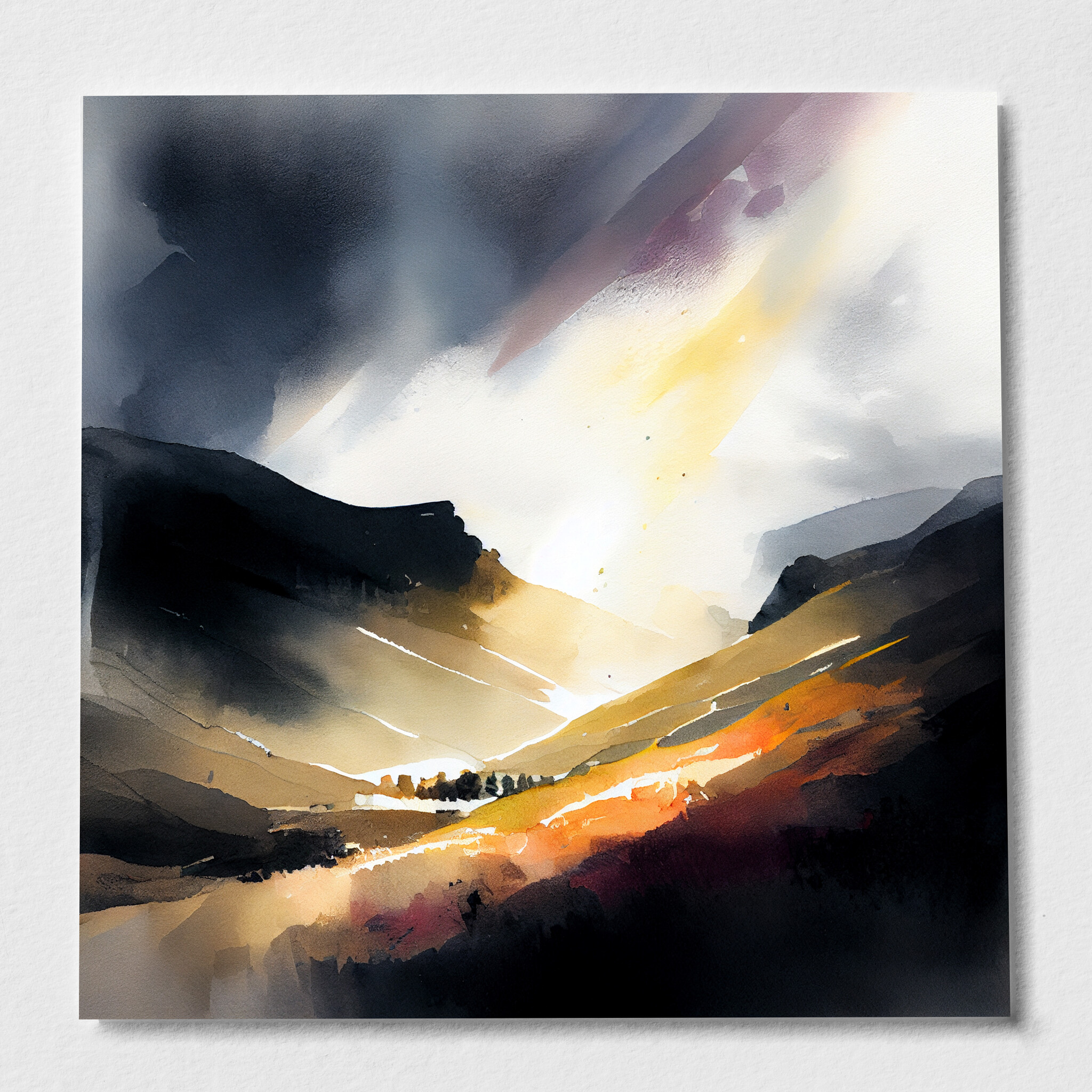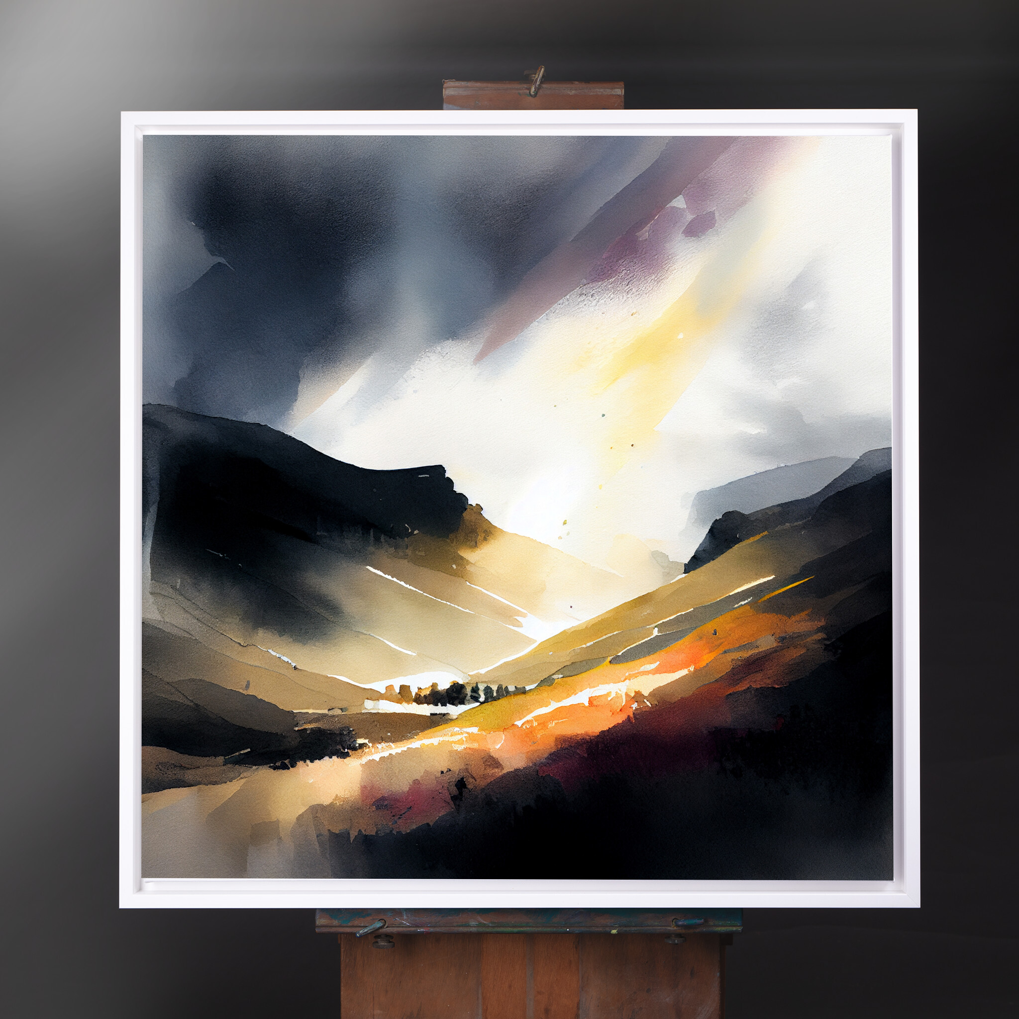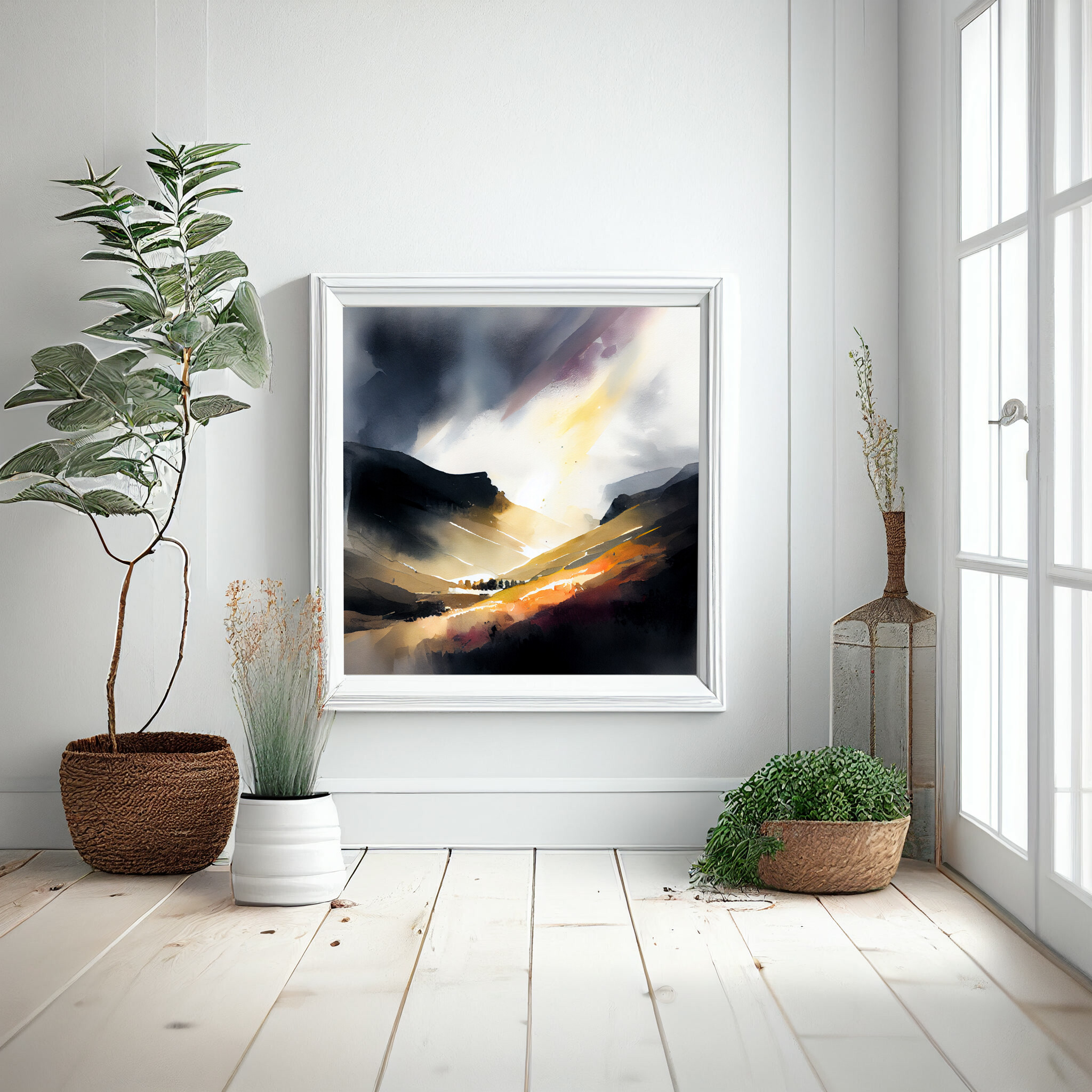 Experience the breathtaking beauty of the Peak District through this abstract landscape painting, featuring an exquisite blend of earth tones and warm hues. The rich, dynamic layers of colour create a sense of movement amidst the rugged mountain forms, capturing the very essence of nature’s dramatic beauty.