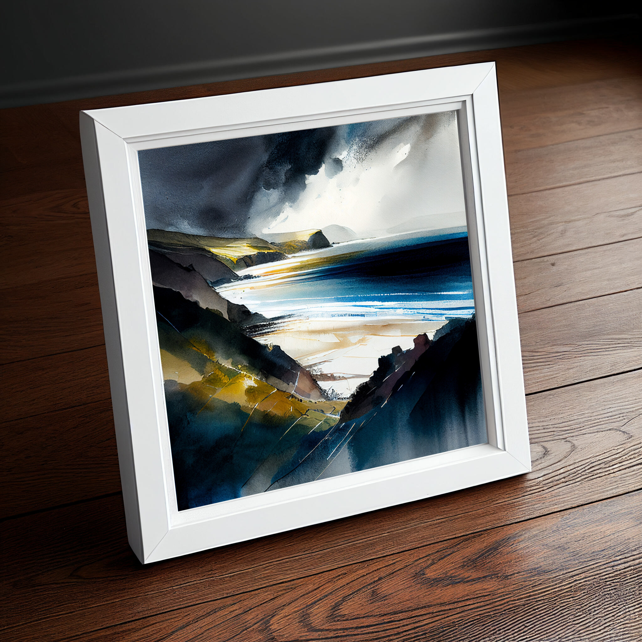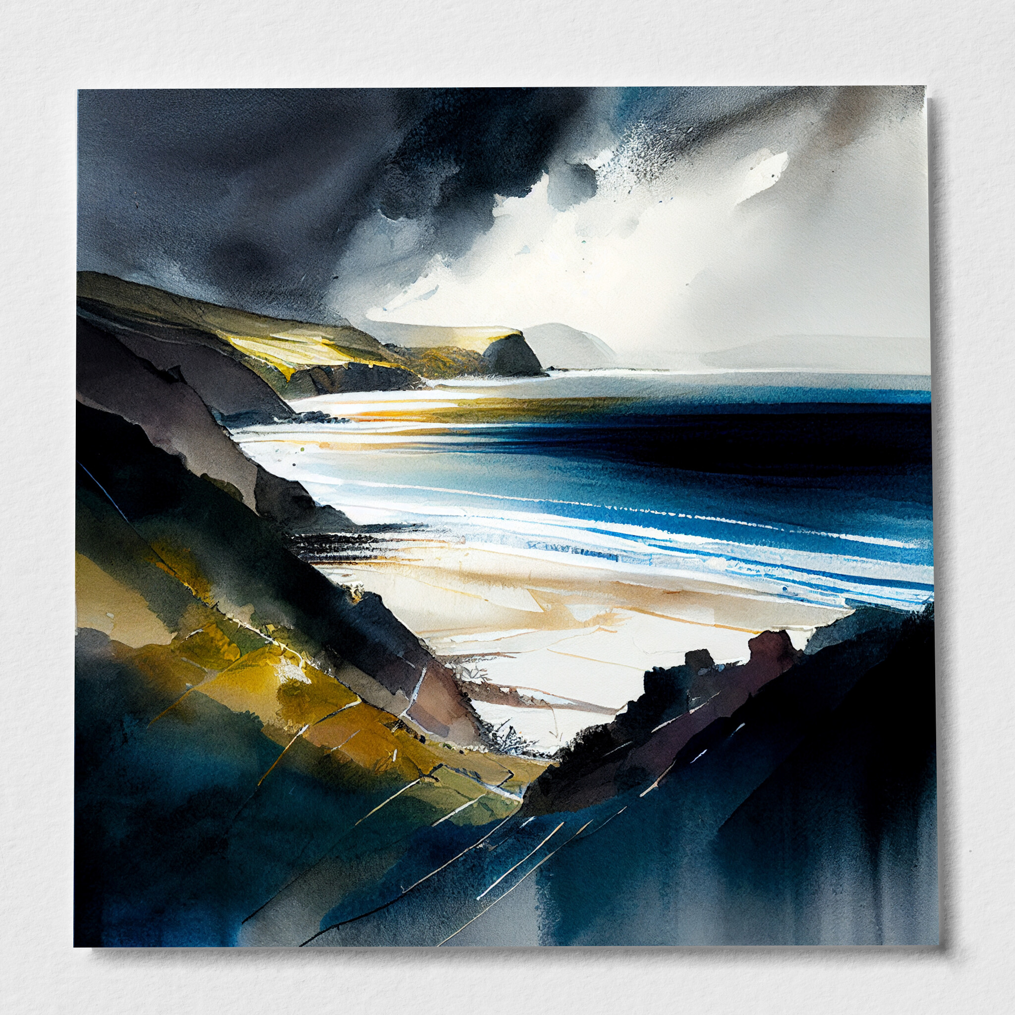 This stunning impressionist painting captures the dynamic beauty of the Pembrokeshire coast, featuring vivid blues that mirror the ocean’s depth and complement the coastal landscape. The dramatic use of light and shadow enhances the artwork’s atmospheric quality, making it an eye-catching piece of wall art perfect for any space.