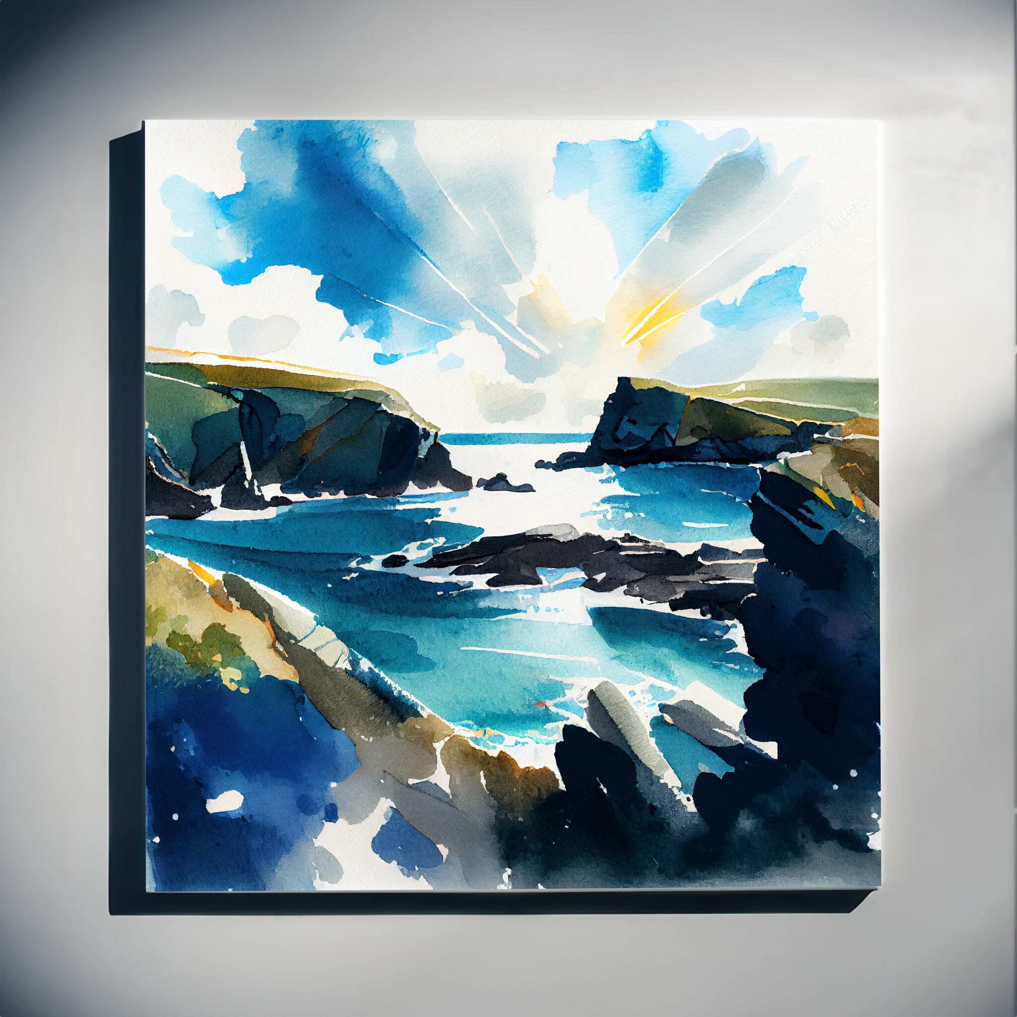 This stunning watercolor depicts the serene coastline of Pembrokeshire, capturing the essence of the sea with vibrant blues and abstract forms. The abstract style and coastal subject make it a captivating addition to any art collection. Perfect for adding a touch of tranquility to your living room or as a unique office art piece, this artwork breathes life into any space.