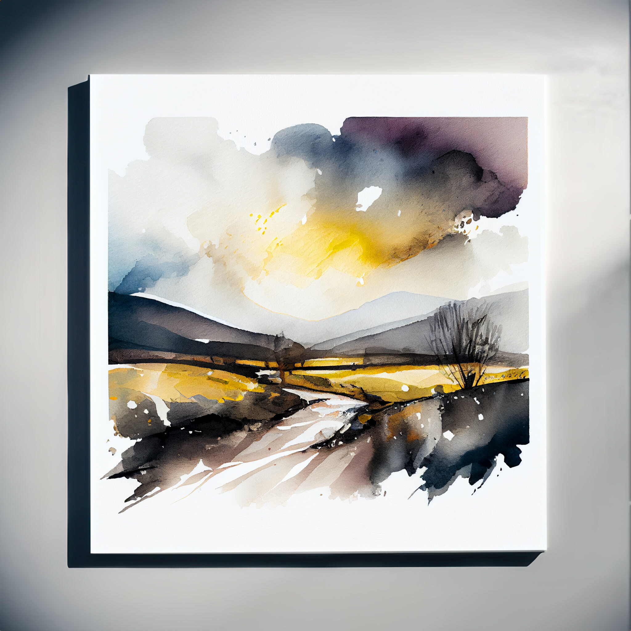 This captivating watercolor of the Ribble Valley captures the serene beauty of a sunset landscape in minimalist style. The artwork elegantly blends dramatic yellow tones against calming grey hues, creating an exquisite piece of wall art that evokes tranquility and elegance.