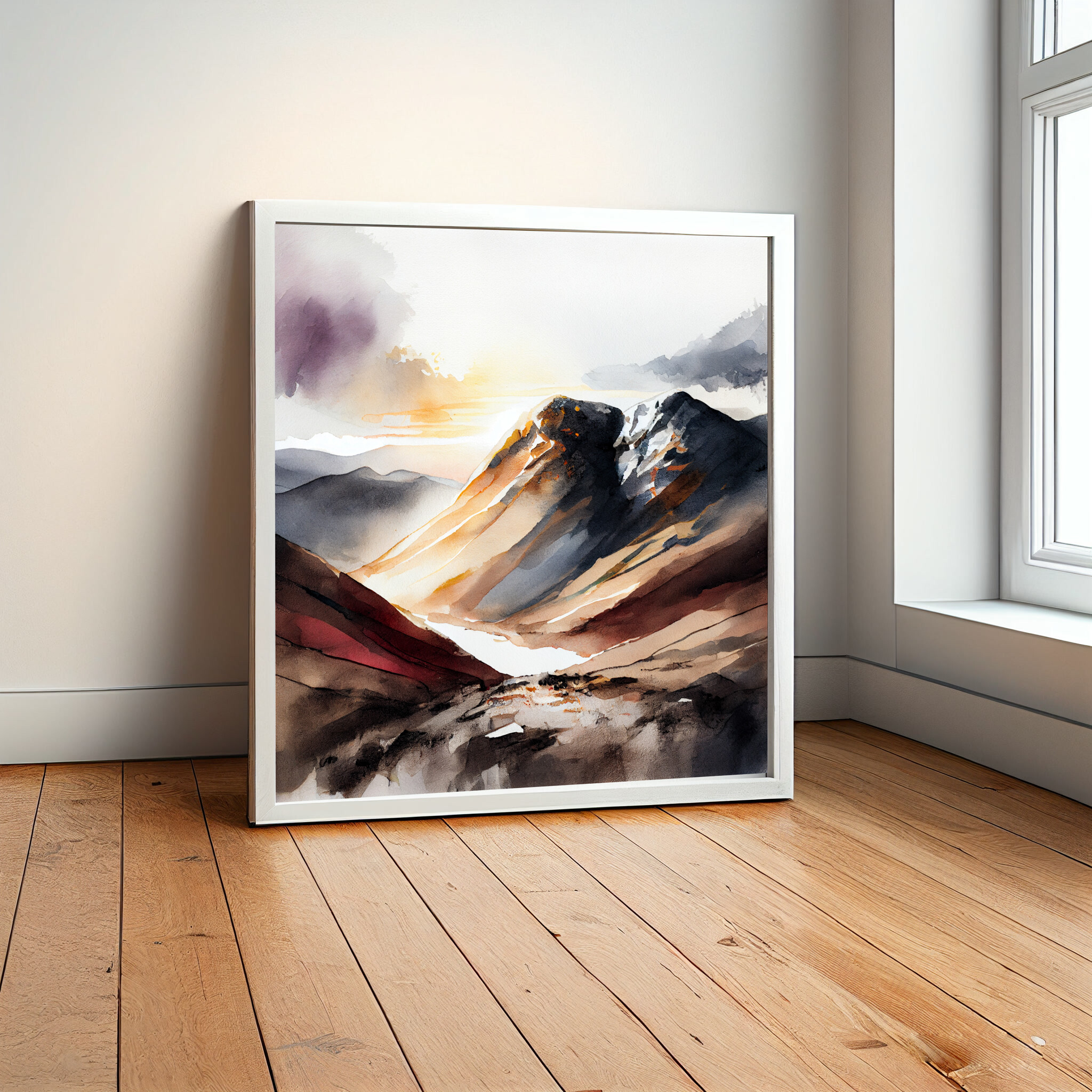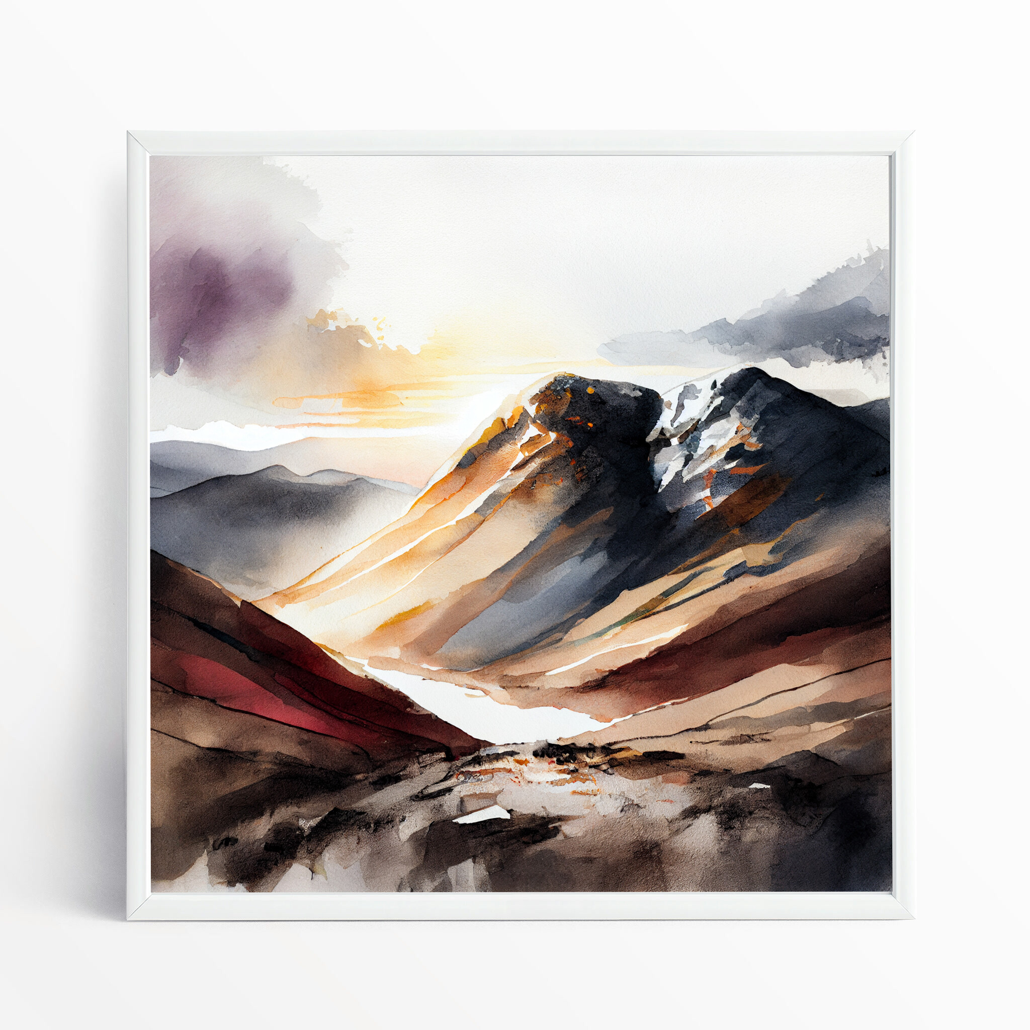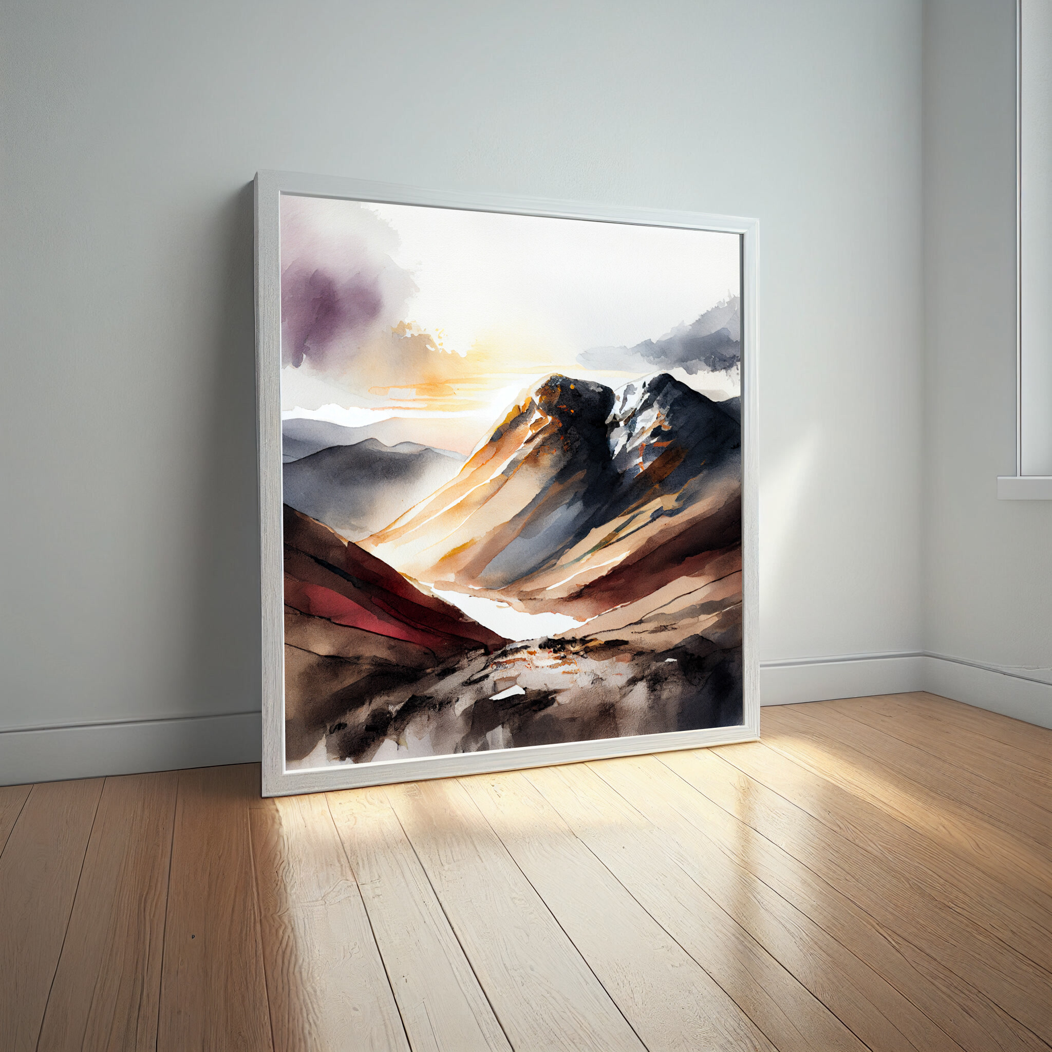 This captivating watercolor artwork portrays the majestic Scafell Pike, rendered in soothing earth tones that capture the essence of the mountainous landscape. The delicate brushwork and soft hues create a serene atmosphere, perfect for any living room or office space.