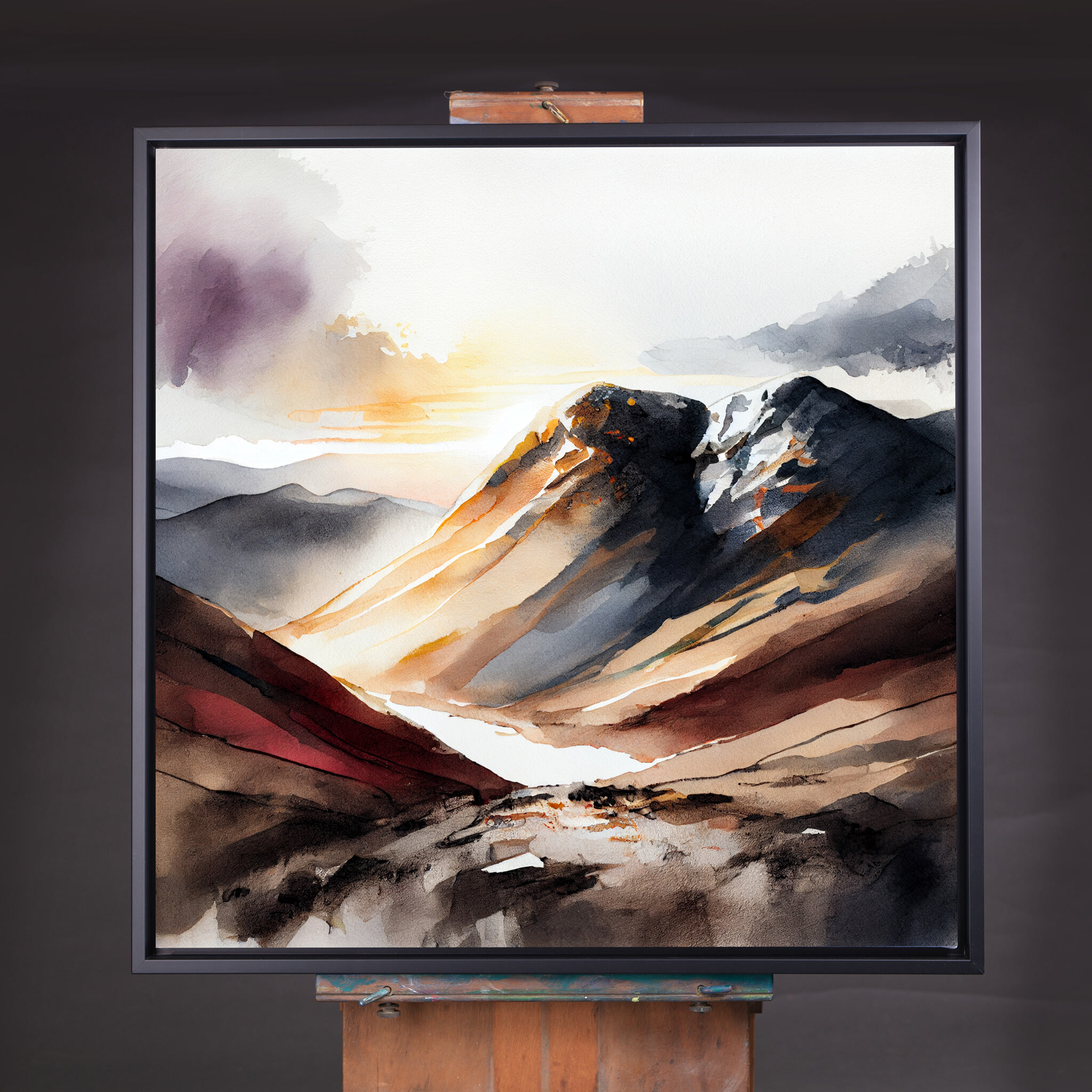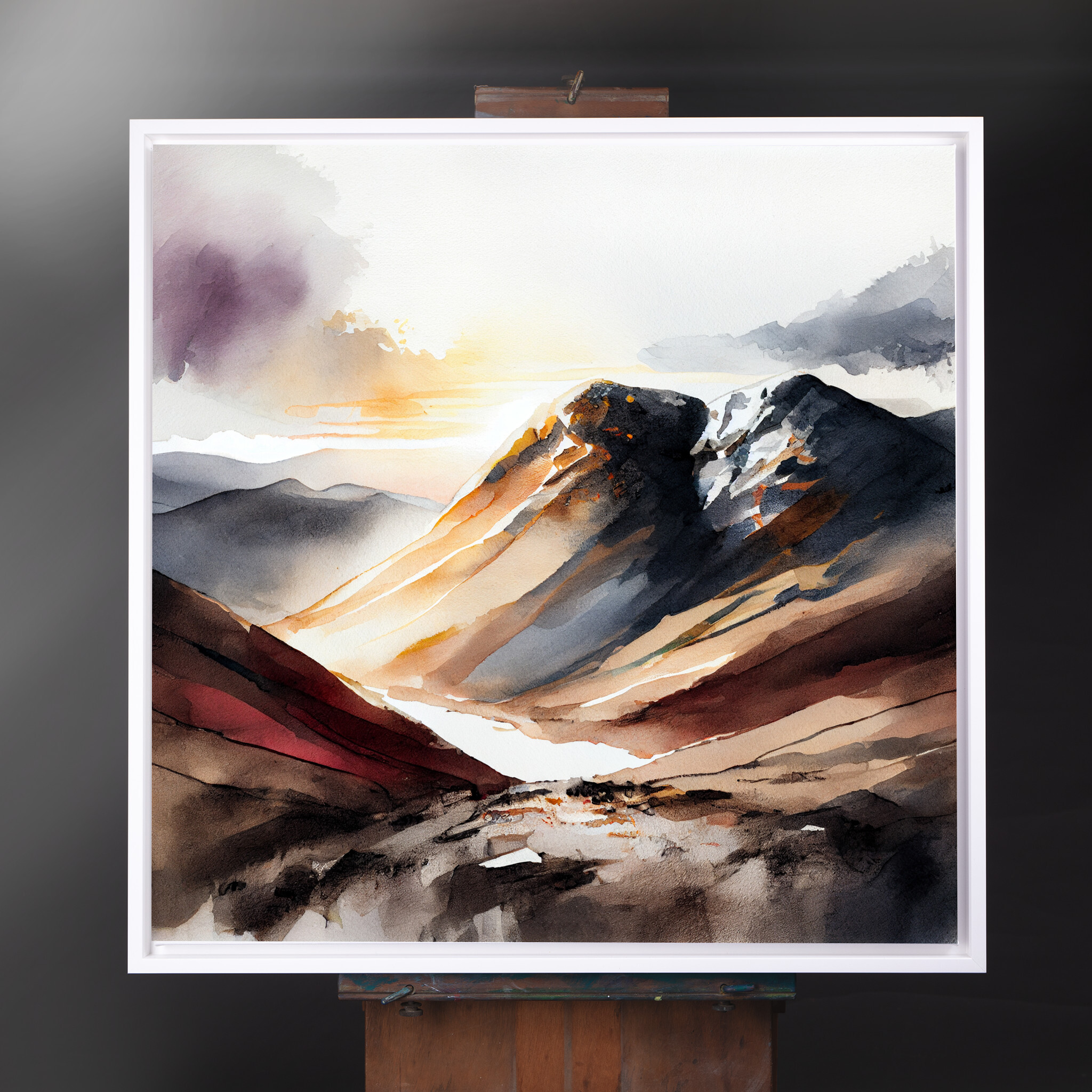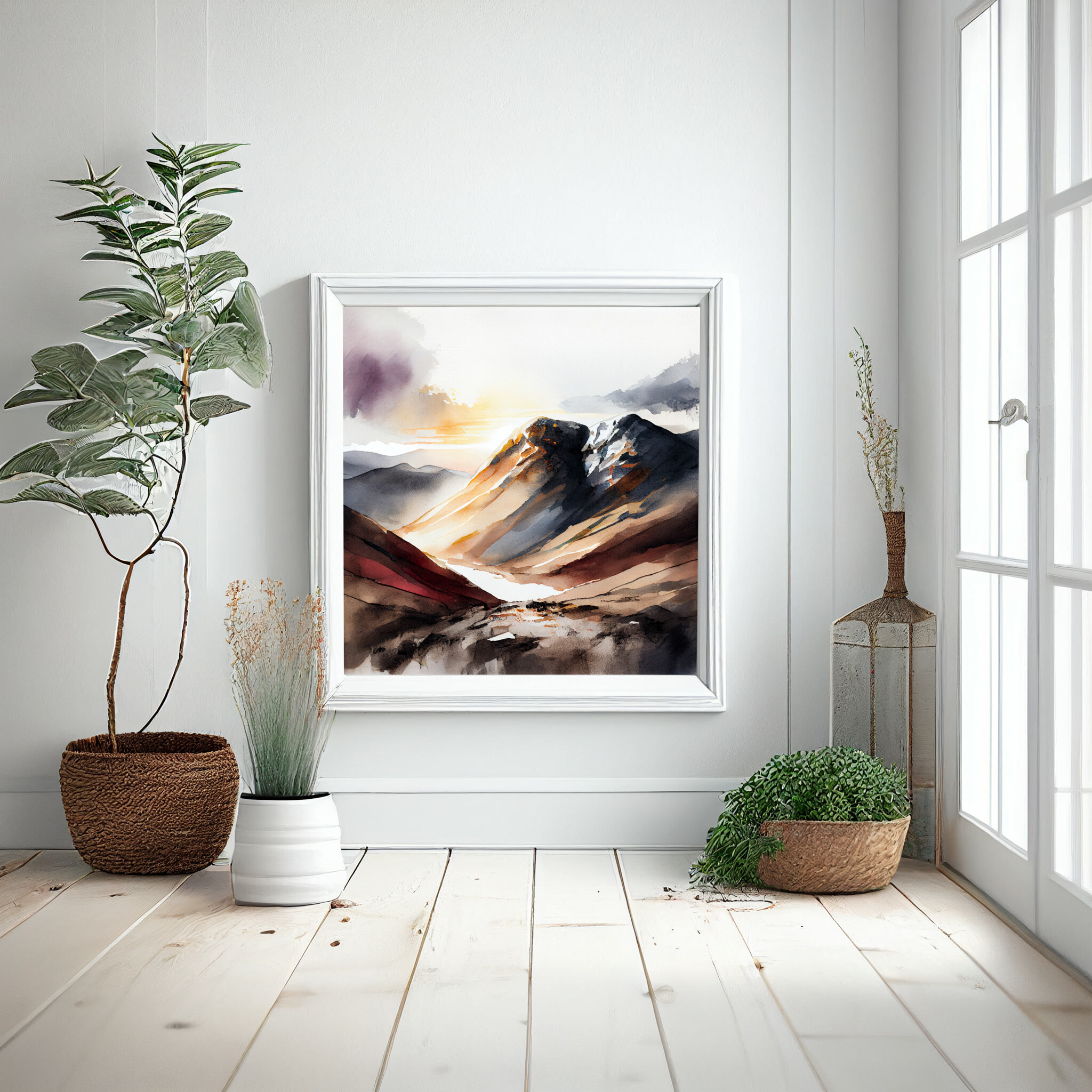 This captivating watercolor artwork portrays the majestic Scafell Pike, rendered in soothing earth tones that capture the essence of the mountainous landscape. The delicate brushwork and soft hues create a serene atmosphere, perfect for any living room or office space.