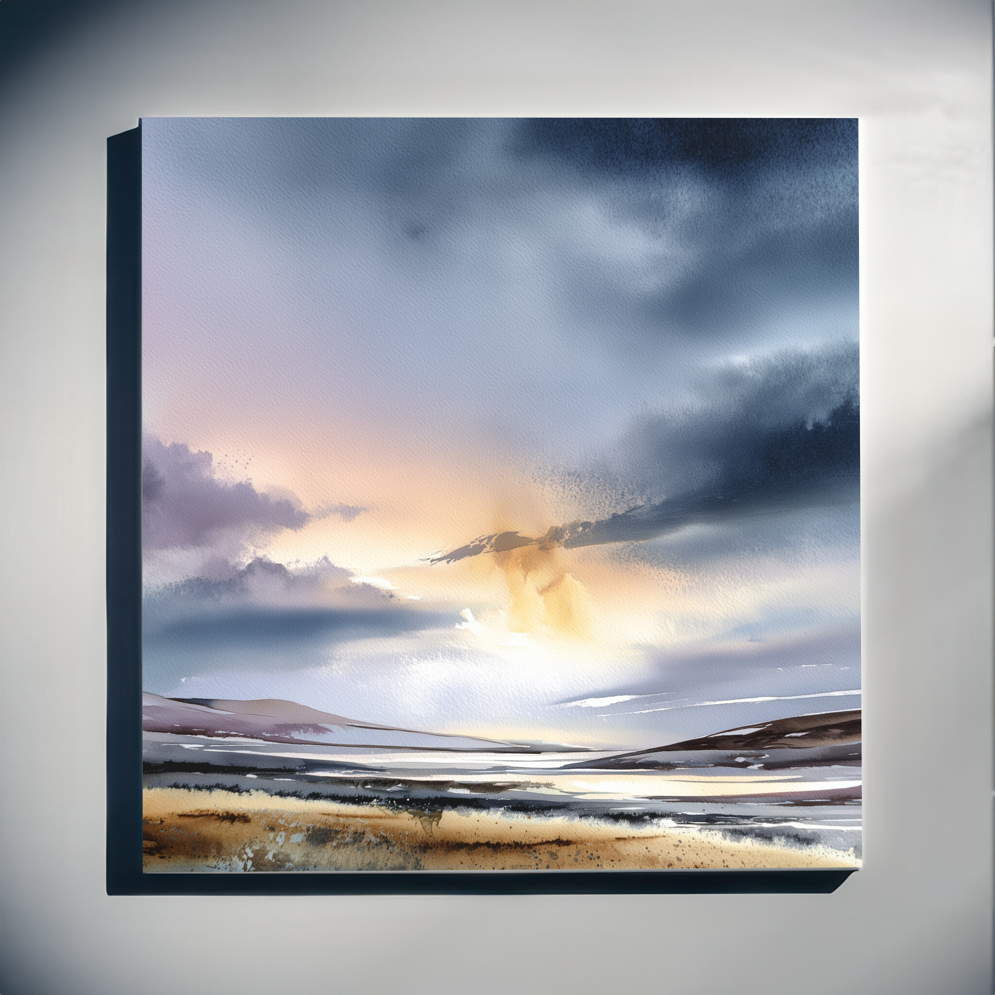 This exquisite artwork captures the ethereal beauty of the Scottish Highlands with a majestic blend of blue and gold accents. The abstract, impressionist style brings the landscape to life, evoking a sense of tranquillity and mystery.