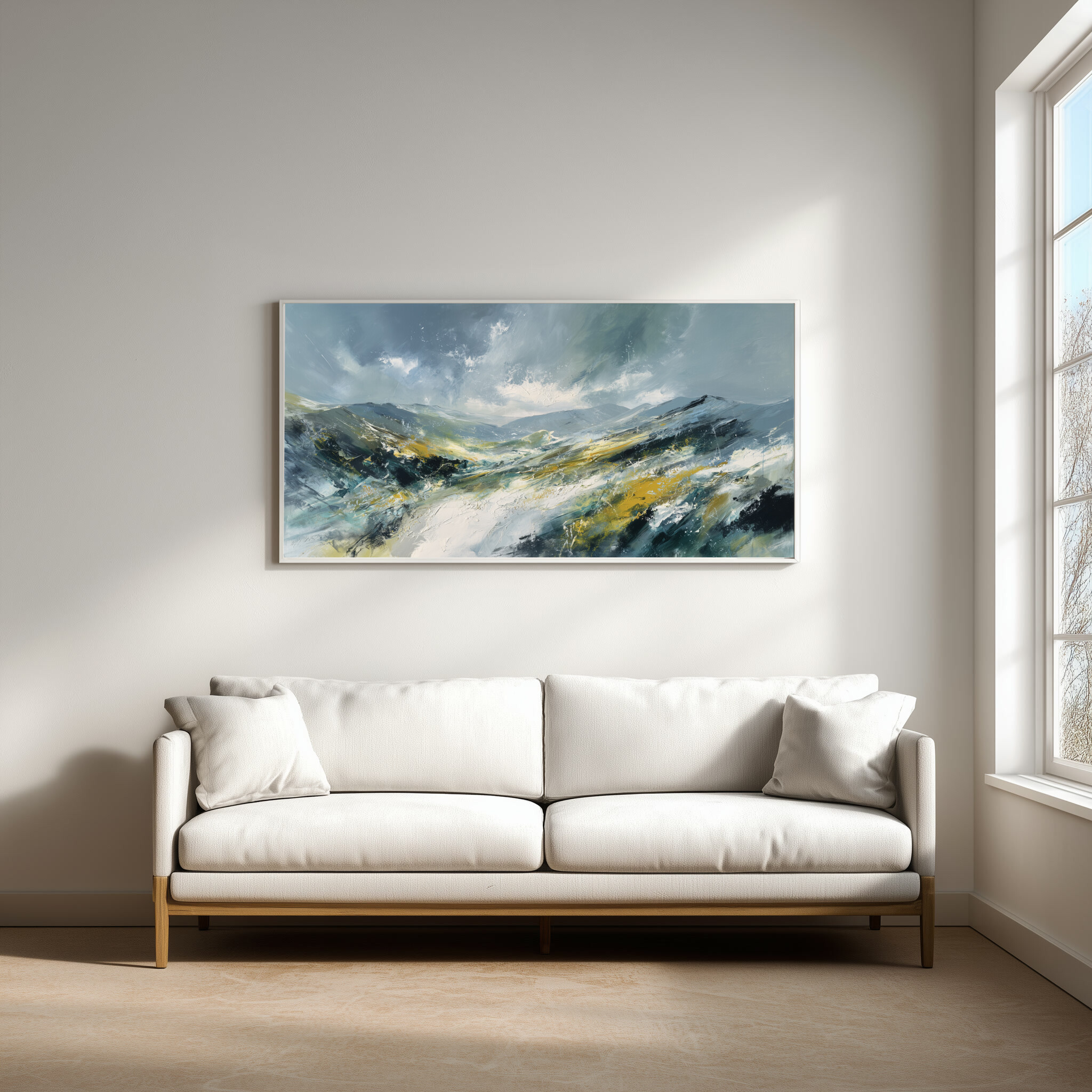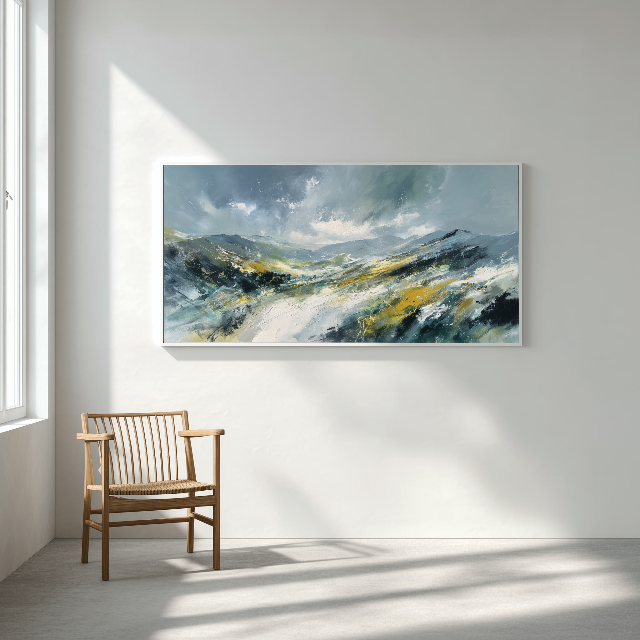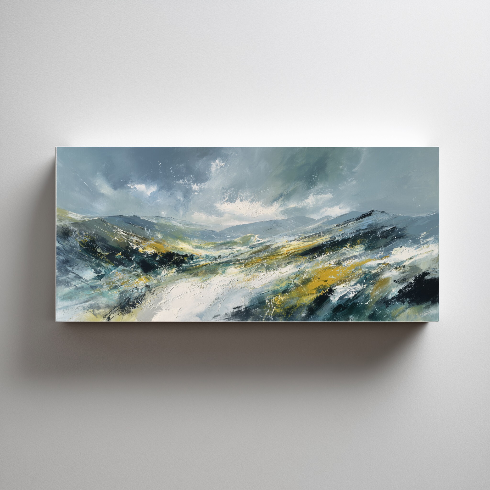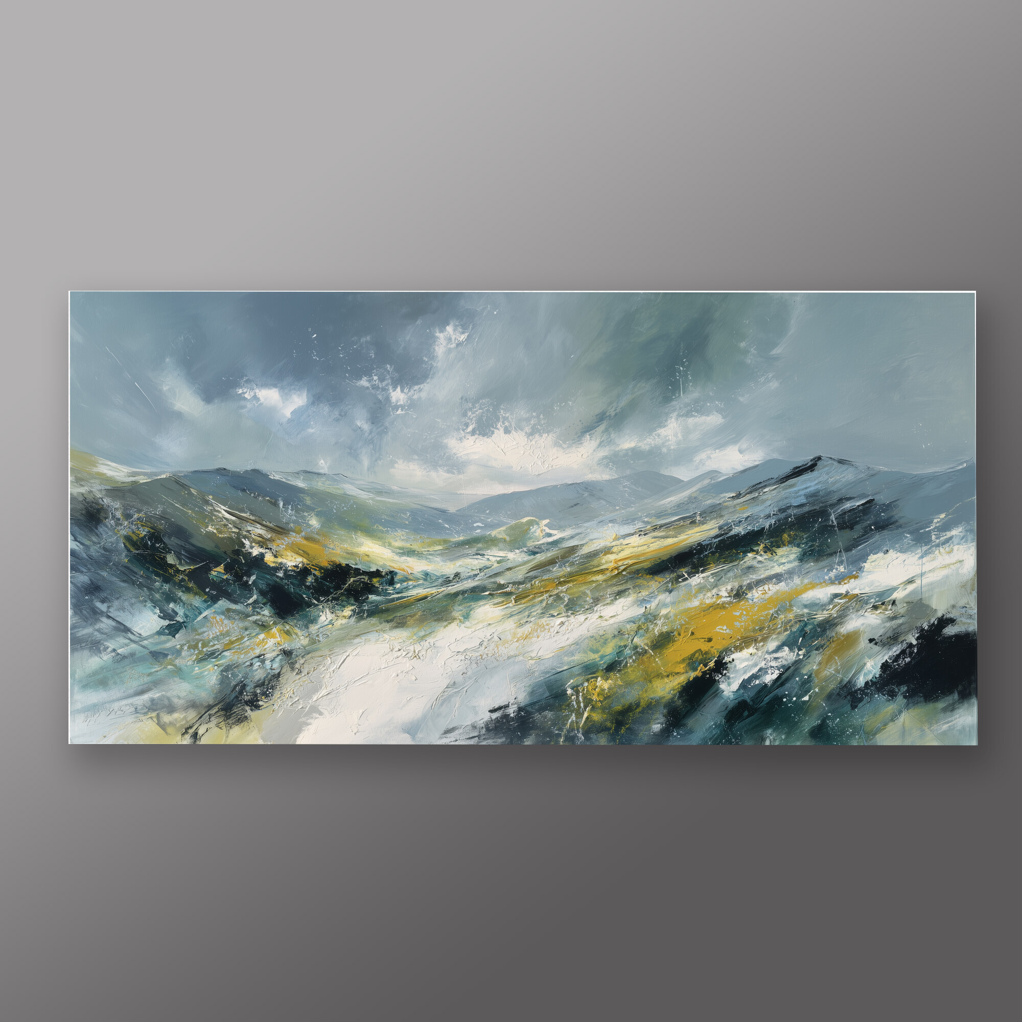Immerse yourself in the abstract beauty of the Scottish Highlands with this stunning piece. Dominated by soothing blue hues, the artwork captures the essence of highland landscapes in a modern style. The interplay of colour and form invites you to explore the depth of the scene with each glance.